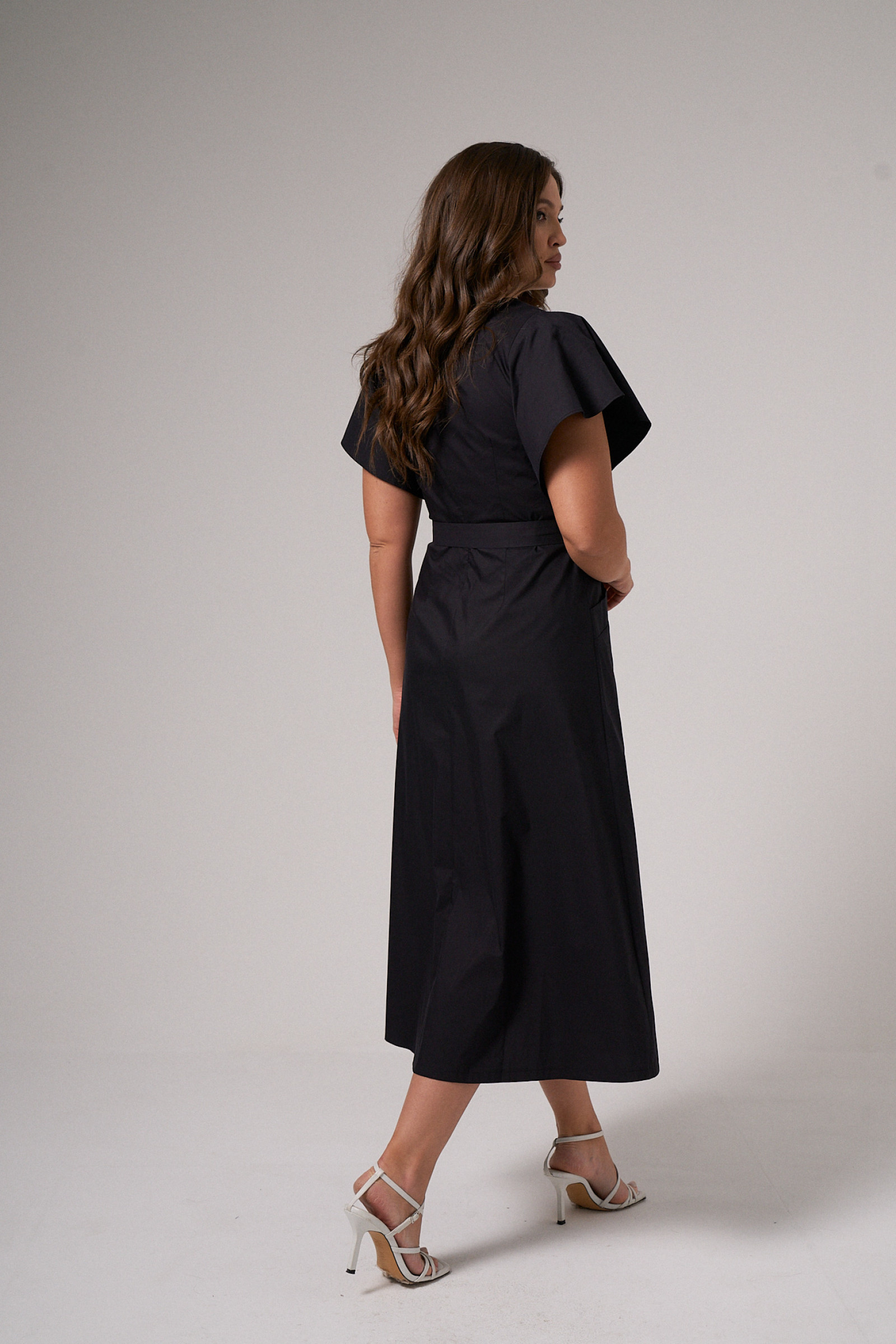 Платье приталенного силуэта с поясом, рельефами по переду и V-образной горловиной. Также на передней части платья два кармана с клапанами, средний шов, заканчивающийся встречной складкой. Спинка со средним швом, в котором находится молния, и двумя талиевыми вытачками. Рукав-объёмная рюша, входящая в пройму.