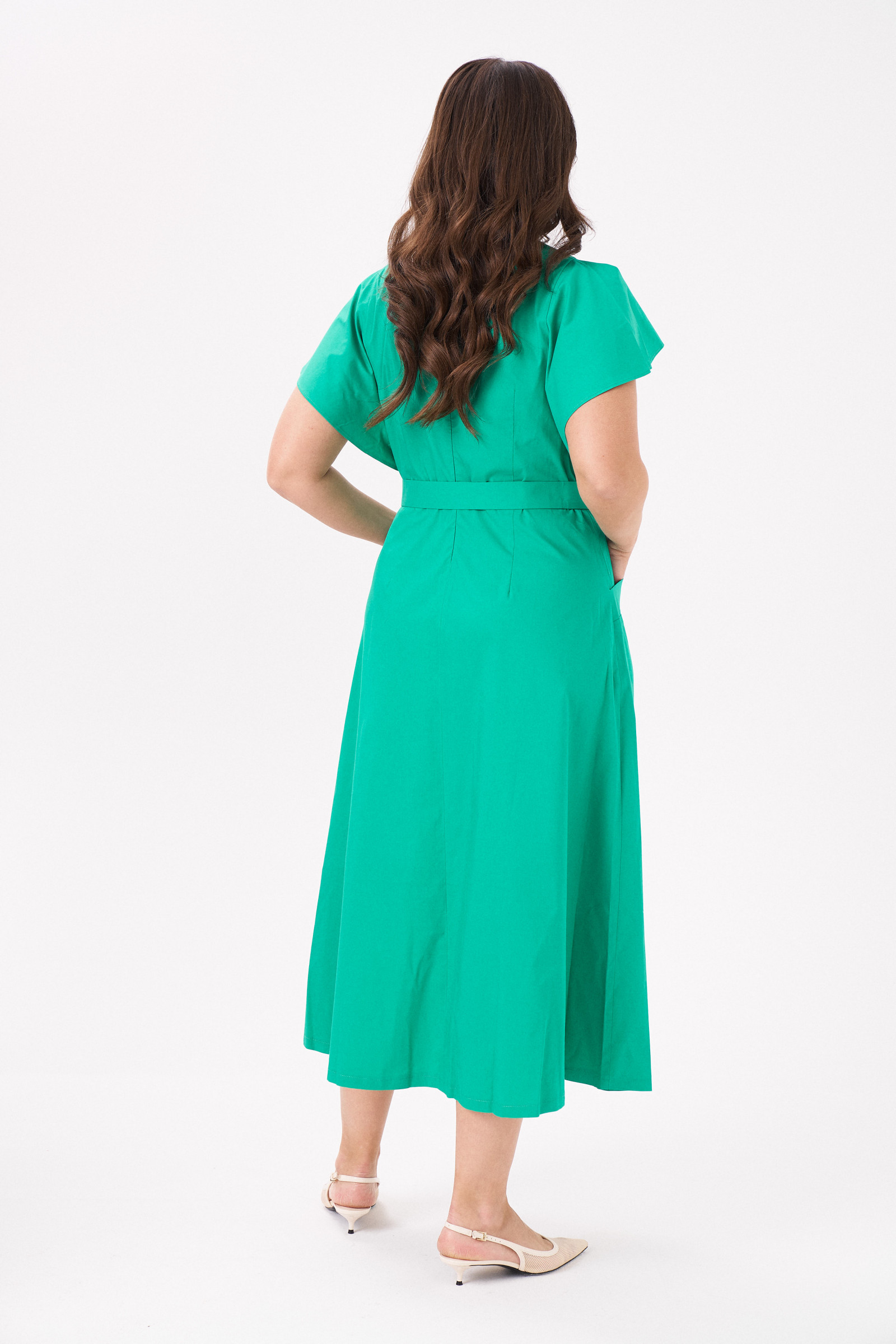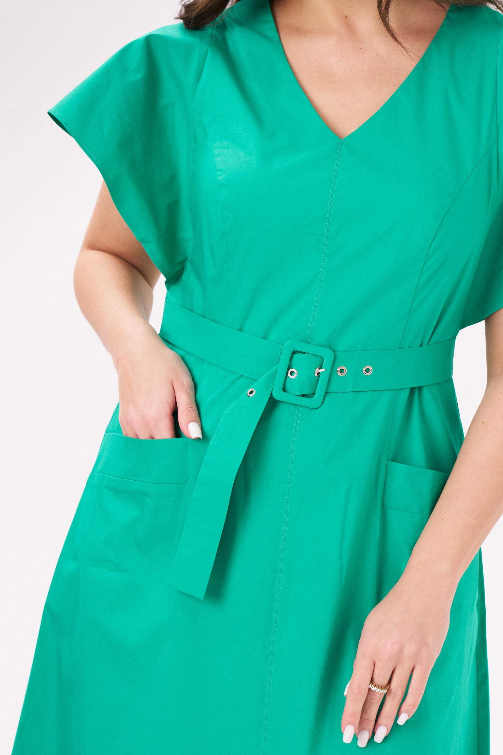 Платье приталенного силуэта с поясом, рельефами по переду и V-образной горловиной. Также на передней части платья два кармана с клапанами, средний шов, заканчивающийся встречной складкой. Спинка со средним швом, в котором находится молния, и двумя талиевыми вытачками. Рукав-объёмная рюша, входящая в пройму.