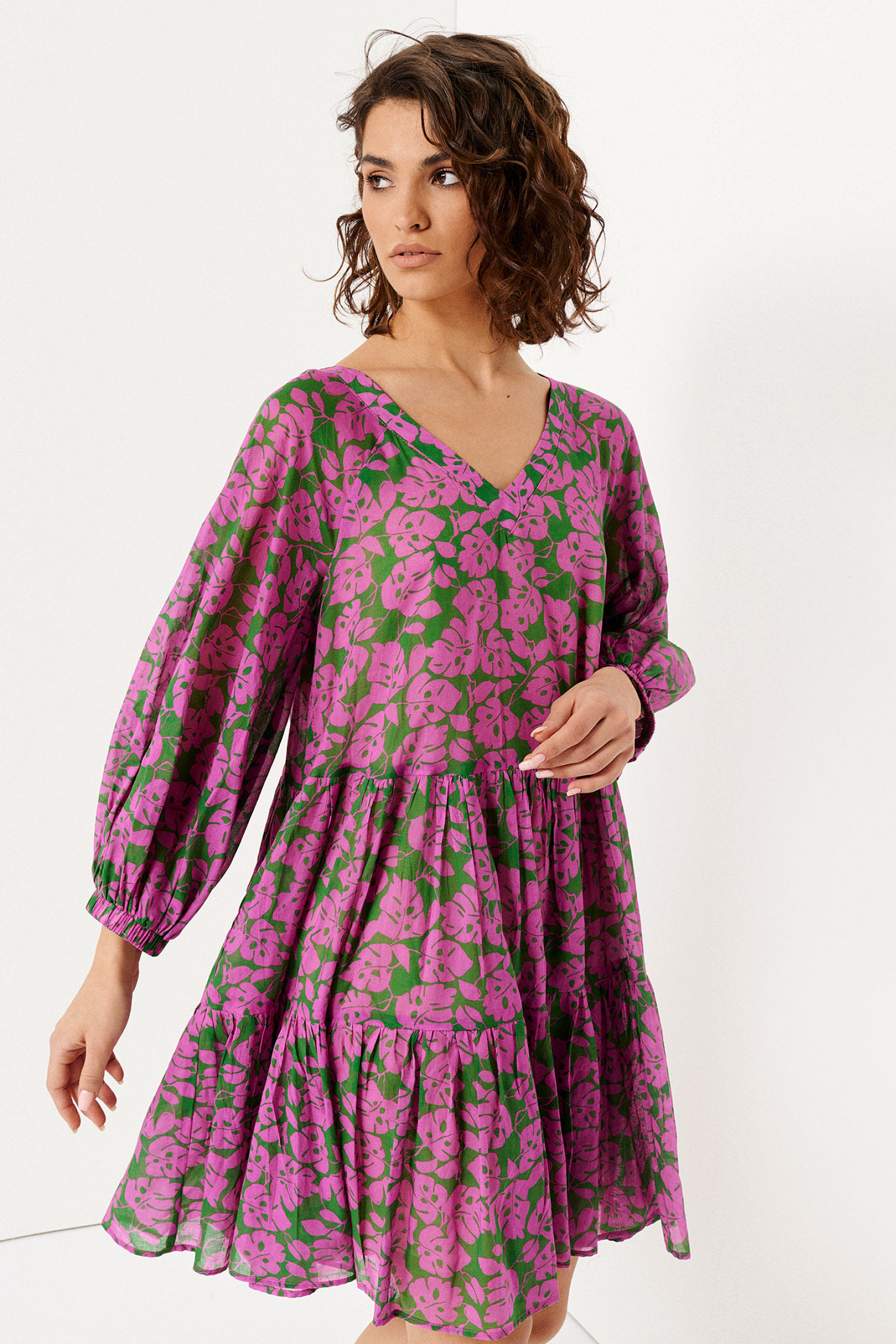 Платье женское из хлопковой лёгкой ткани для повседневной носки. Изделие на вискозной подкладке. Платье, расширяющееся к низу, имеет два присбореных волана. Длина выше колена. Горловина с V-образным вырезом. Рукав 7/8 по низу манжет с резинкой.Ткань имеет принт с цветочным мотивом.