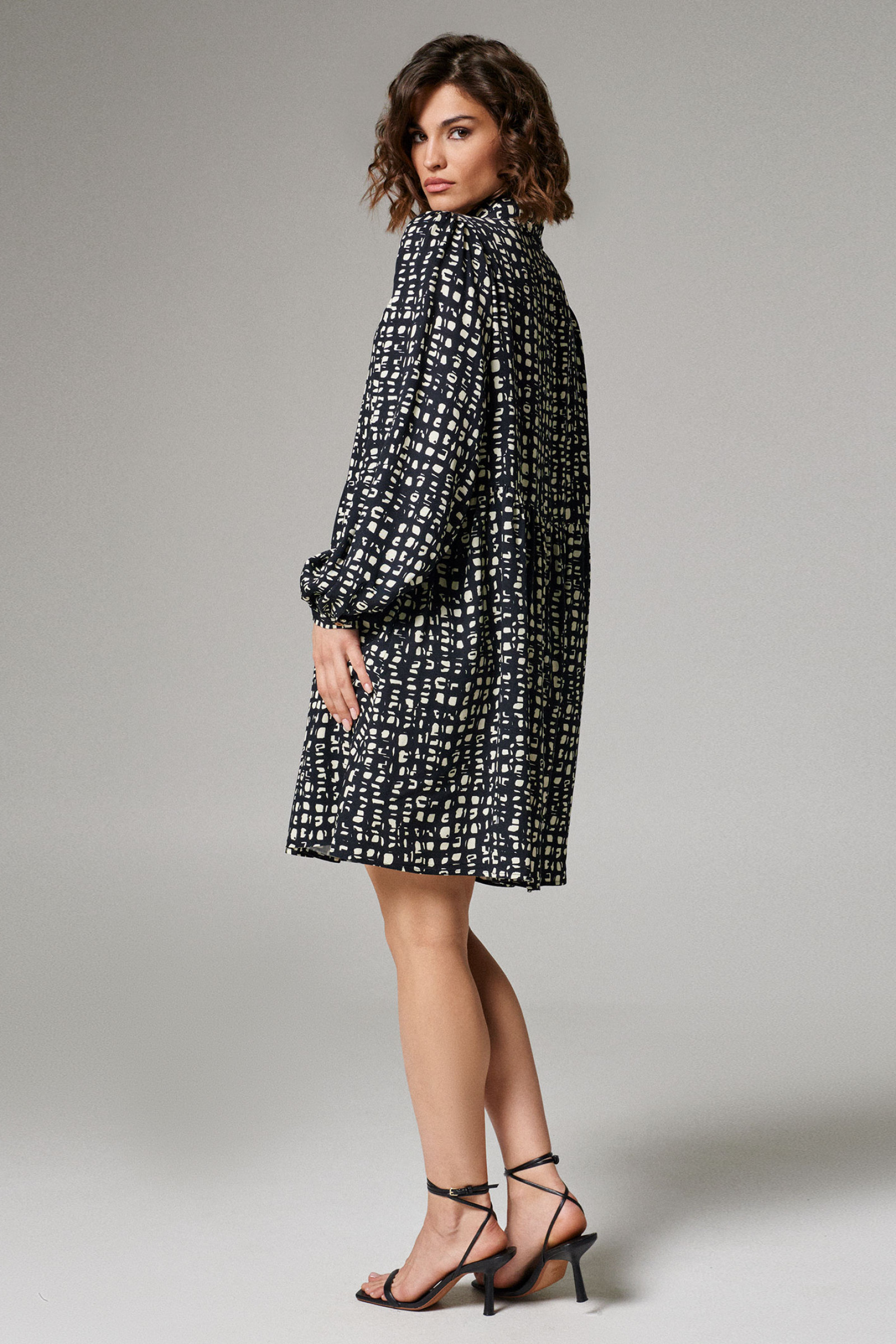 Платье женское из вискозной ткани для повседневной носки. Без подкладки. Платье прямого силуэта с прорезными карманами в боковых швах, Платье отрезное по талии. Воротник-стойка. Застежка фронтальная на пуговицы. Рукава длинные оформлены манжетой.