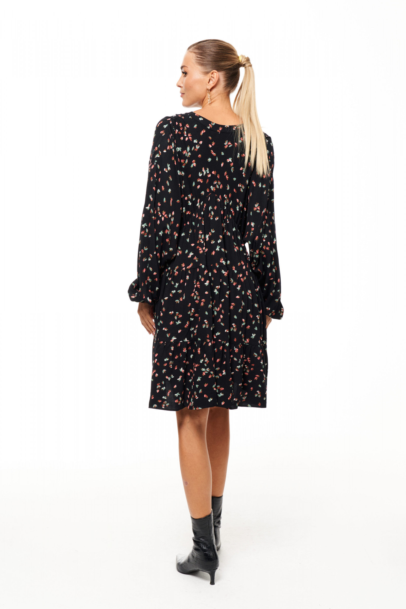 Платье женское из вискозной ткани для повседневной носки. Силуэт платья расширен к низу. У издения три отрезных яруса на сборке, застежка фронтальная на три петли пуговицы. Рукав длинный, оформлен манжетой. Ткань черная в мелкий цветочек.