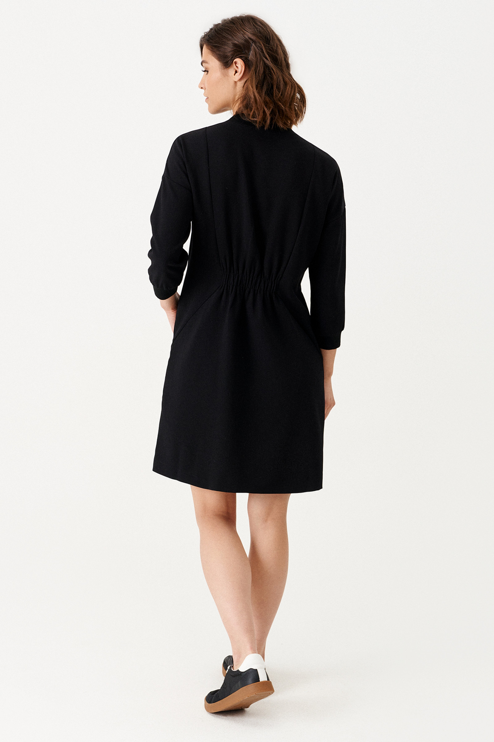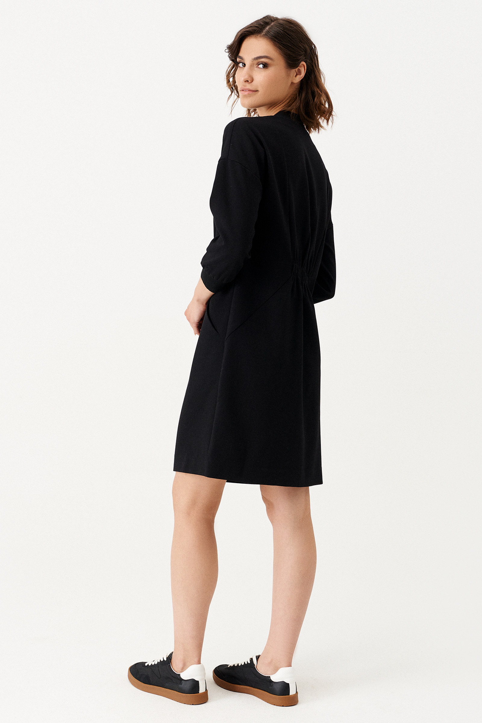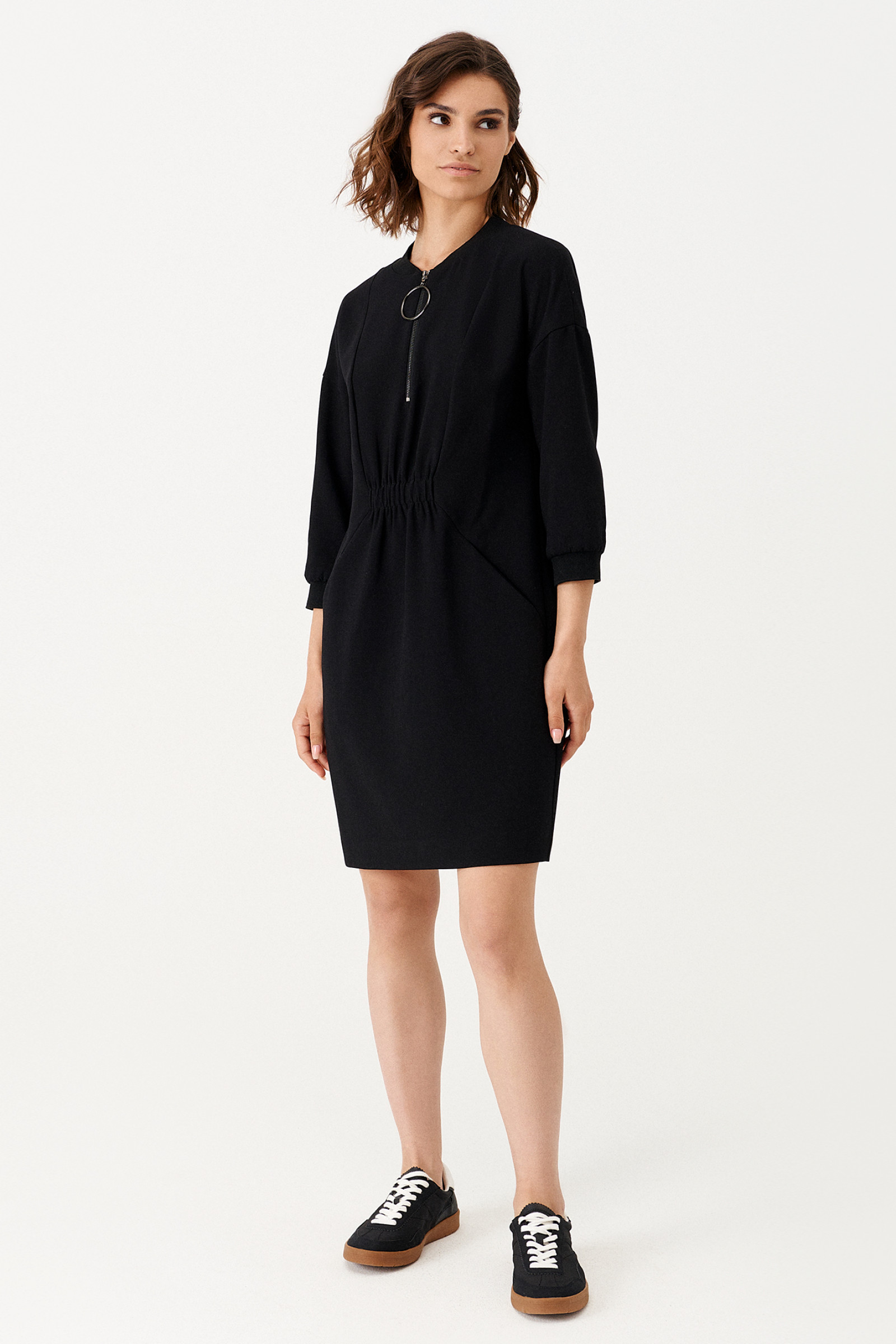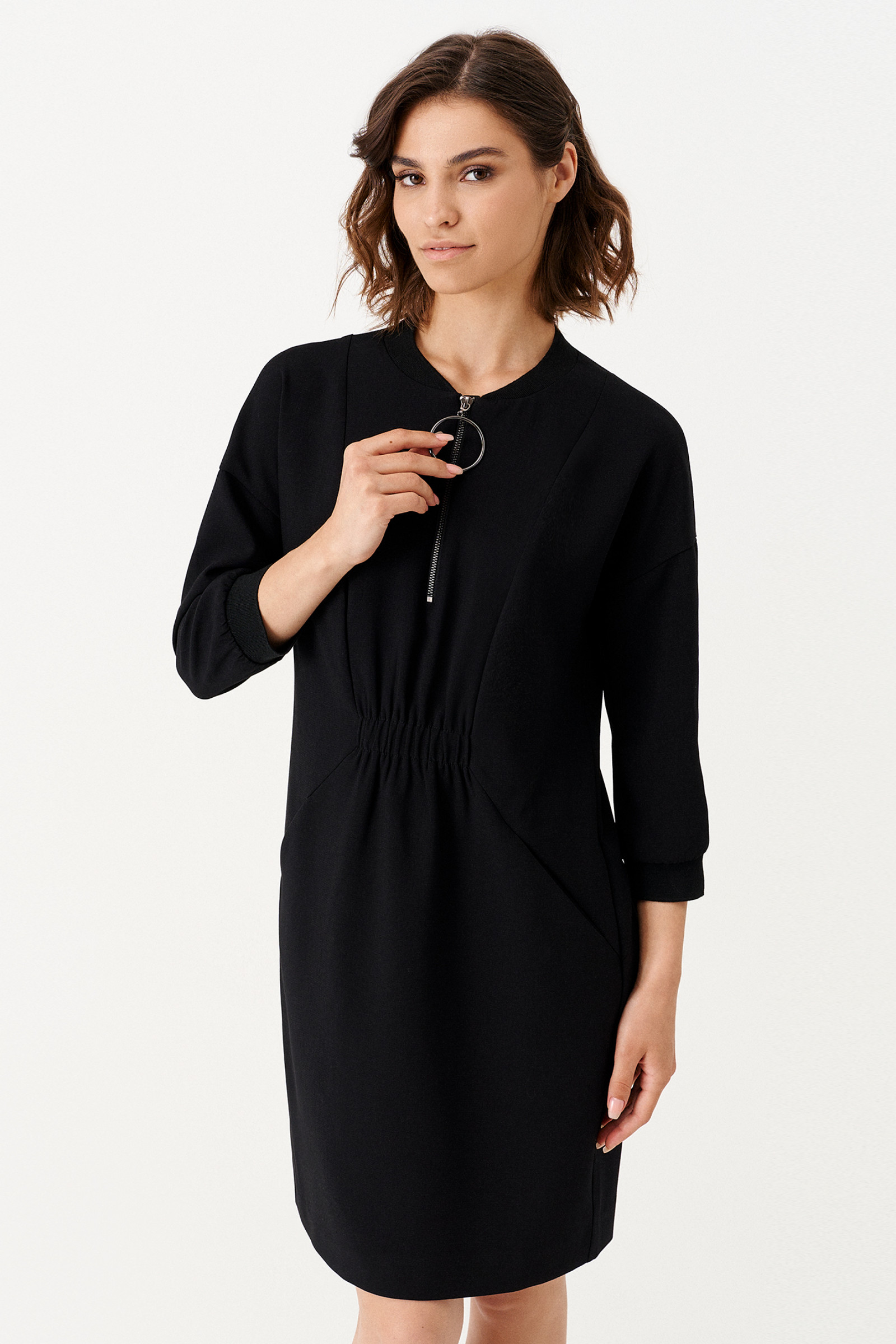 Платье женское из поливискозной ткани для повседневной носки. На передней части платья от горловины вставлена молния, есть рельефы и прорезные карманы. Так же на передней части в области талии вставлена резинка. На задней части платья так же есть рельефы и вставлена резинка в области талии. Рукава втачные укороченные. По низу рукава манжеты. Ткань однотонная.