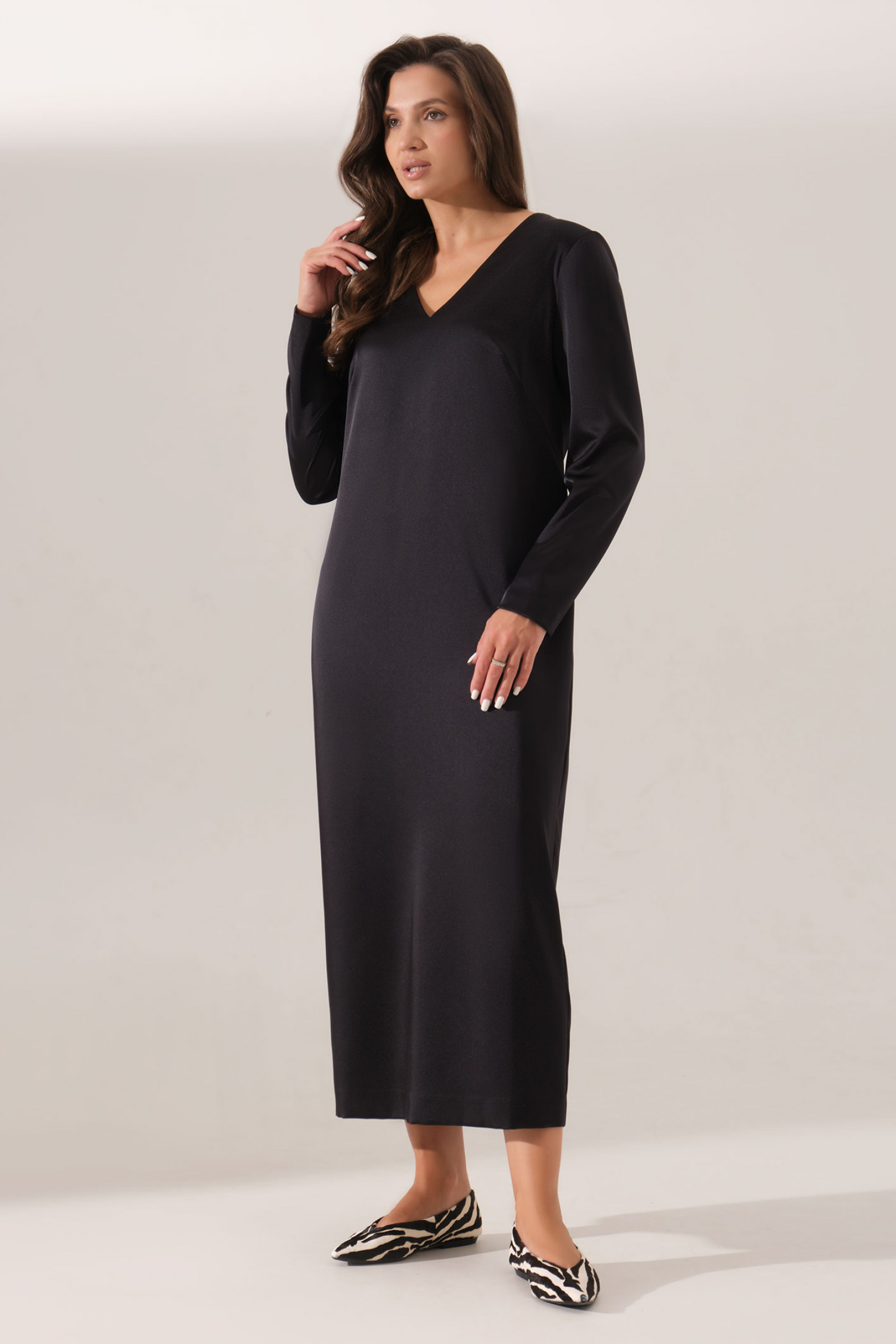 Платье женское из атласной ткани для торжественных мероприятий. Платье полуприлегающего силуэта. Перед имеет две нагрудные вытачки. Спинка со средним швом и застежкой-молнией в шве и небольшим разрезом в шве по низу изделия, а также по спинке располагаются две талиевые вытачки. Горловина V-образная. Рукава втачные длинные. Длина изделия макси. Красивое и стильное платье, которое будет отлично смотреться на любой фигуре.