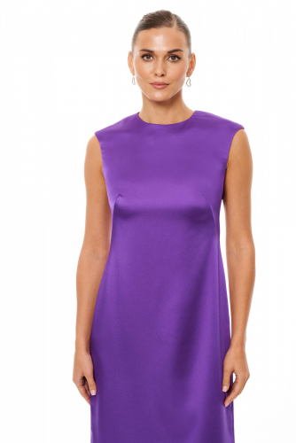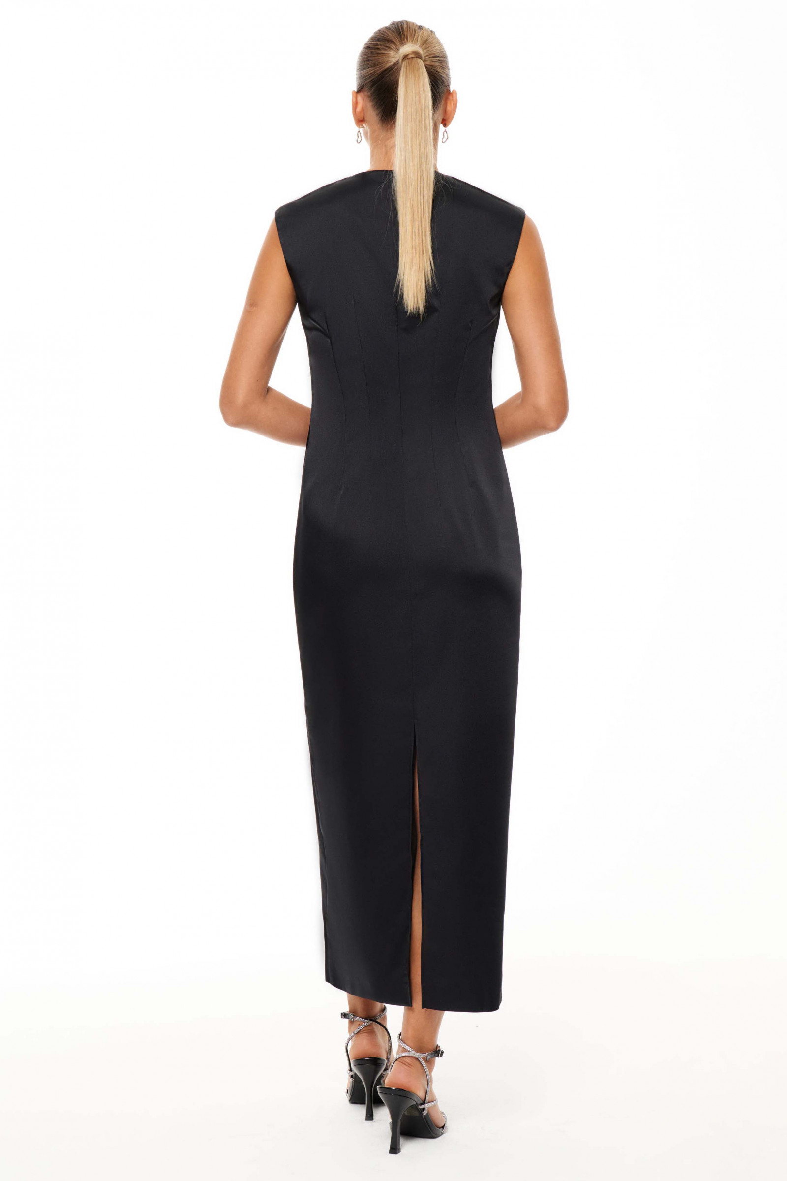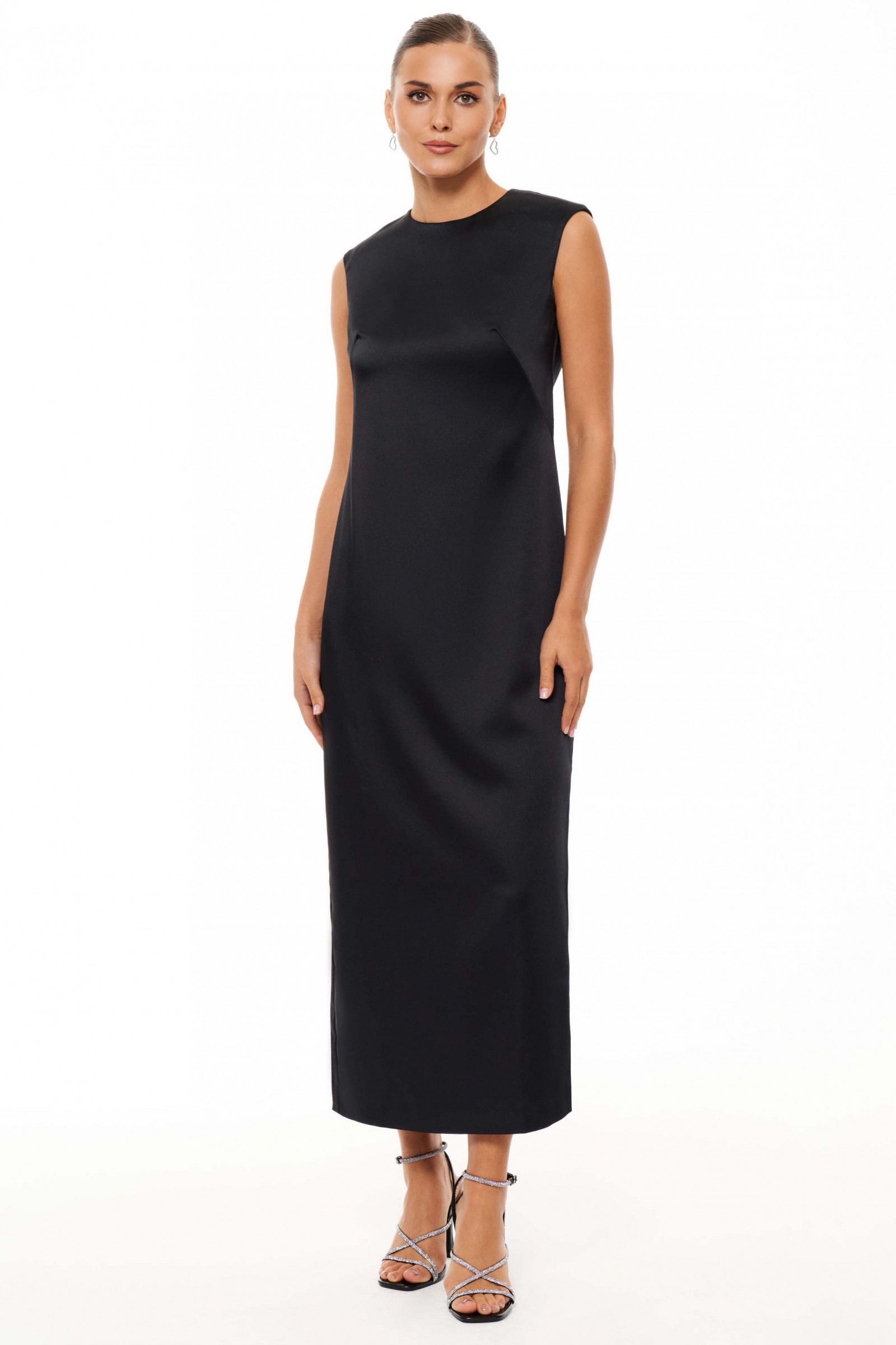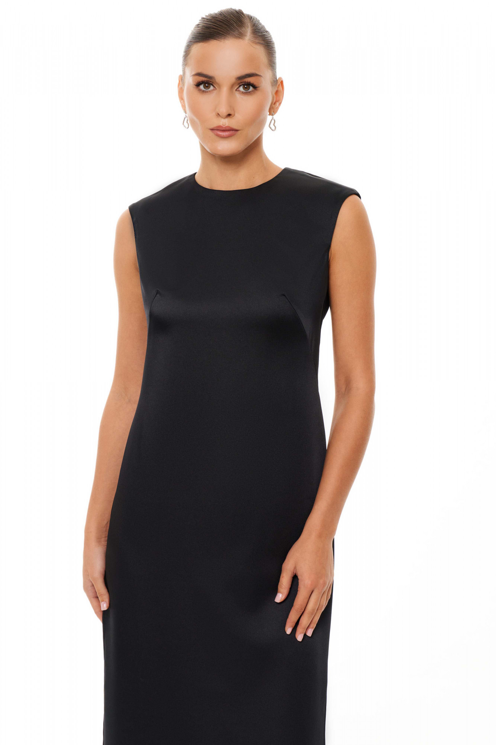 Платье женское атласное полуприлегающего силуэта. Платье подходит как для повседневной носки, так и для праздничных случаев. Перед имеет две нагрудные вытачки. Спинка имеет четыре талиевые вытачки и средний шов с потайной застежкой молнией в шве. В среднем шве по спинке имеет разрез к низу изделия. Горловина чуть заужена. Платье не имеет рукавов. Длина платья миди. Отличный вариант платья для вашего времяпровождения, в нем вы обязательно почувствуете себя уверенней.