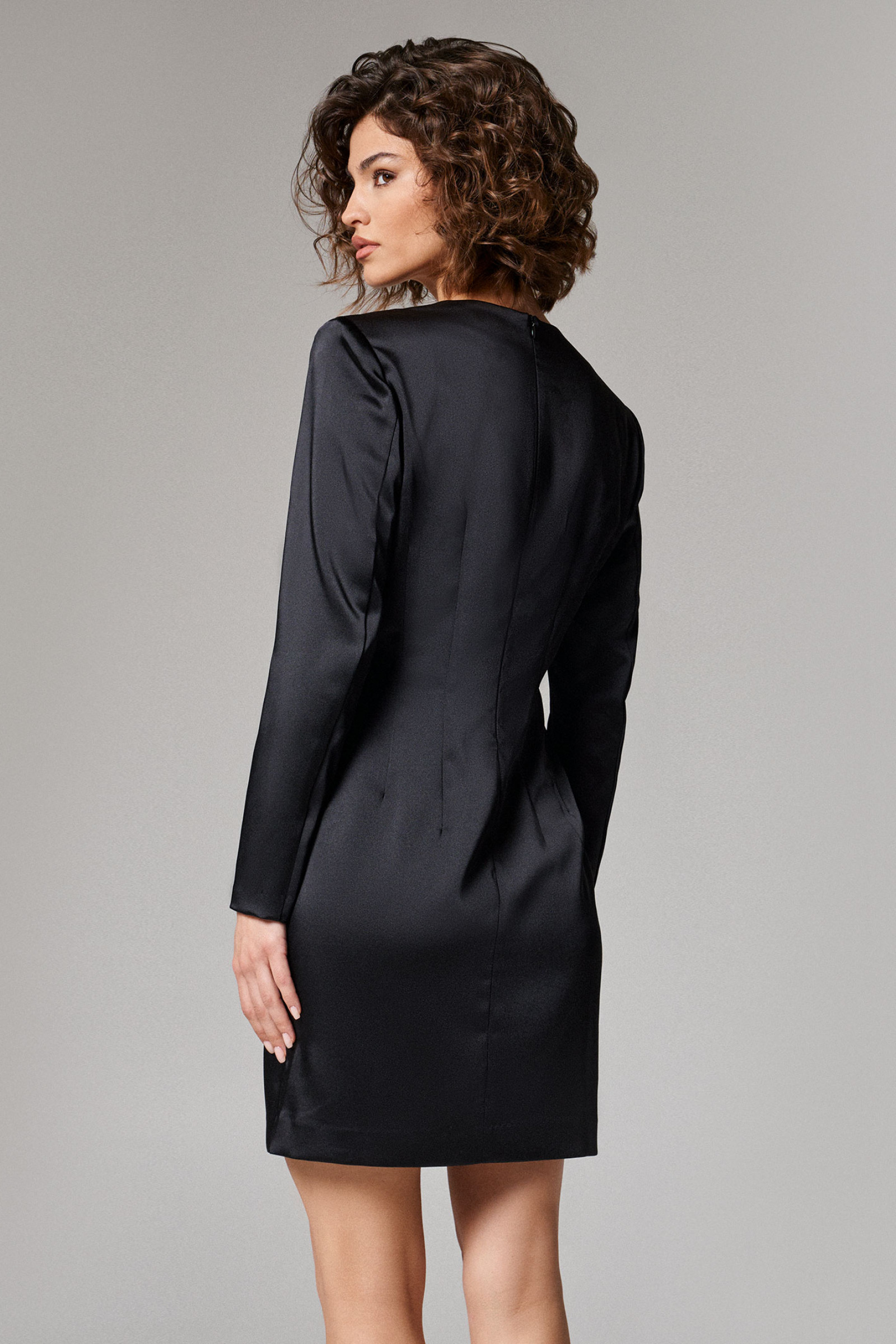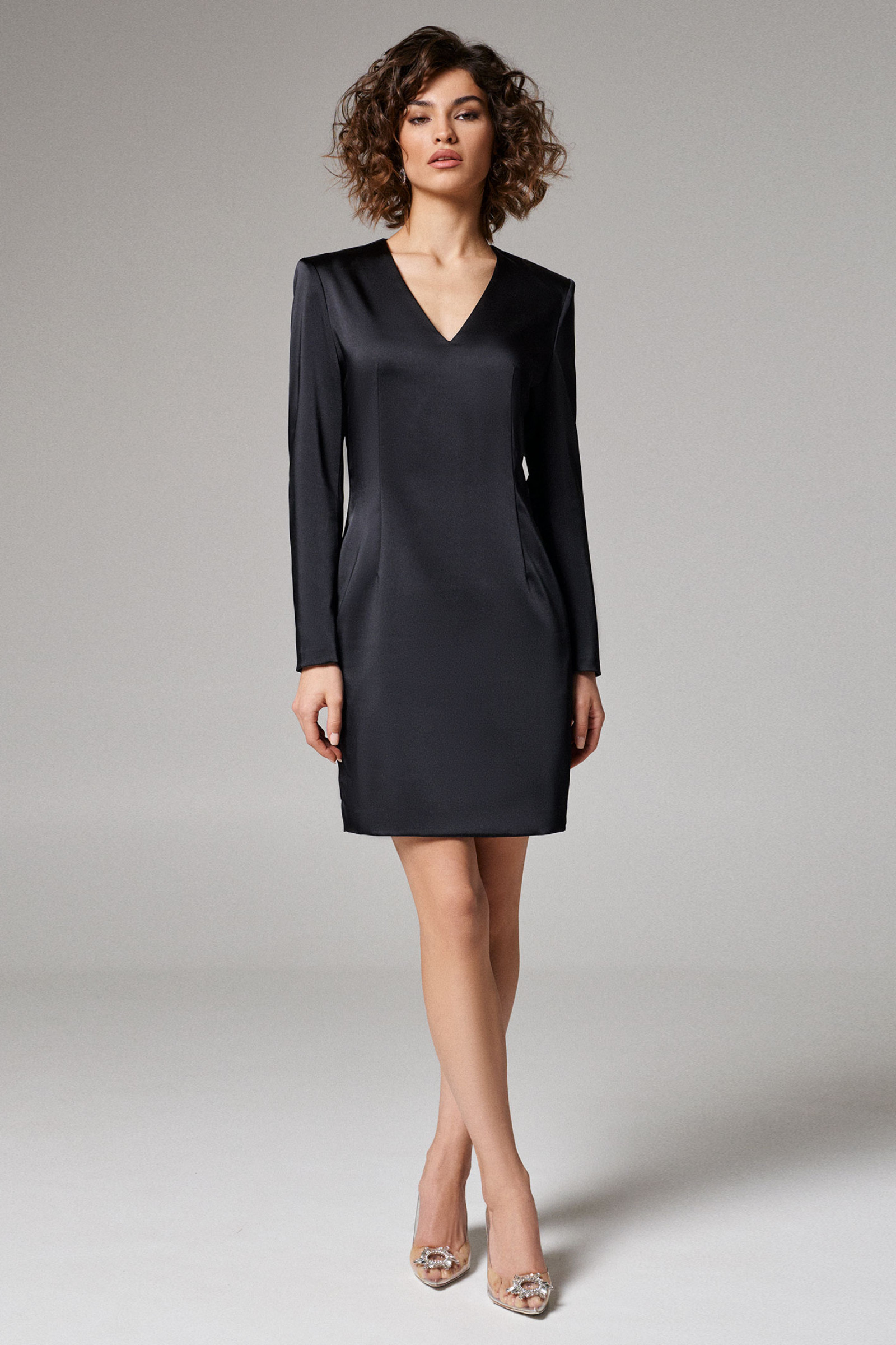 Платье из атласной ткани для повседневной носки полуприлегающего силуэта. Перед имеет две талиевые вытачки. Спинка со средним швом и застежкой-молнией в шве, а также по спинке располагаются четыре талиевые вытачки. Горловина V-образная. Рукава втачные длинные. Длина изделия чуть выше колена. Красивое и стильное платье, которое будет отлично смотреться на любой фигуре.