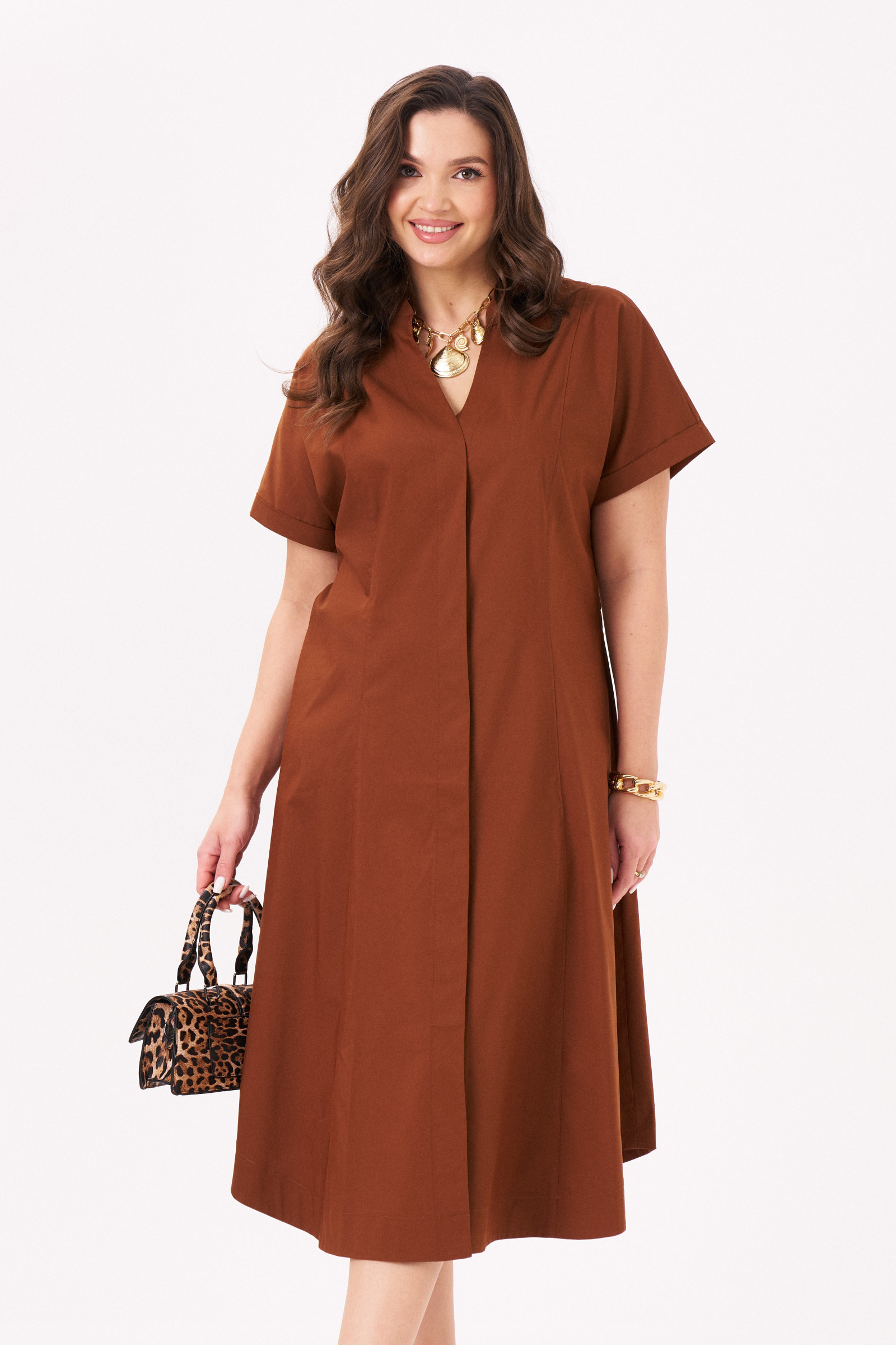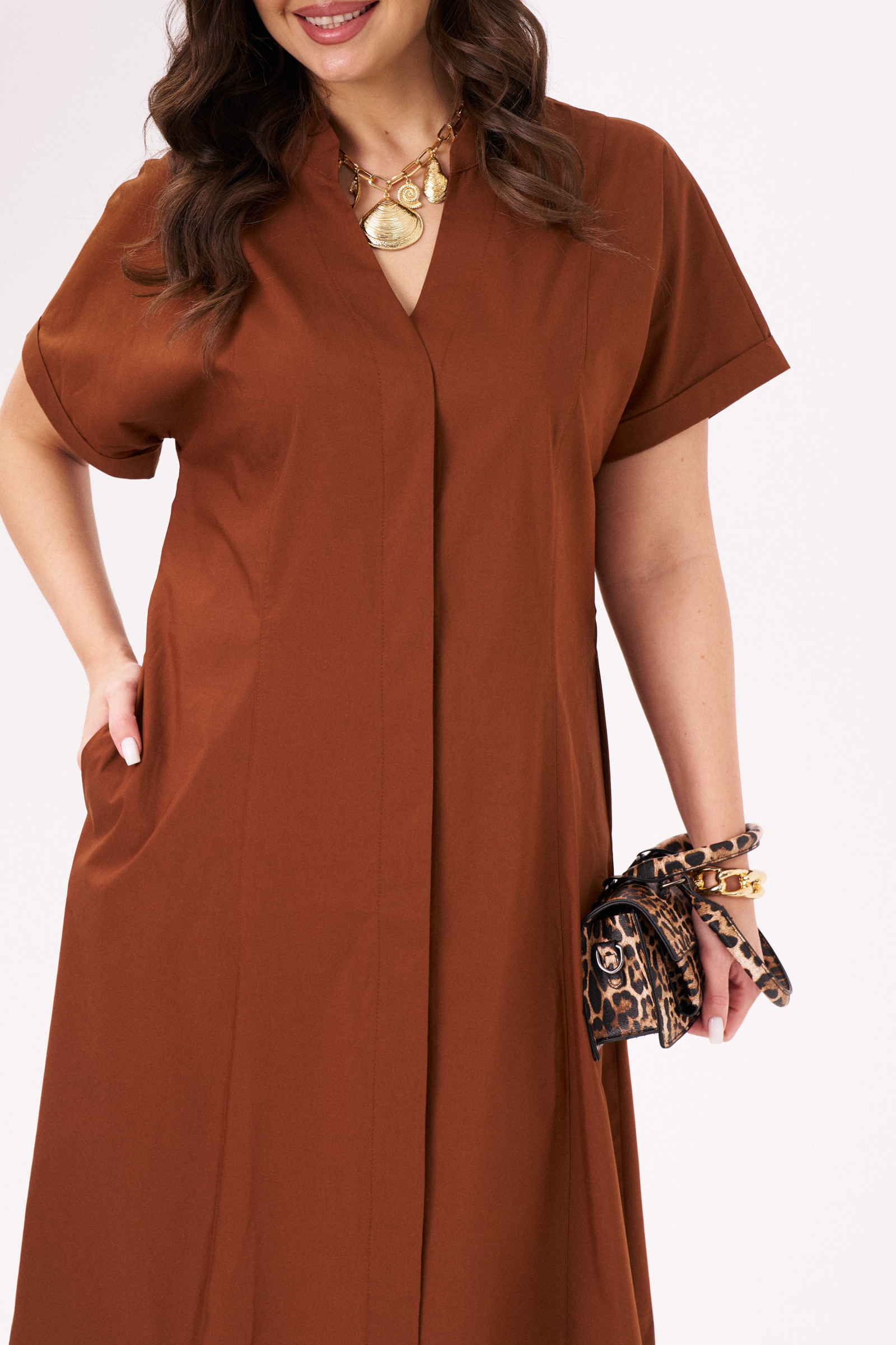 Платье женское из хлопковой ткани для повседневной носки. Силуэт полуприлегающий с укороченным цельнокроеным рукавом. Рукав оформлен отложной манжетой. По переду и спинке рельефные швы. Застежка фронтальная на пуговицы. Платье с прорезными карманами в боковых швах.