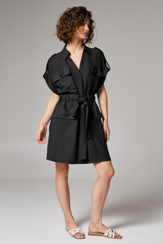 Платье длиной выше колена. В области плеч вставлены плечевые накладки, придающие обьем и форму.