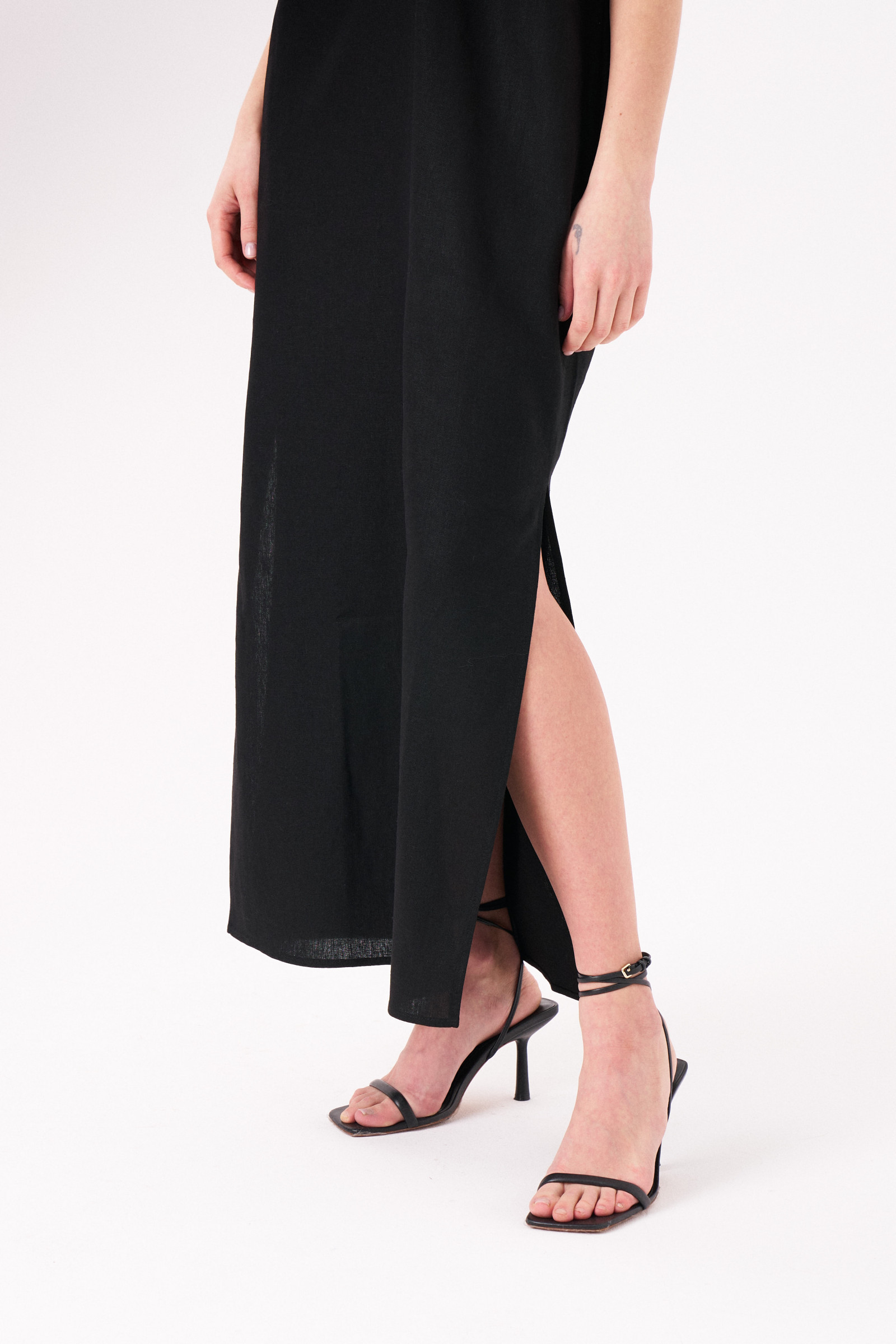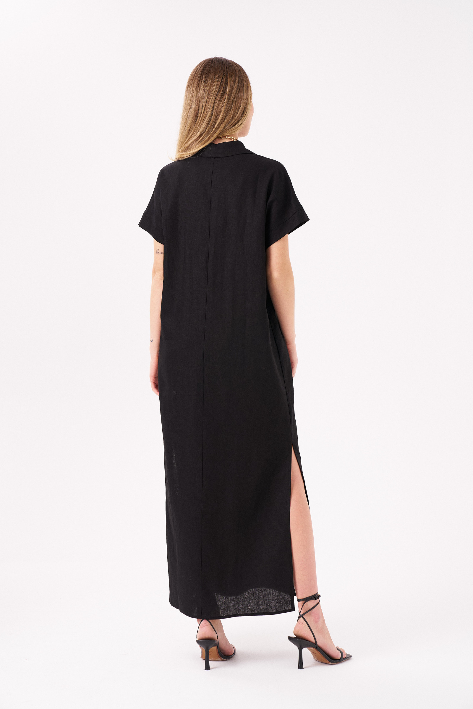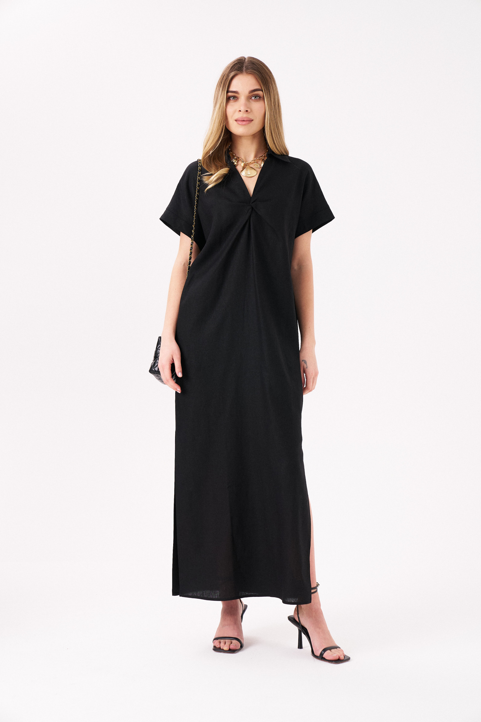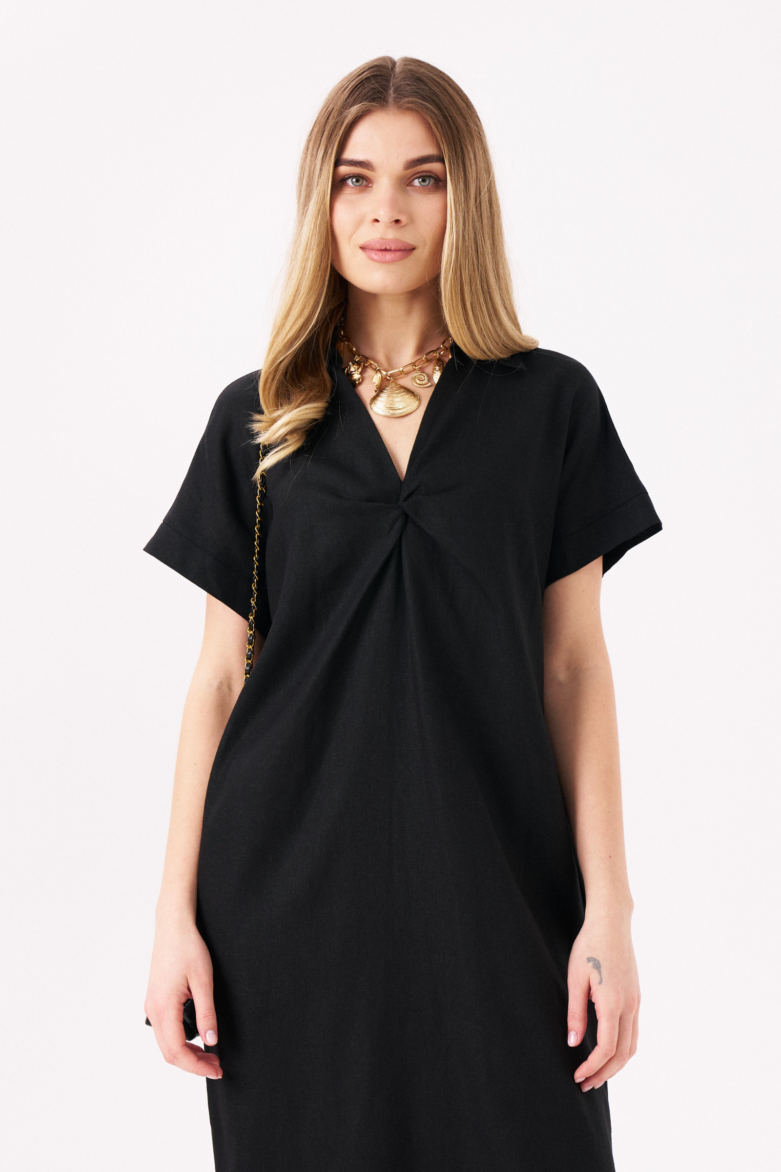 Платье женское из льняной ткани для повседневной носки. Платье прямого кроя с коротким рукавом. В боковых швах прорезные карманы, разрезы от низа изделия. На передней части изделия дизайнерский элемент.