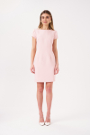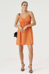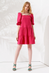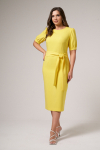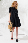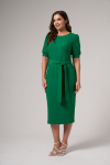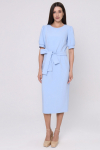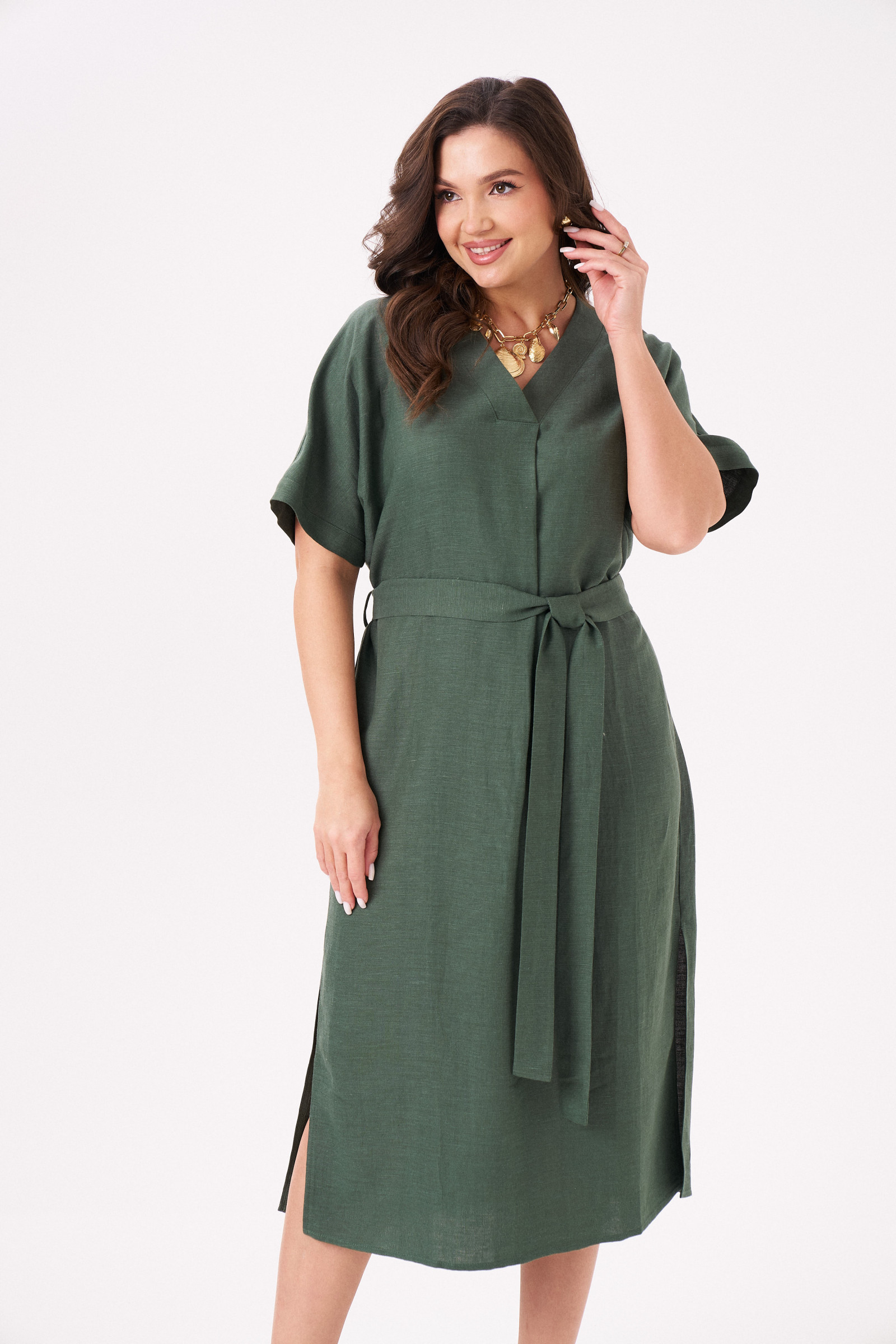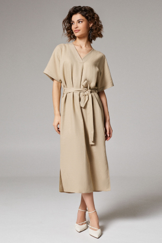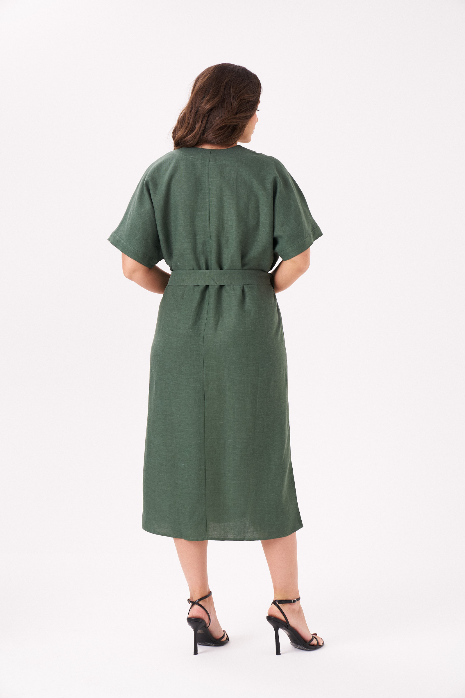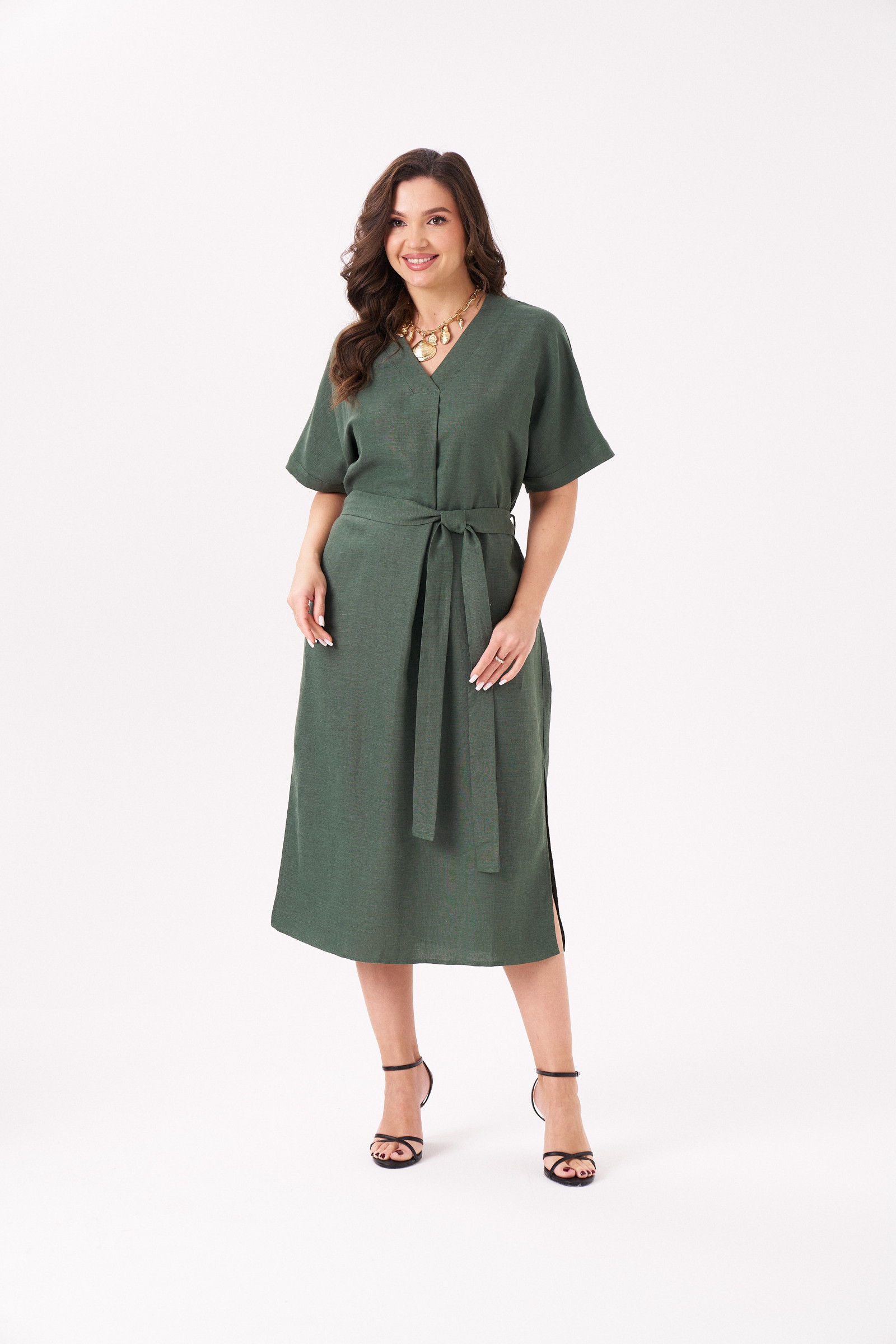 Платье женское из льняной ткани для повседневной носки. Платье прямого силуэта, без подкладки. Горловина V-образная, рукав короткий оформлен манжетой. На передней части изделия дизайнерский элемент. Разрезы в боковых швах от низа изделия. Платье укомплектовано поясом из основной ткани изделия.