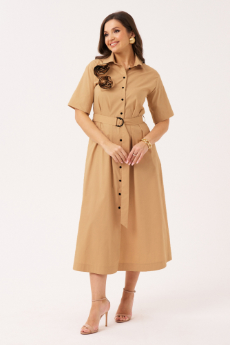 Женское платье летнее из смесовой ткани – это идеальный выбор для тех, кто ценит комфорт, стиль и универсальность. Свободный крой и прямой силуэт делают эту модель удобной для повседневной носки, а супатная застежка на пуговицы с аккуратной планкой придает образу завершенность и элегантность. Классический рубашечный воротник и длинные цельнокроеные рукава с отлетной манжетой подчеркивают деловой и офисный стиль, позволяя носить платье как в рабочие будни, так и на более торжественные мероприятия. Отрезное по линии талии и дополненное поясом, платье легко адаптируется под фигуру, создавая утонченный женственный силуэт. Боковые прорезные карманы добавляют практичности, а нагрудные вытачки делают посадку особенно аккуратной. Это базовый элемент гардероба в нежном бежевом оттенке, который легко комбинируется с различной обувью и аксессуарами. Платье идеально подойдет как для летнего или весеннего сезона, так и для прохладных дней в сочетании с жакетом. Оно гармонично впишется в деловой дресс-код, станет удачным выбором для повседневной жизни, прогулок, встреч или даже праздничного ужина. В этом нарядном, но сдержанном образе вы будете чувствовать себя уверенно в любой ситуации. Платье женское, свободное, классическое – продуманный выбор для тех, кто ищет комфорт, стиль и универсальность в одном изделии.