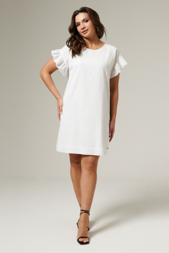 Платье женское из льняной ткани для повседневной носки. Платье прямого силуэта с фронтальной застежкой на пуговицы и воротником--стойкой. Рукав втачной укороченный оформлен притачной отложной манжетой. По переду отрезная кокетка, накладные карманы с клапаном, застёгивающиеся на петлю-пуговицу. Спинка с отрезной кокеткой и бантовой складкой. В боковых швах треугольная вставка. Низ фигурный. Стильное платье для тёплых дней.