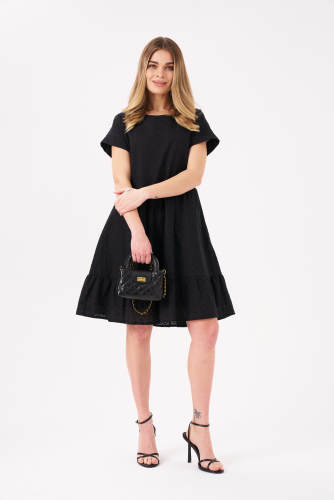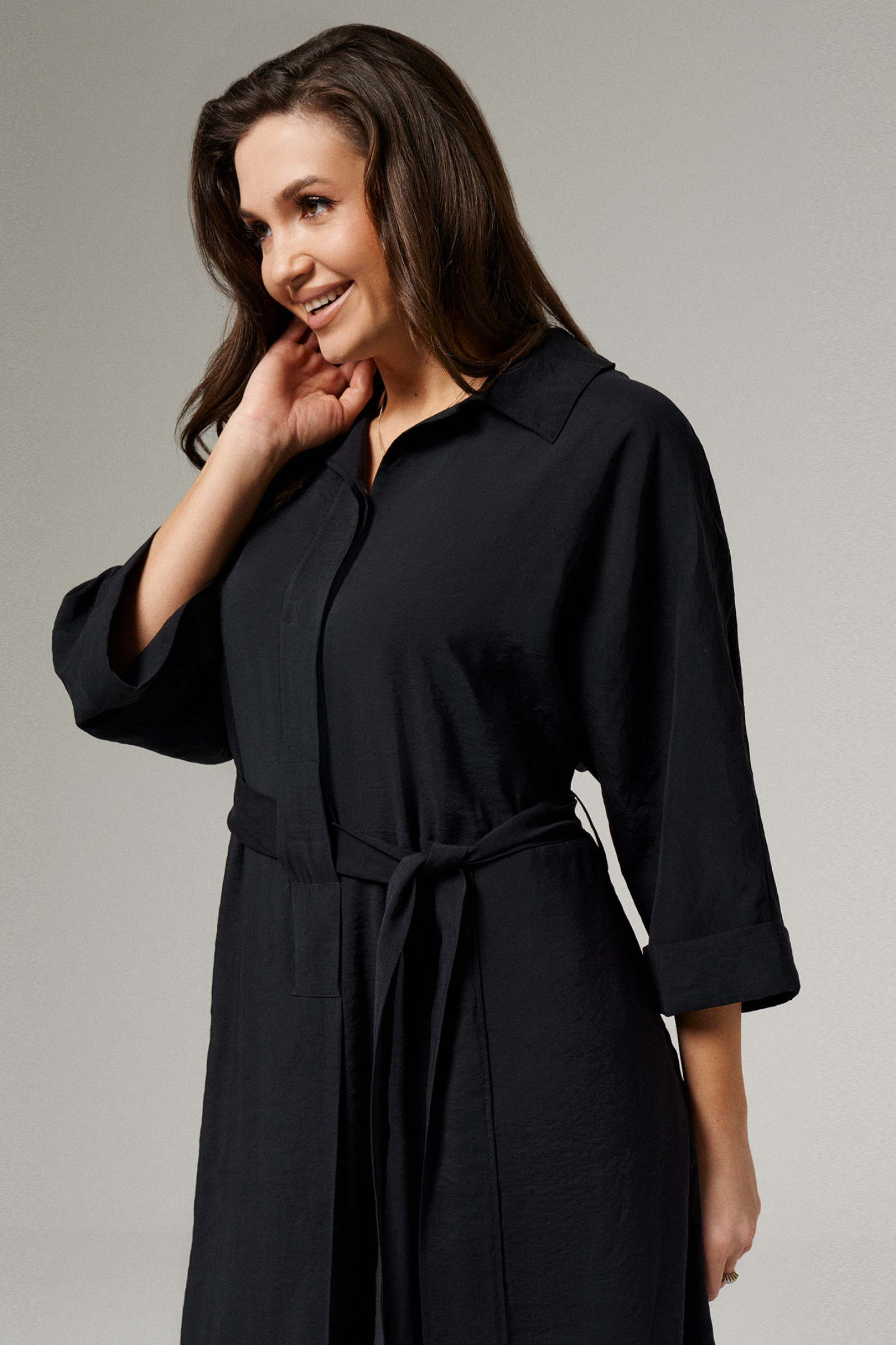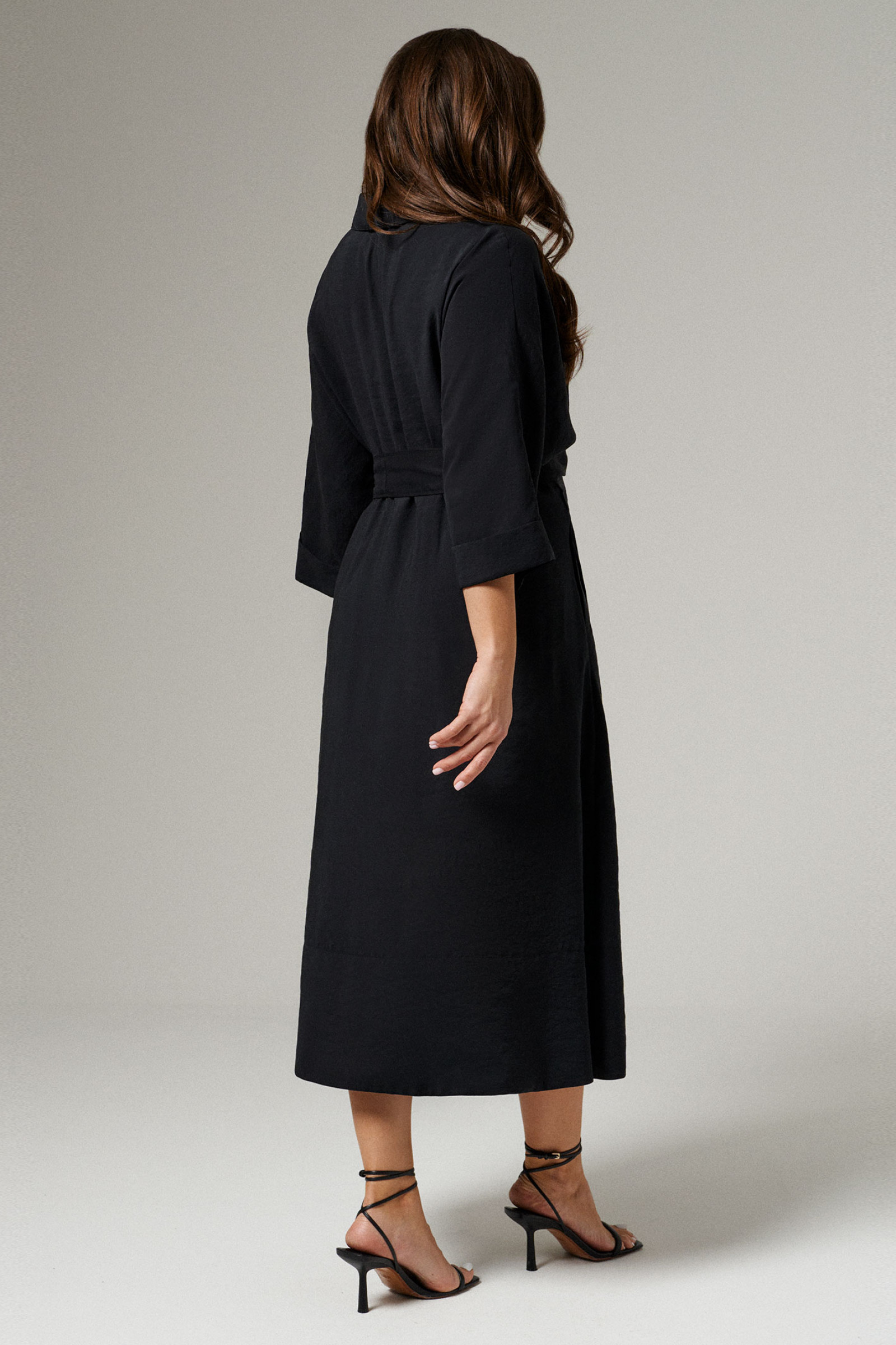 Платье из вискозной ткани для повседневной носки. Изделие А- силуэта с укороченным цельнокроеным рукавом оформленным притачной манжетой. Воротник- стойка. В боковых швах прорезные карманы. Платье укомплектовано поясом из основной ткани изделия.