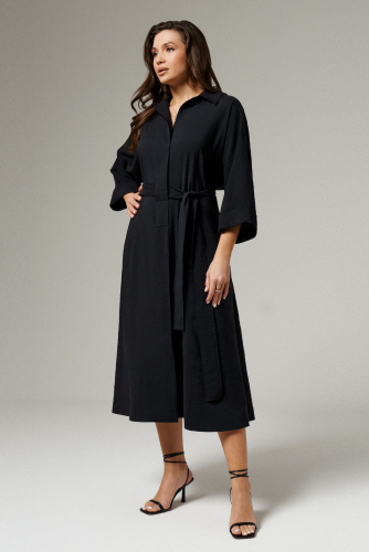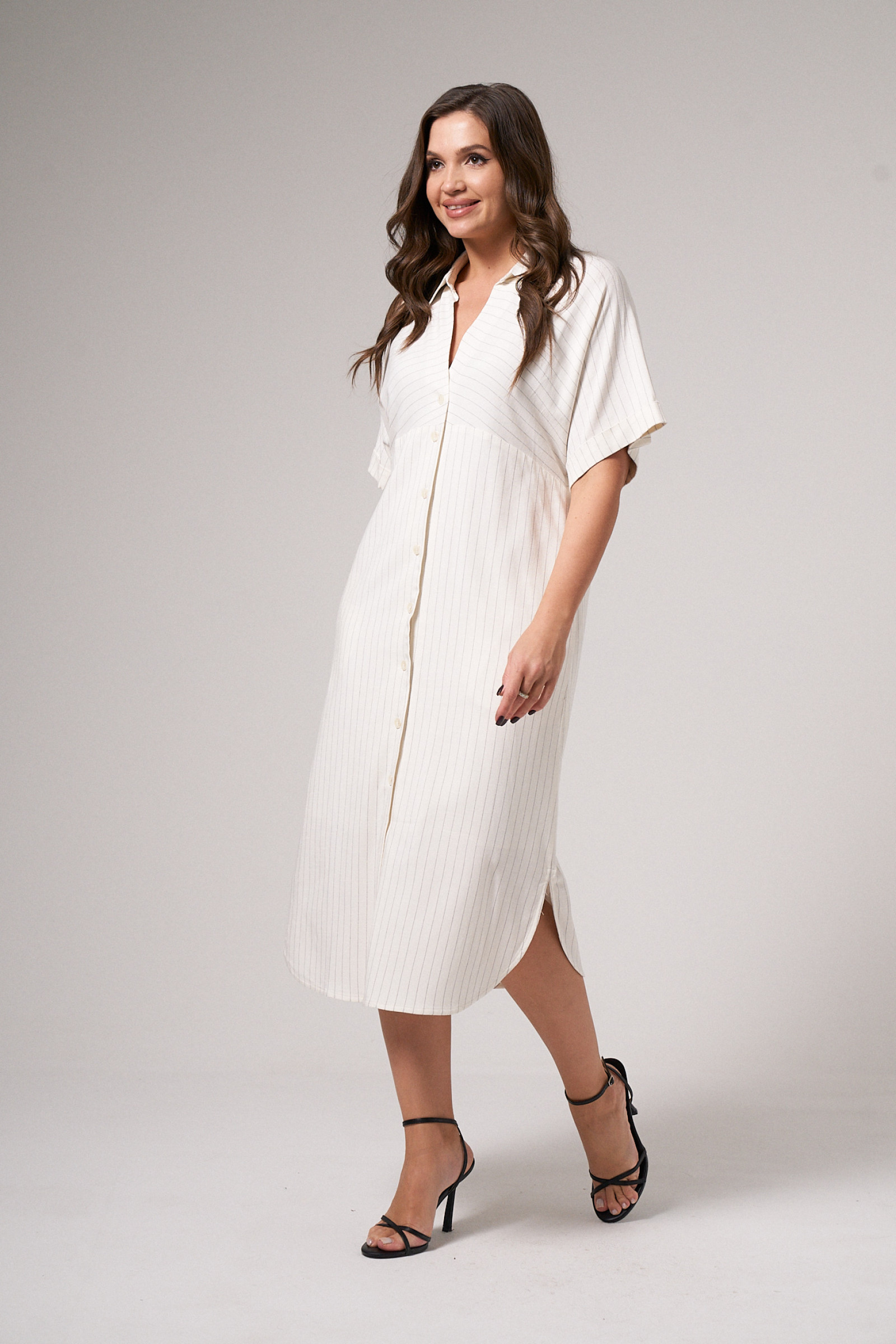 Платье из вискозной ткани для повседневной носки. Изделие на вискозной подкладке. Платье с подрезом под грудью, цельнокроеным коротким рукавом, оформленным притачной отложной манжетой. Воротник- стойка. Изделие с фронтальной застежкой на пуговицы, прямого силуэта, длиной до колена. В боковых швах прорезные карманы, разрезы от низа изделия.