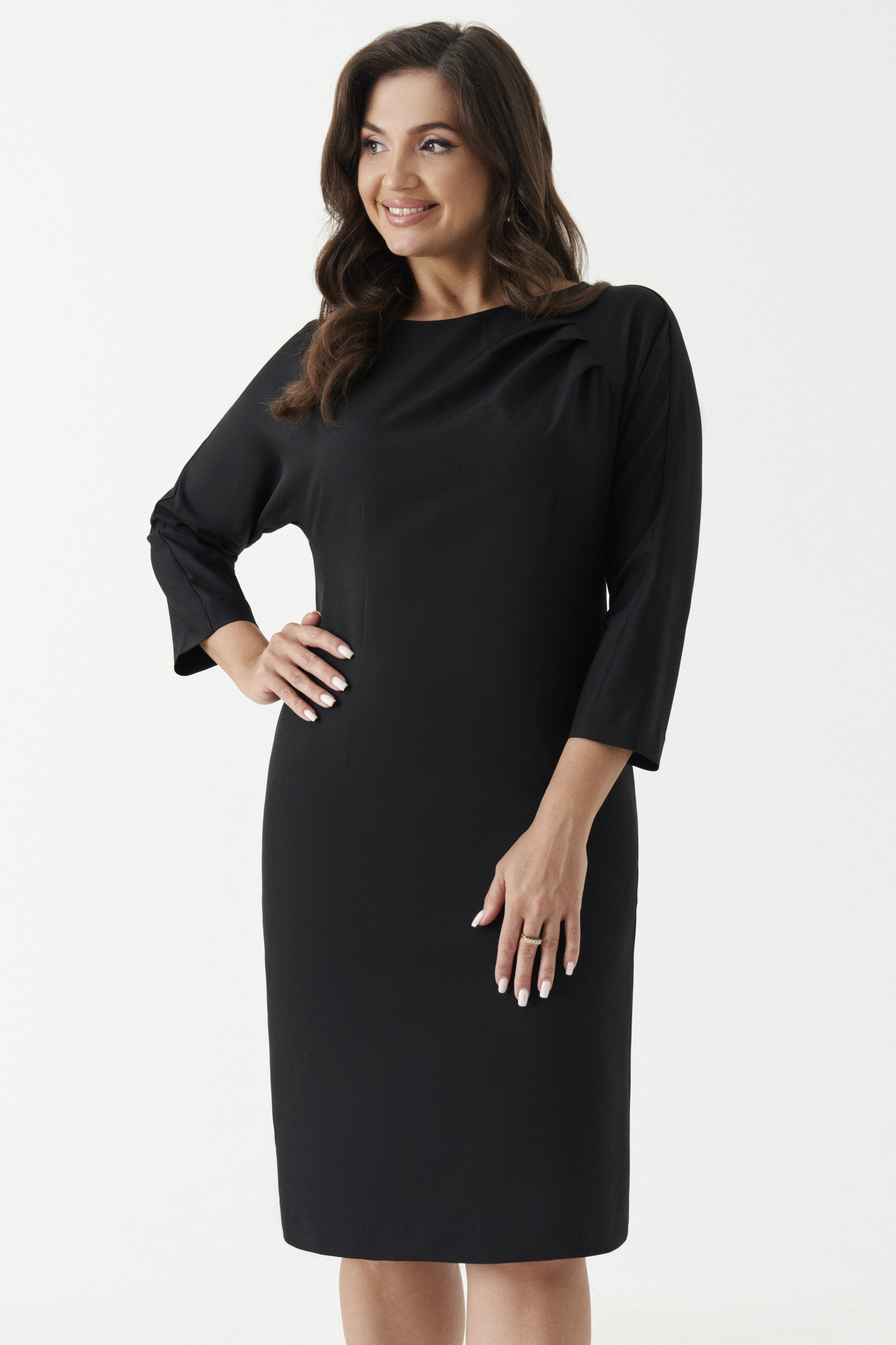 Платье из поливискозной ткани для повседневной носки. Изделие полуприлегающего силуэта с цельнокроеным рукавом. По переду и спинке талиевые вытачки. Средний шов спинки заканчивается шлицей. Левый рукав втачной. Застежка на потайную молнию в среднем шве спинки. Отличное платье для вашего времяпровождения, в нем вы будете чувствовать себя комфортно, а главное уверенно.