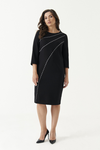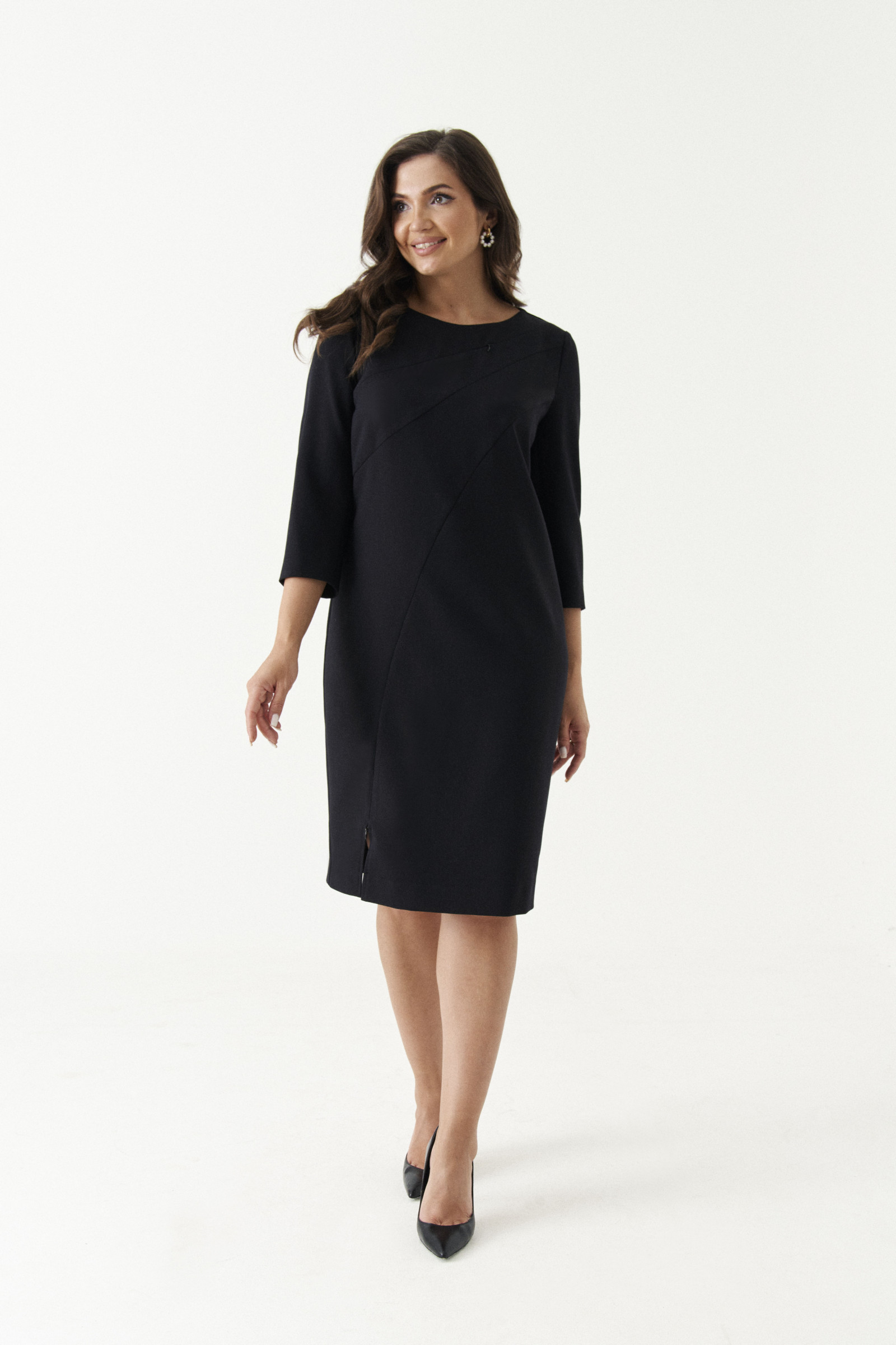 Платье из поливискозной ткани для повседневной носки. Платье полуприлегающего силуэта. Рукав втачной, длина 3/4, чуть ниже локтя. Горловина круглая. Перед имеет две декоративные молнии в шве и один декоративный шов. Спинка имеет две талиевые вытачки и средний шов с потойной застежкой молнией. Платье на поливискозной подкладке. Длина изделия до колена. Интересный вариант для тех, кто хочет обыграть и разнообразить свой гардероб.
