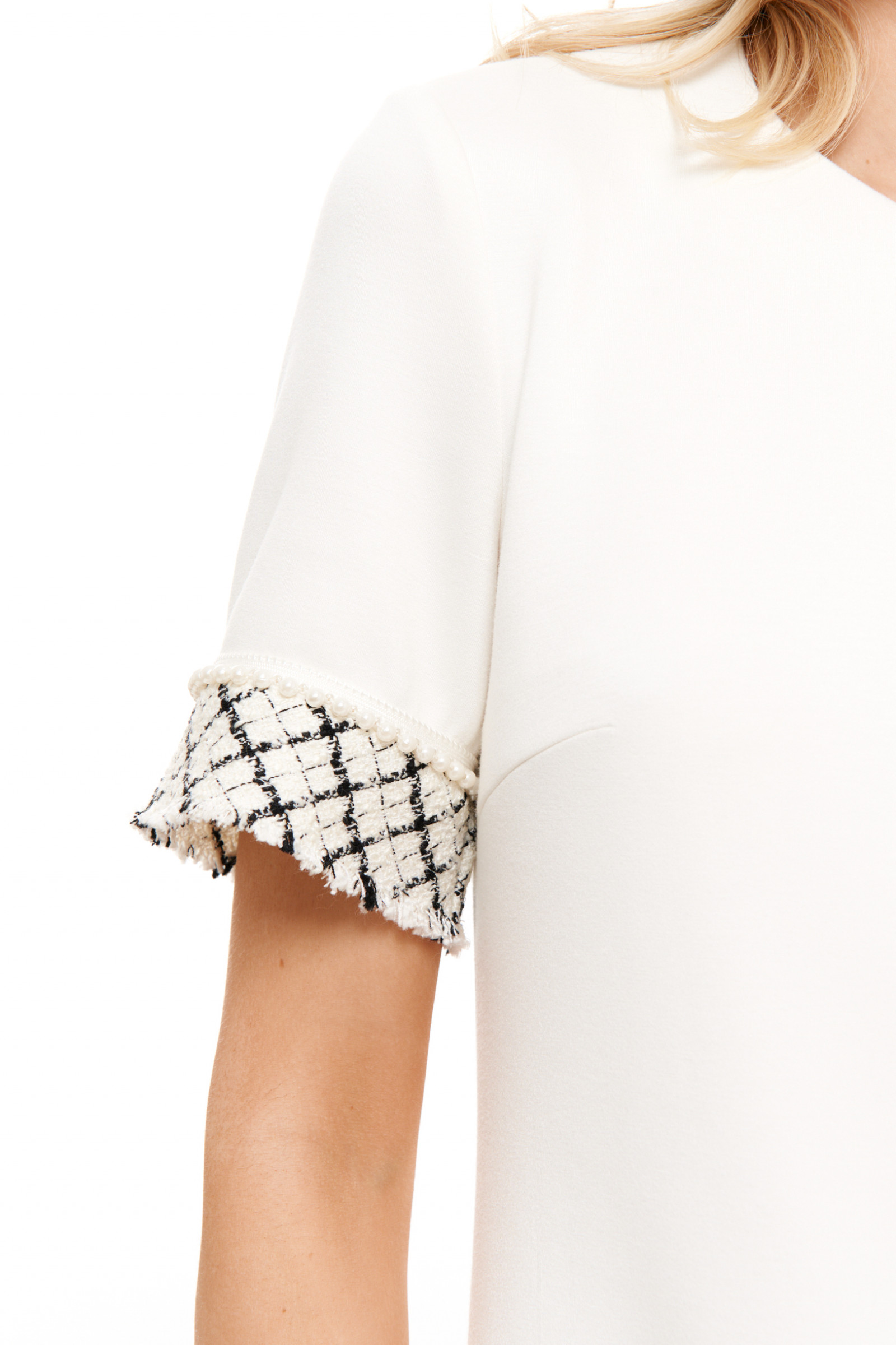 Женское классическое платье из трикотажного полотна – это удачное сочетание элегантности и комфорта. Свободный крой позволяет чувствовать себя уверенно в любой ситуации, будь то повседневная прогулка, офисный день или деловая встреча. Длина выше колена подчеркивает женственность, а декоративная тесьма с контрастным жемчугом делает образ нарядным и стильным.