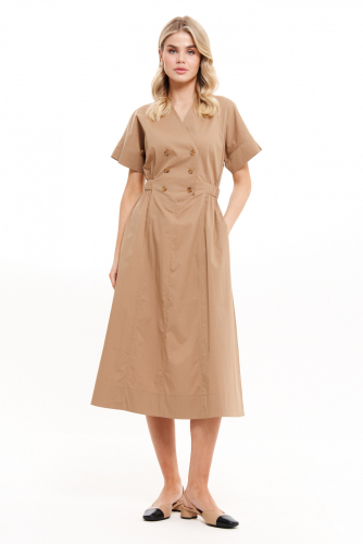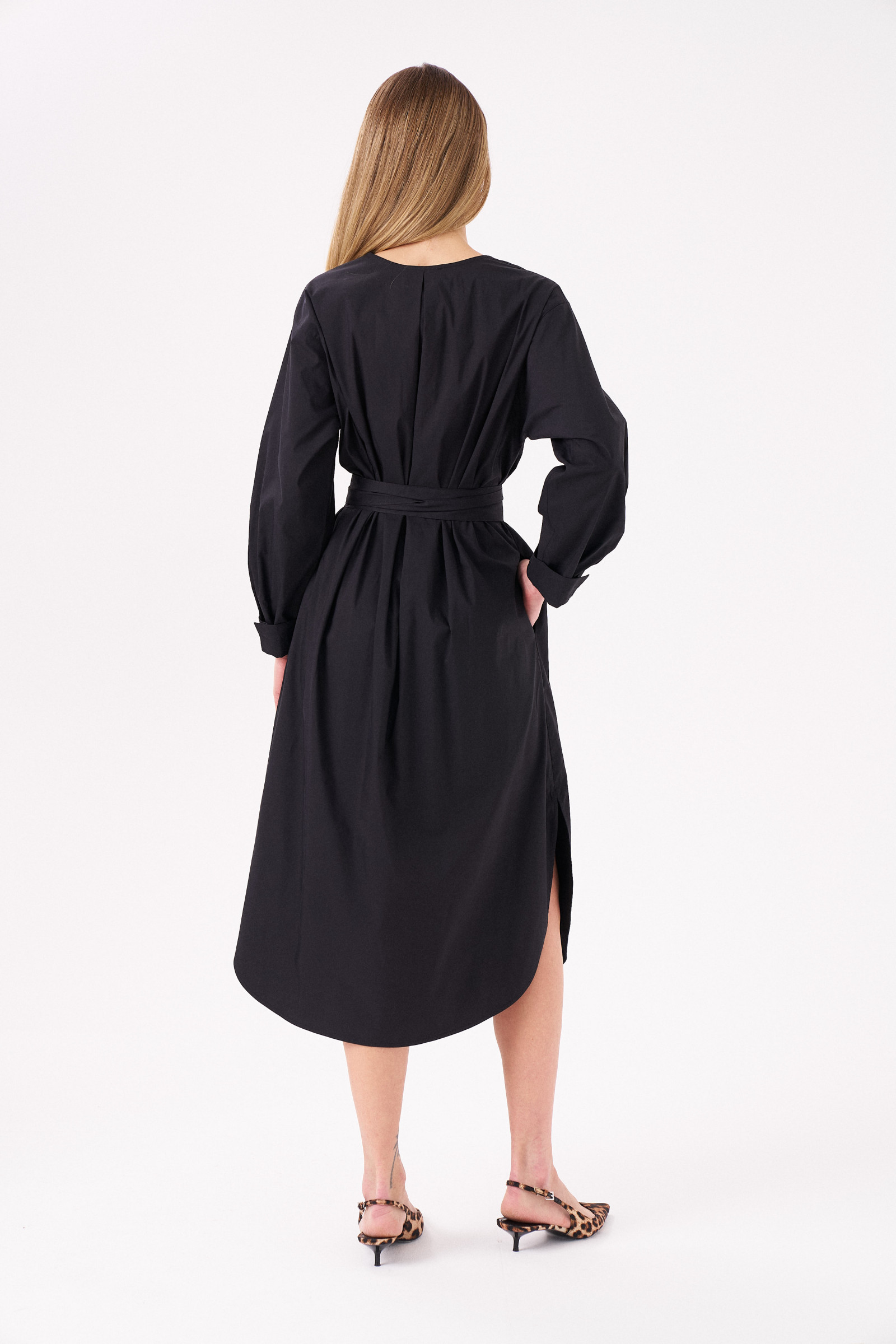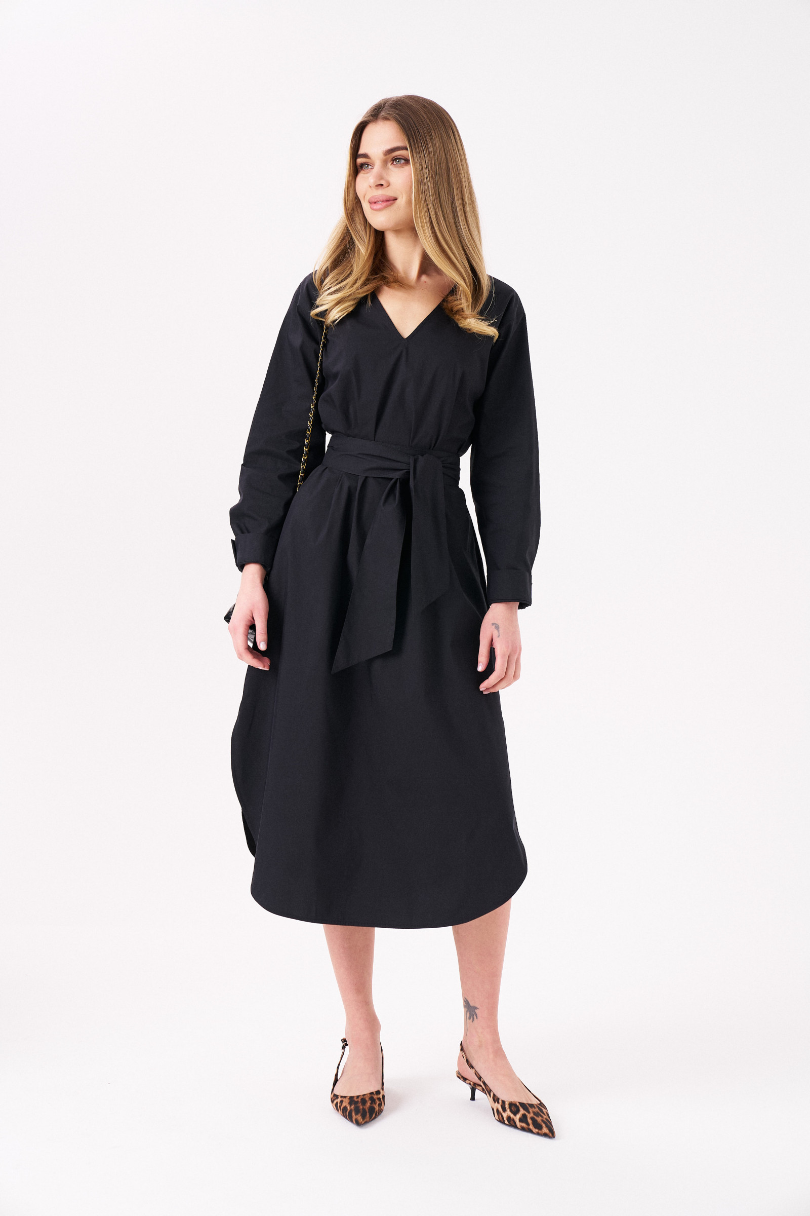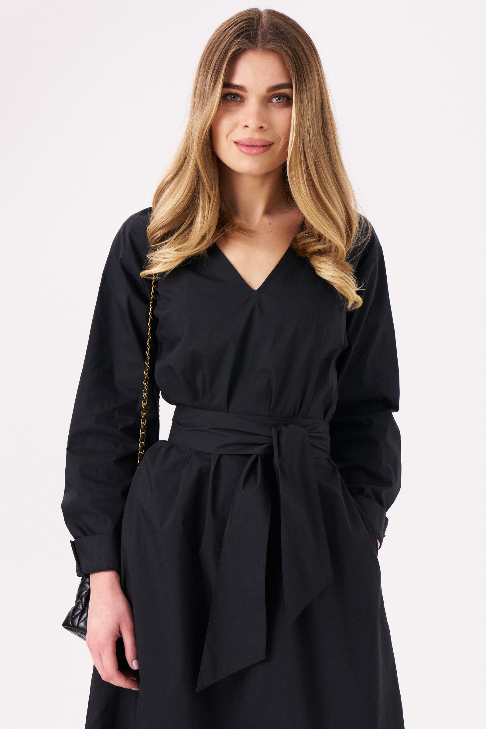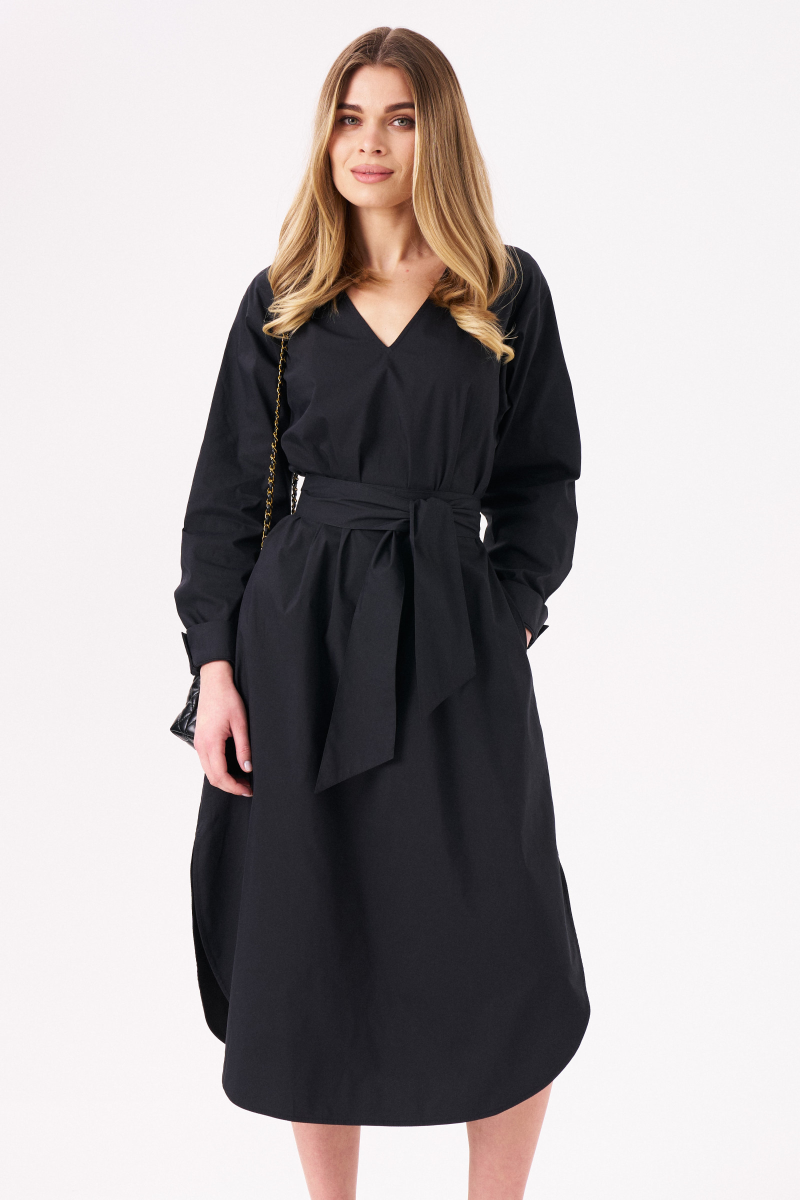 Платье из хлопковой ткани для повседневной носки. Платье прямого силуэта с разрезами в боковых швах. Изделие с длинным втачным рукавом оформленным притачной манжетой. В боковых швах прорезные карманы. Горловина V-образная. От горловины спинки встречная складка. Платье укомплектовано поясом из основной ткани изделия. Длина изделия до середины голени.