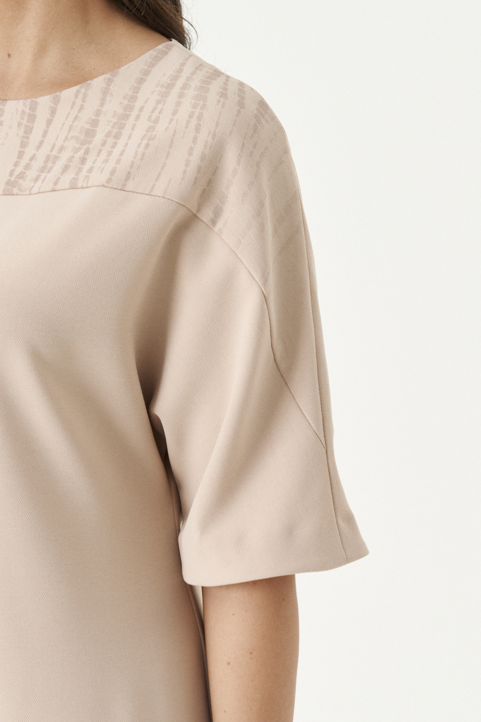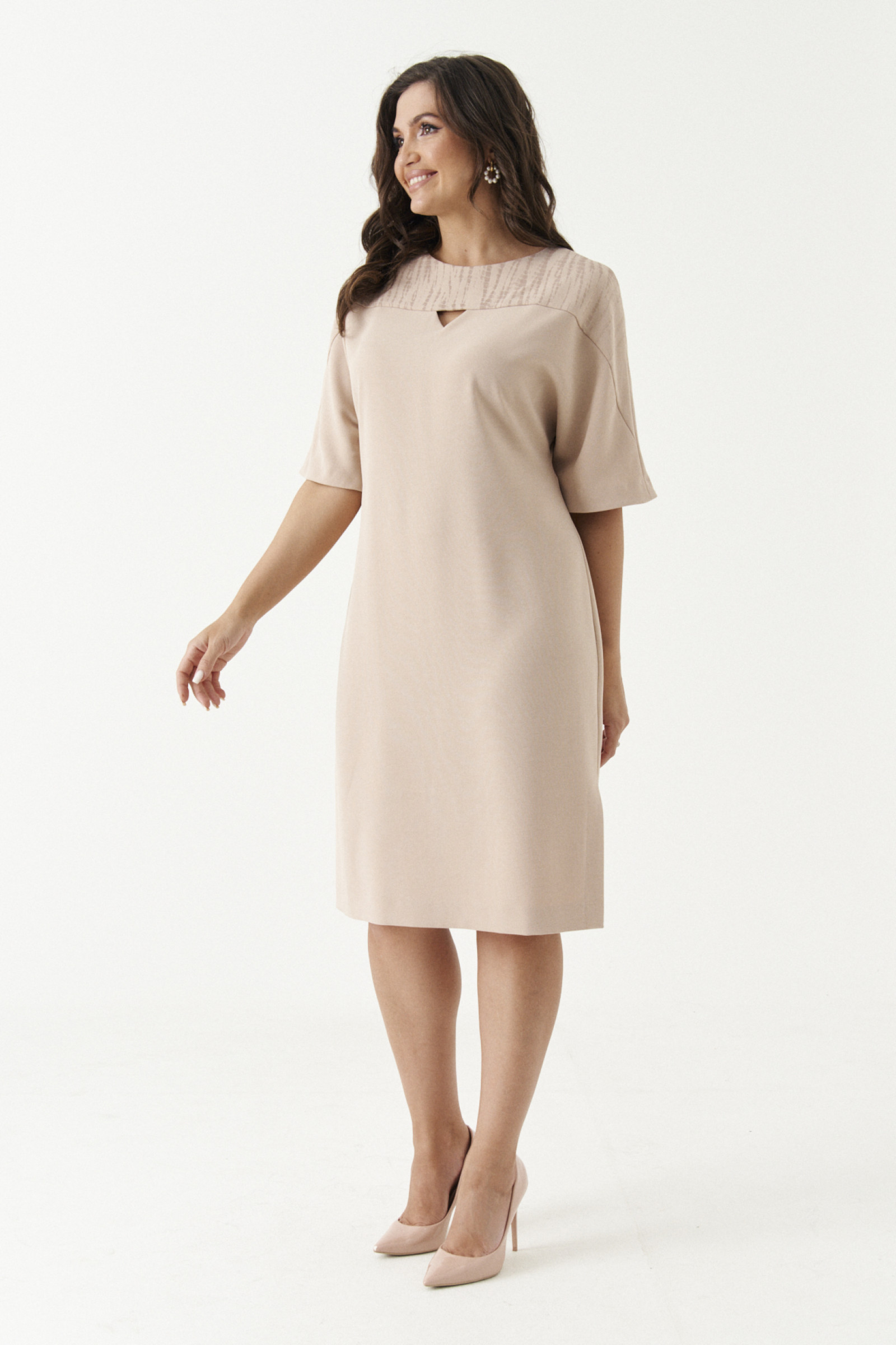 Платье женское из смесовой ткани для повседневной носки прямого силуэта. Перед отрезной с принтом, а также имеется небольшой вырез в виде перевернутого треугольника. Рукава цельнокроеные с принтом. Для придания формы в области талии имеется пояс. Длина изделия чуть ниже колена. Очень красивое и нежное платье для любой прогулки и мероприятия. В данном платье вы будете чувствовать себя комфортно и элегантно.