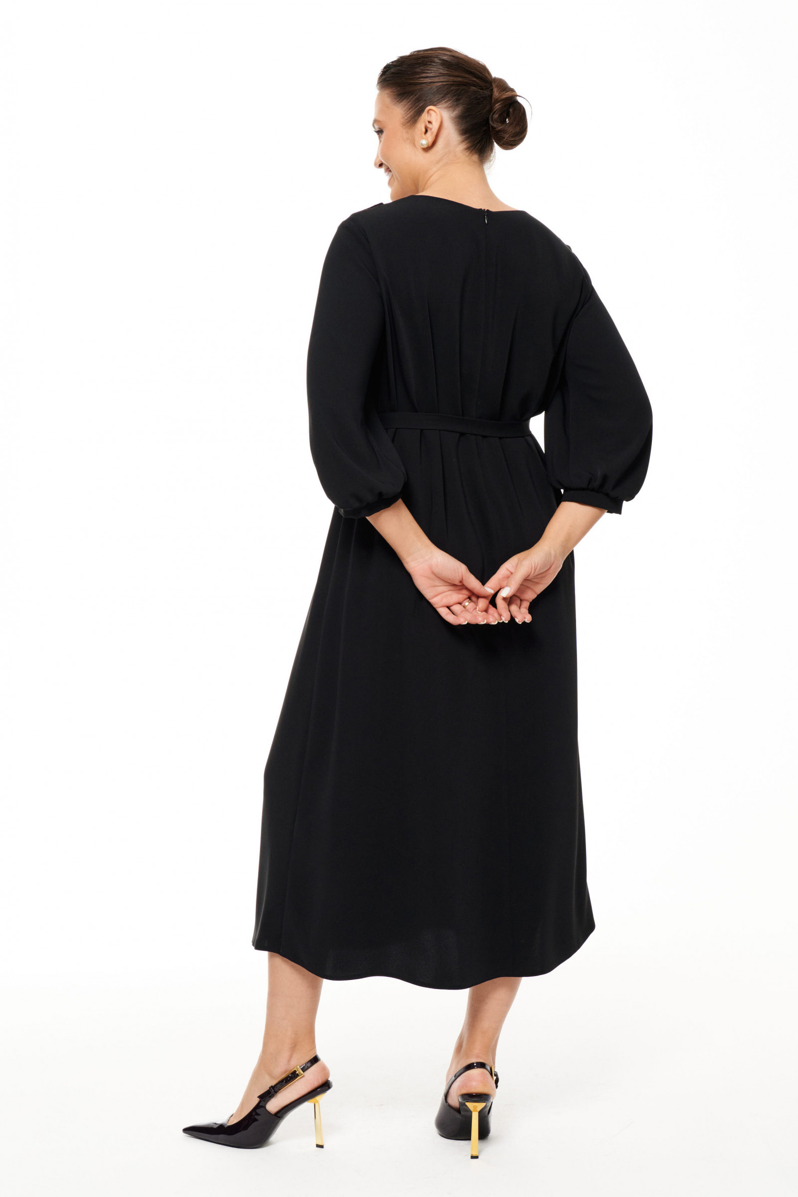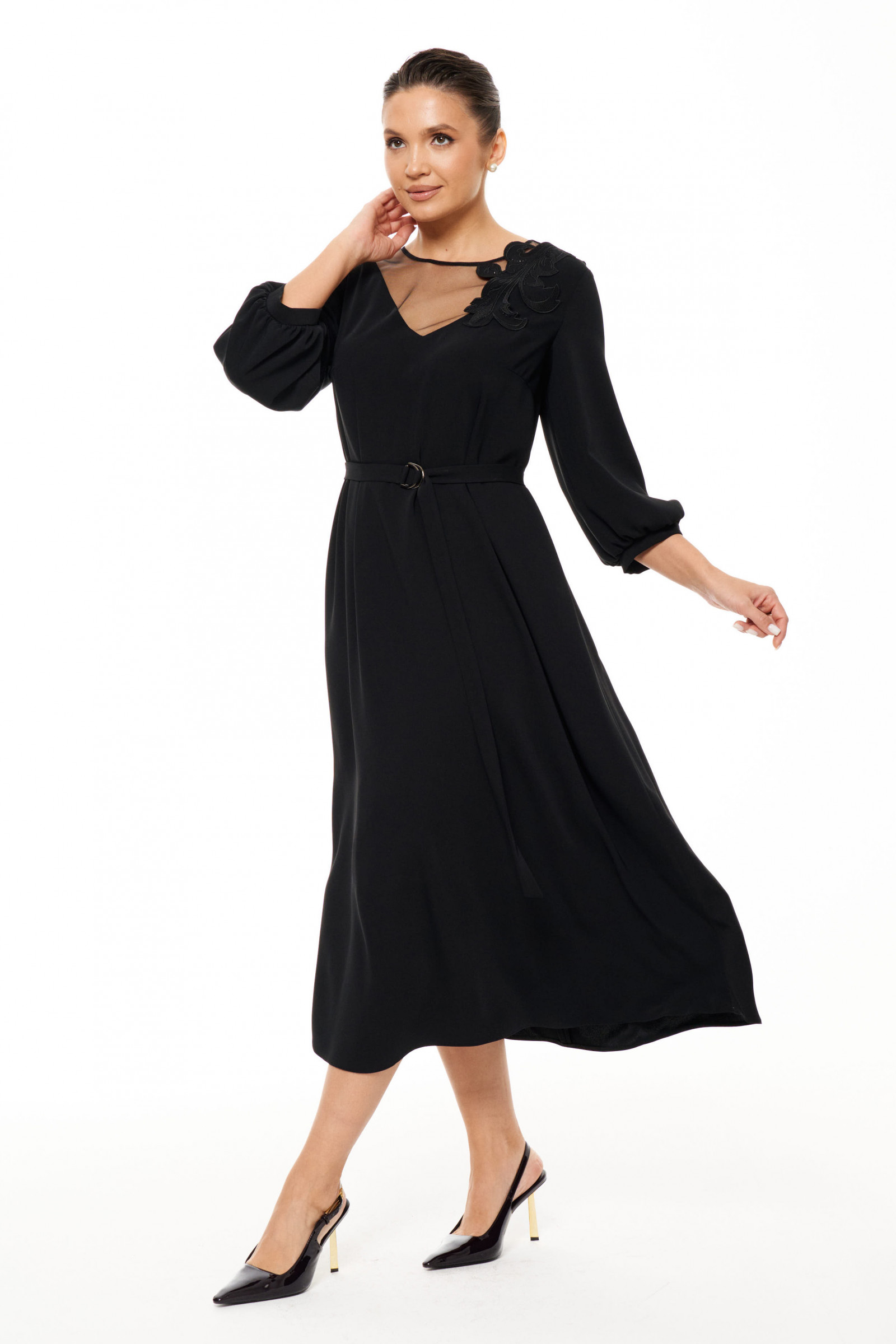 Платье женское прямое из струящейся ткани для повседневной и торжественной носки. Перед имеет две нагрудные вытачки и декоративный узор со стразами. Спинка со средним швом и потайной застежкой-молнией. Горловина круглая со вставкой в виде сетки V-образная. Рукава втачные, чуть ниже локтя, низ рукава со сборкой обработан притачной манжетой. Для придания формы в области талии имеется пояс. Красивое и утонченное платье в котором вы будете в центре внимания, а главное, что вам в нем будет очень комфортно.