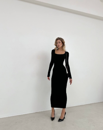 Сочетание чёрного цвета с роскошными переплетением на рукавах и боковом вырезе воплощает в себе роскошь