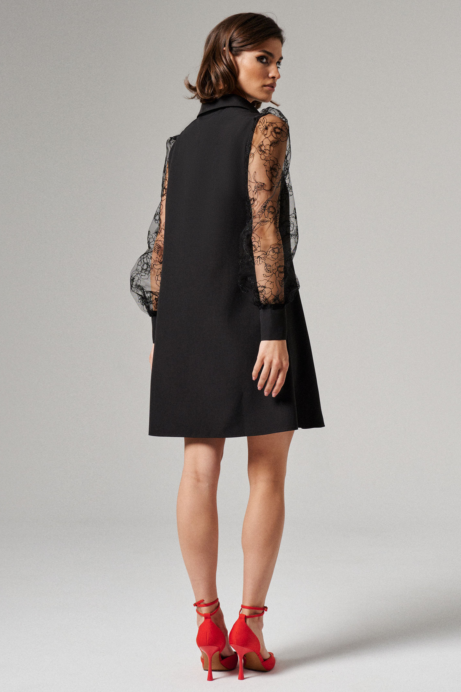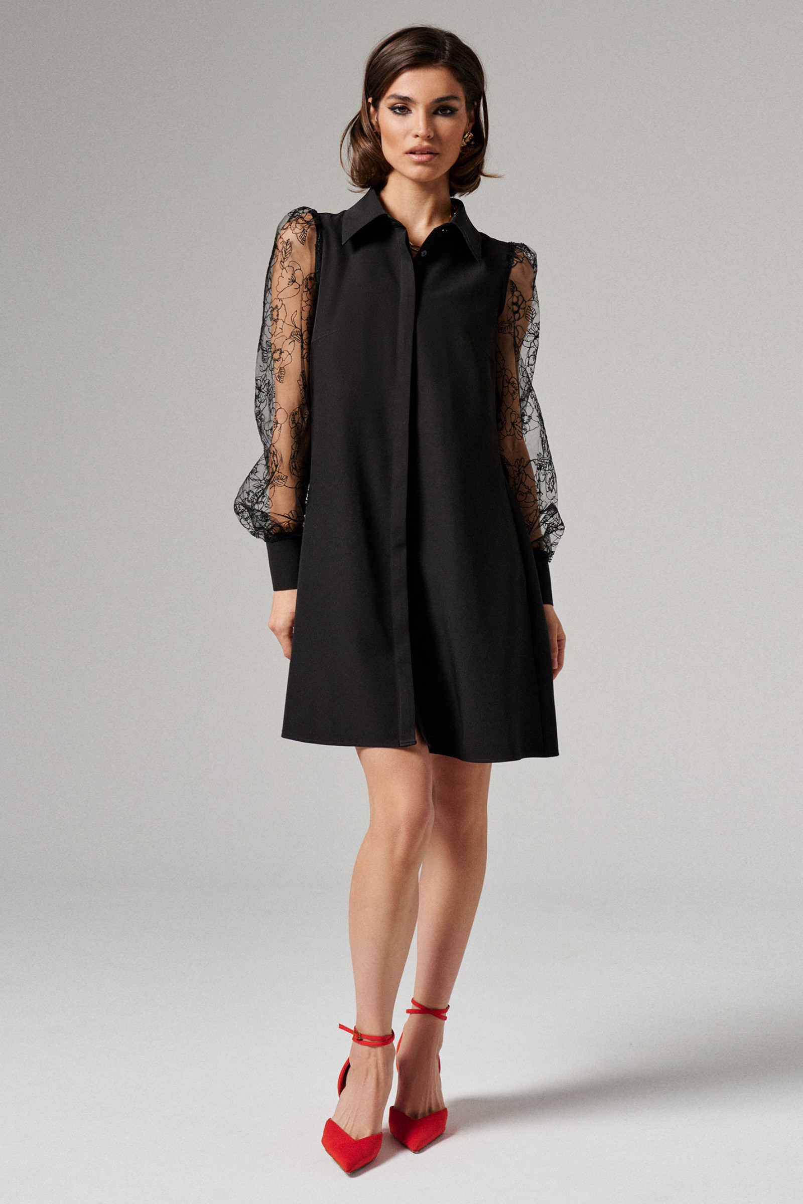 Короткое женское платье с приталенным силуэтом дополнено стильным воротником рубашечного типа и акцентной центральной планкой. Благодаря полупрозрачным рукавам с широкими манжетами платье мини кажется не строгим, а элегантным и очень женственным.