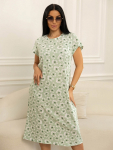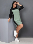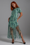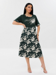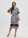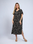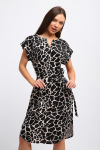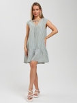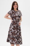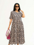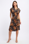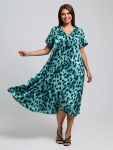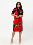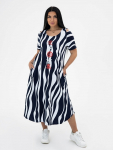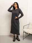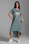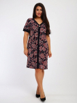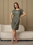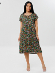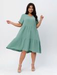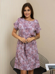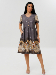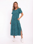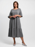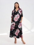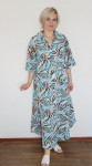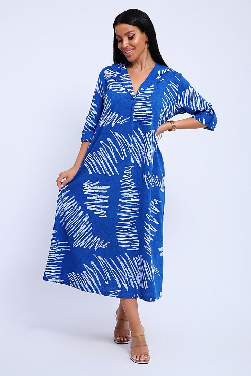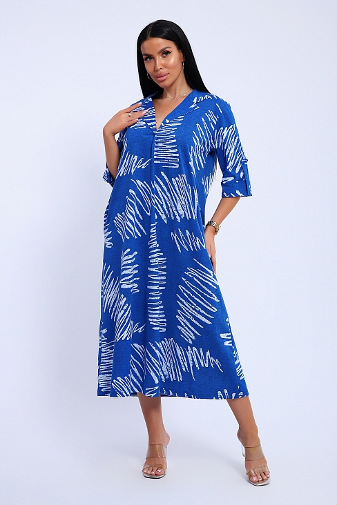 Платье женское свободного покроя. Воротник отложной рубашечного типа, образует V-образный вырез. Платье с карманами в боковых швах. Длина платья чуть выше щиколотки. Рукав 3/4 с манжетой, поднят патой.