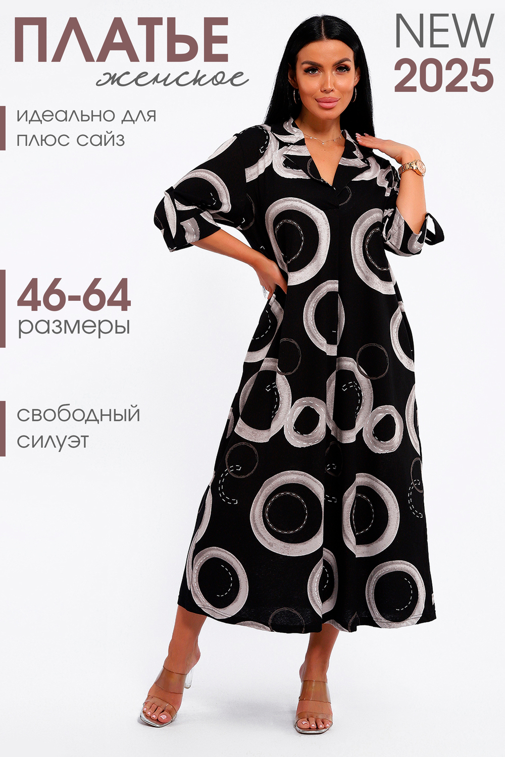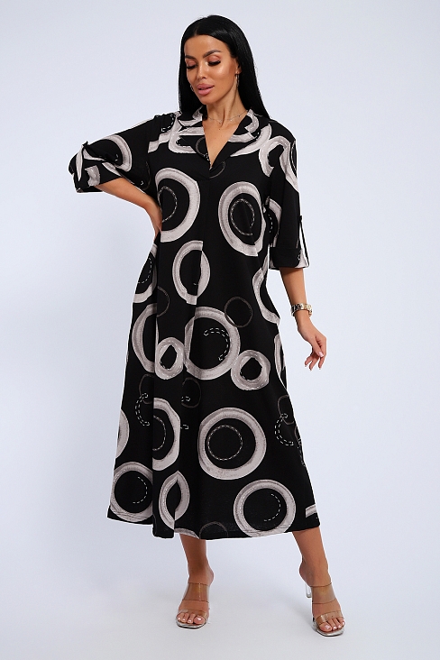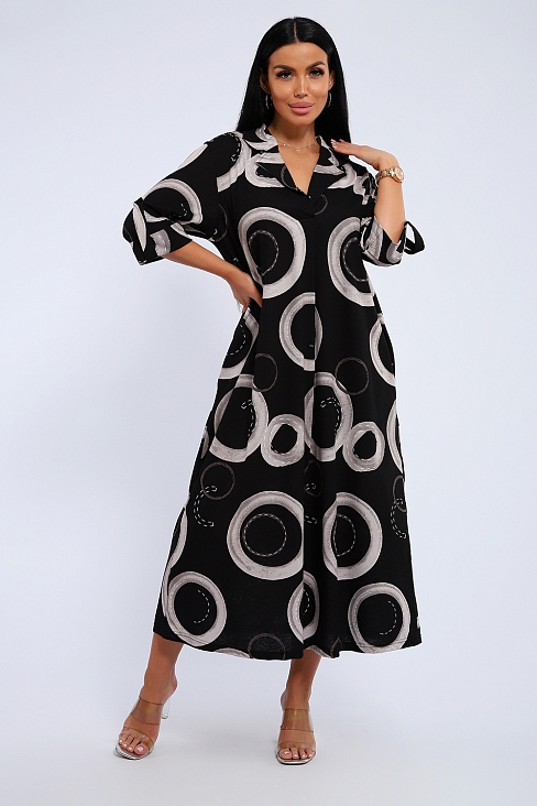 Платье женское свободного покроя. Воротник отложной рубашечного типа, образует V-образный вырез. Платье с карманами в боковых швах. Длина платья чуть выше щиколотки. Рукав 3/4 с манжетой, поднят патой.