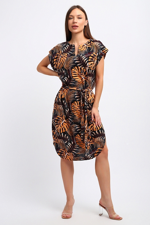 Платье-туника летнее выполнено из трикотажного полотна, кулирка 100% хлопок. Платье полуприлегающего силуэта умеренного объёма с коротким цельнокроеным рукавом. Спинка и полочка цельнокроеные, вырез горловины круглый спереди разрез. Срез горловины спинки и полочки обработан подкроенной обтачкой из основной ткани. Срез проймы обработан манжетой. Длина платья до линии колена, по боковым швам округленные разрезы. Платье имеет пояс. Большой размерный ряд поможет подобрать платье на любую фигуру, для стройных и для полных. Платье подчеркнёт достоинства и скроет недостатки фигуры, подарит комфорт и удобство в жаркий летний день, в отпуске, на пляже.