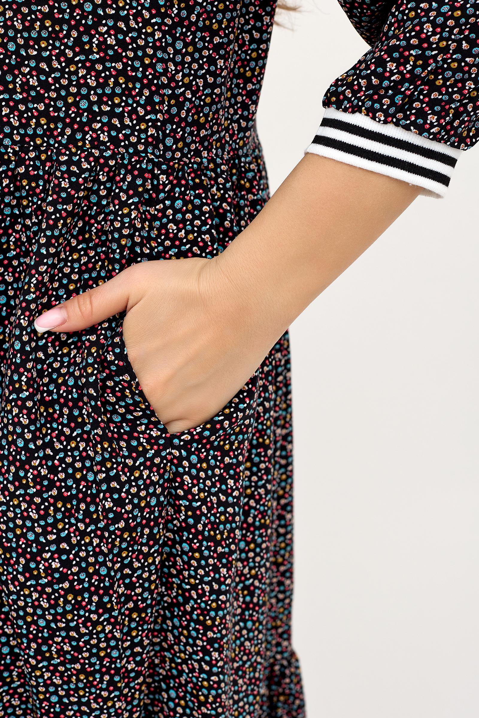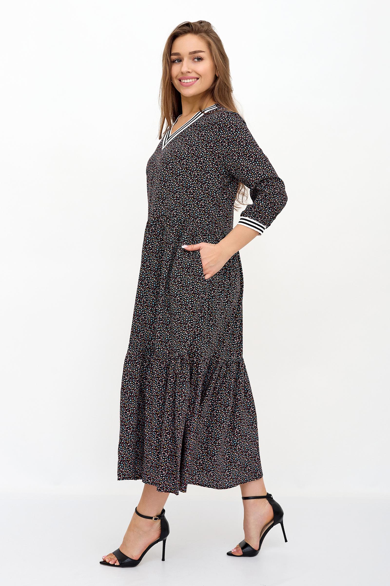 Красивое ярусное платье Ева украсит Вас и дополнит жизнь яркими красками. Красивый контраст в виде черно-белого узора на горловине и манжетах придаст уникальность и индивидуальность наряду. Женственное и элегантное струящееся платье, красиво смотрится на любой фигуре. Красиво сочетается как с жакетом и обувью на каблучке, так и с шляпой и кедами. Универсальное платье на каждый день.