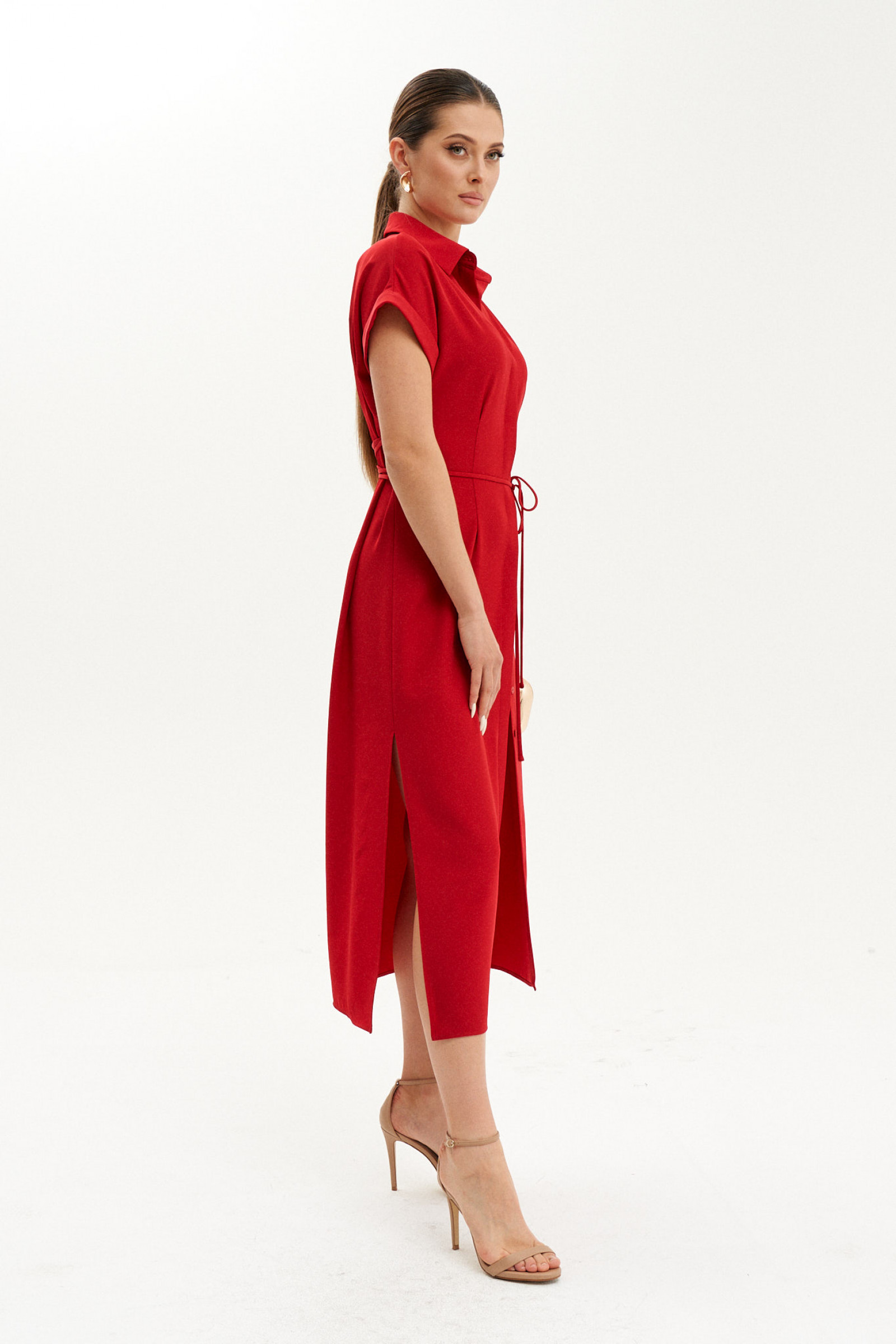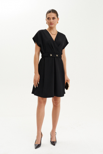 Платье женское из лёгкой струящейся ткани для повседневной носки полуприлегающего силуэта. Перед с талиевыми вытачками. В платье имеется центральная бортовая супатная застежка на обметанные петли и пуговицы. В боковом шве имеются разрезы до низа изделия, а также в области талии располагаются петли, через которые протянута завязка для регулировки талии. Спинка с талиевыми вытачками. Горловина обработана рубашечным воротником на стойке. Рукав цельнокроеный, короткий. Линия плеча слегка спущена. Красивое и очень удобное платье, которое станет вашим фаворитом.
