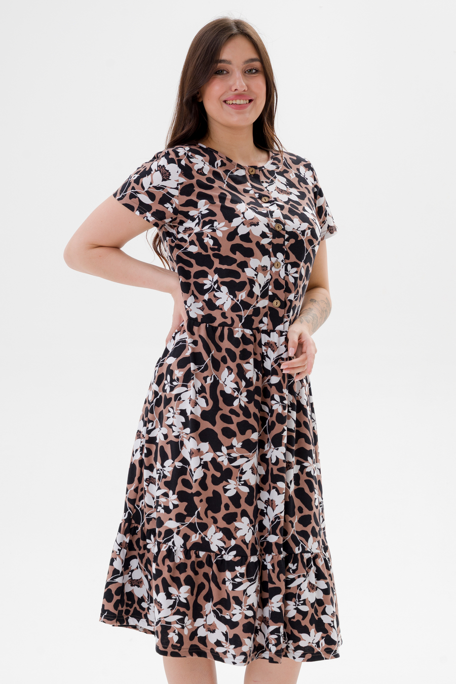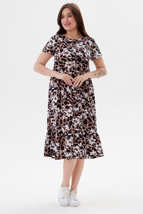 Платье женское из кулирки Кармелита 2 цветок кофе с изящным принтом станет идеальным выбором для жаркого сезона. Оно прекрасно подойдет девушкам больших размеров благодаря свободному крою, который обеспечивает комфорт и свободу движений. Выполненное из 100% хлопка, оно приятно к телу и позволяет коже дышать даже в самые теплые дни. Универсальная одежда отлично смотрится как в повседневных образах, так и в нарядных ансамблях. Платье подойдет для прогулки, отдыха на пляже или домашнего времяпрепровождения. В нем можно отправиться на мероприятие или использовать его как удобный вариант для будущих мам — модель прекрасно сидит благодаря продуманному дизайну.
