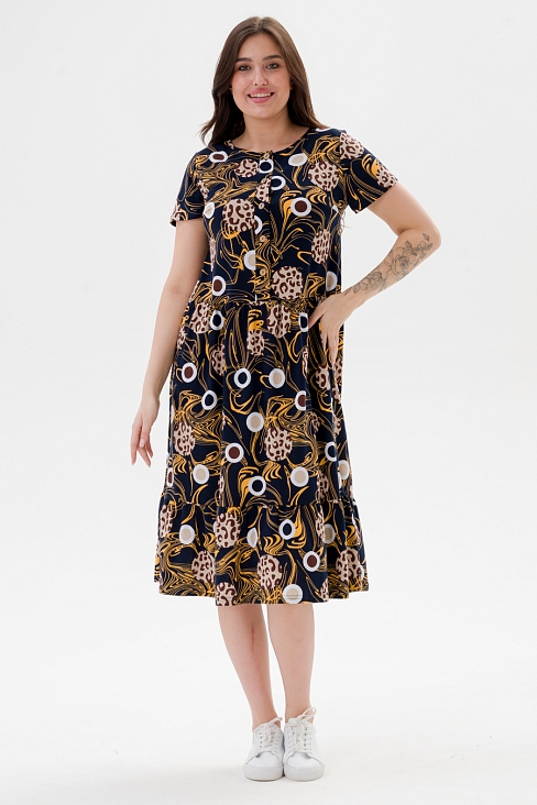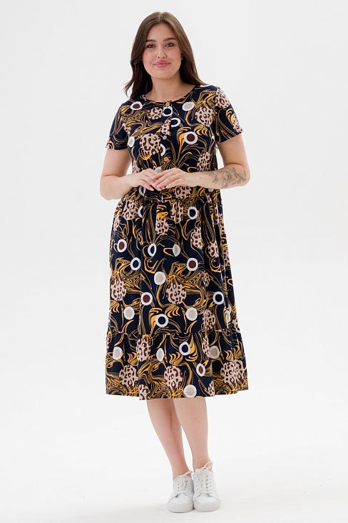Платье женское из кулирки Кармелита 2 кофе на синем с изящным принтом станет идеальным выбором для жаркого сезона. Оно прекрасно подойдет девушкам больших размеров благодаря свободному крою, который обеспечивает комфорт и свободу движений. Выполненное из 100% хлопка, оно приятно к телу и позволяет коже дышать даже в самые теплые дни. Универсальная одежда отлично смотрится как в повседневных образах, так и в нарядных ансамблях. Платье подойдет для прогулки, отдыха на пляже или домашнего времяпрепровождения. В нем можно отправиться на мероприятие или использовать его как удобный вариант для будущих мам — модель прекрасно сидит благодаря продуманному дизайну.