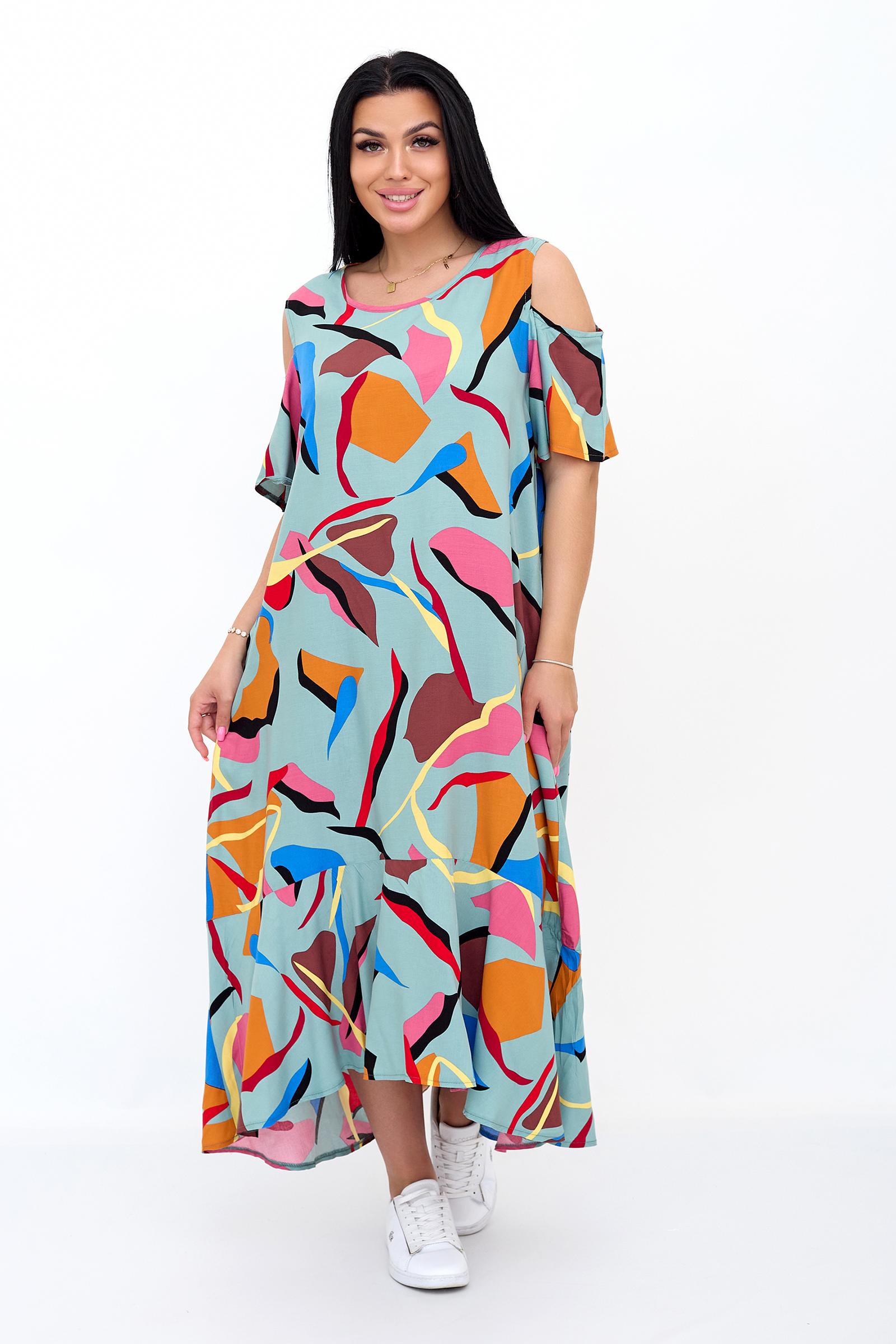 Яркое, красочное летнее платье станет для Вас идеальным вариантом для любого праздника. В нем Вы всегда будете в центре внимания, а Ваш образ – шикарным и ярким. Округлый вырез горловины, рукав три четверти и открытые плечи делают модель уникальной и неповторимой. Удачная посадка подчеркнет красоту женской фигуры и скроет недостатки. Приятная струящаяся ткань, легкий свободный фасон, подчеркнет женственность и красоту. Платье А силуэта с волнами подходит как повседневное, платье на праздничное мероприятие, а также для отпуска и летнего отдыха.