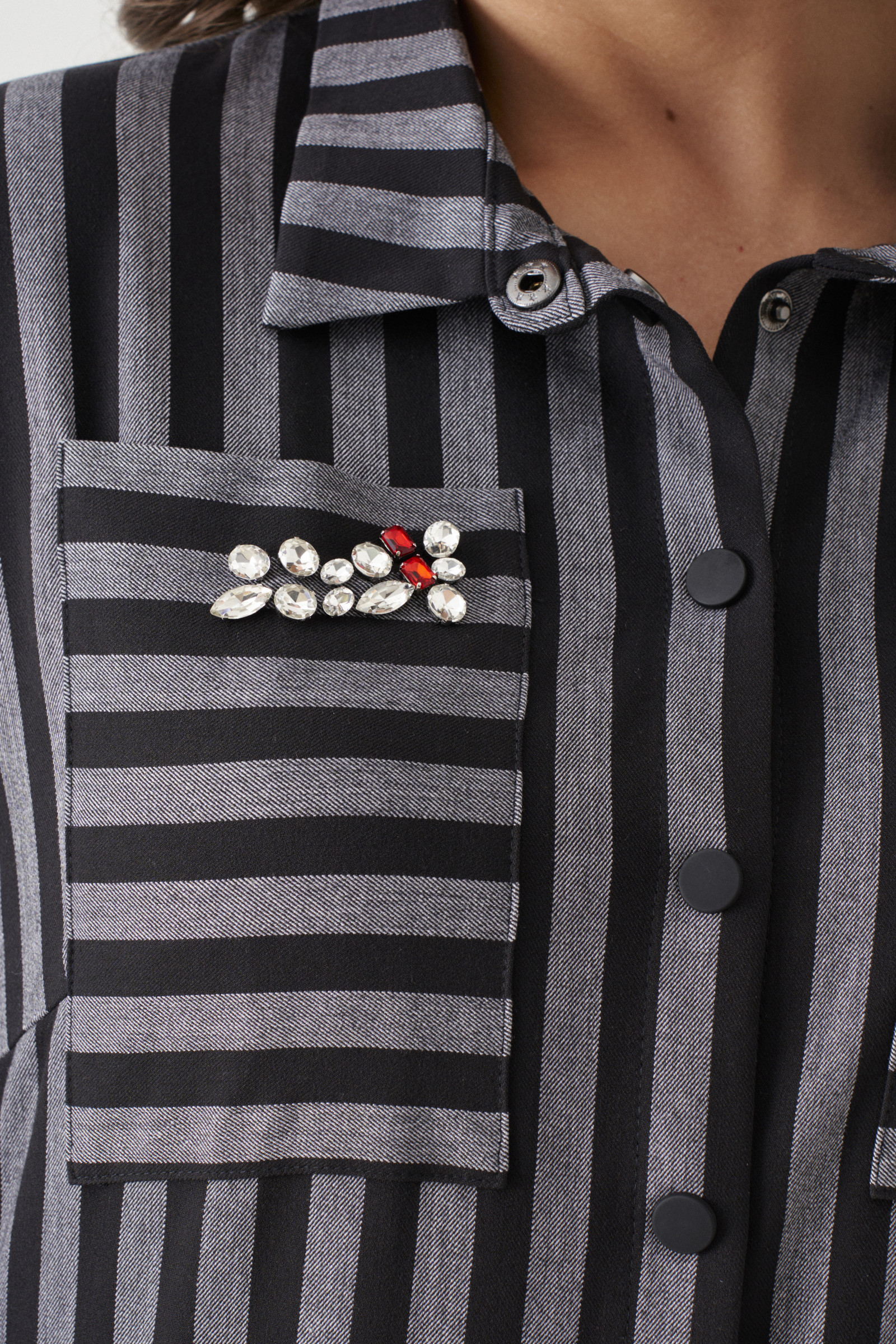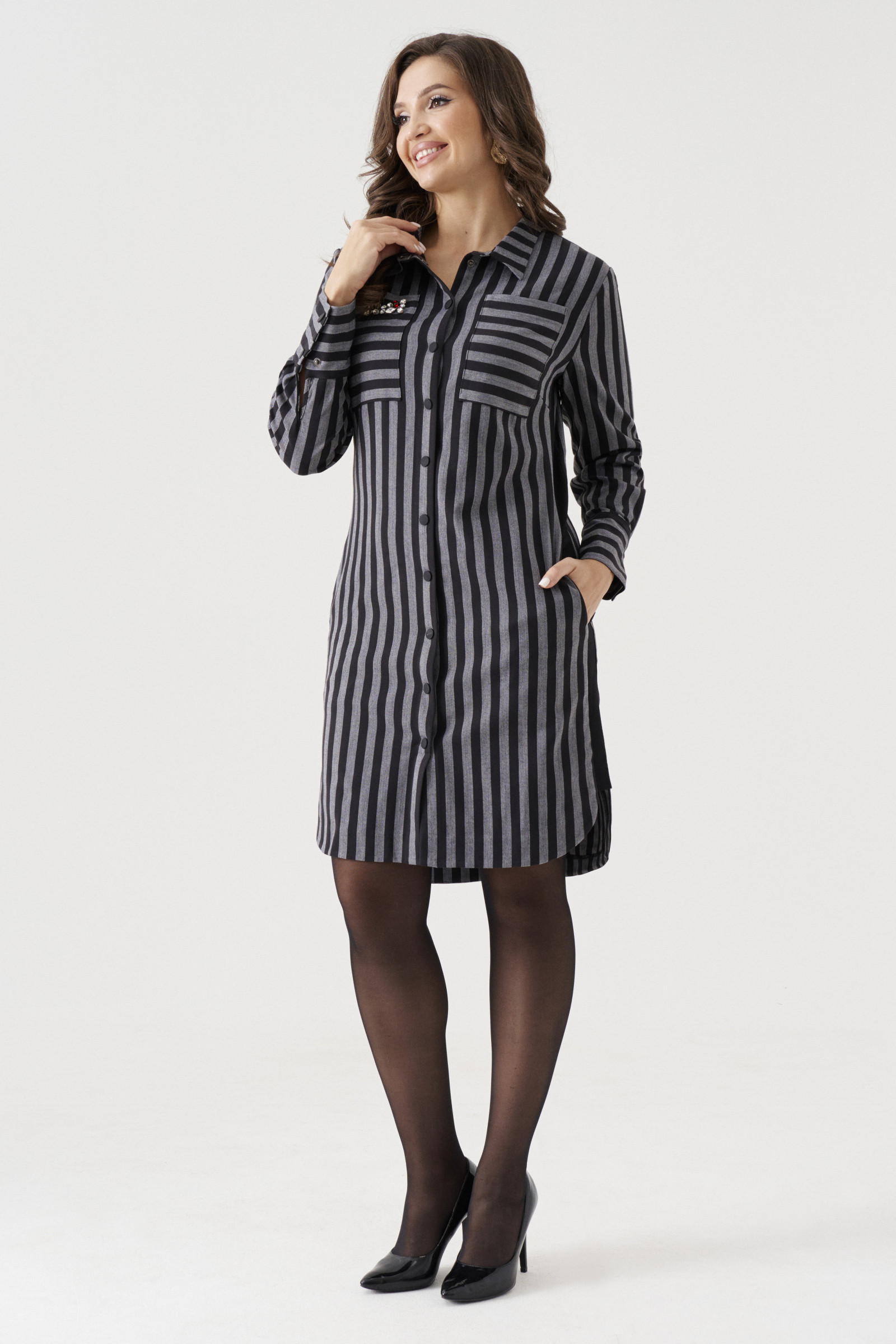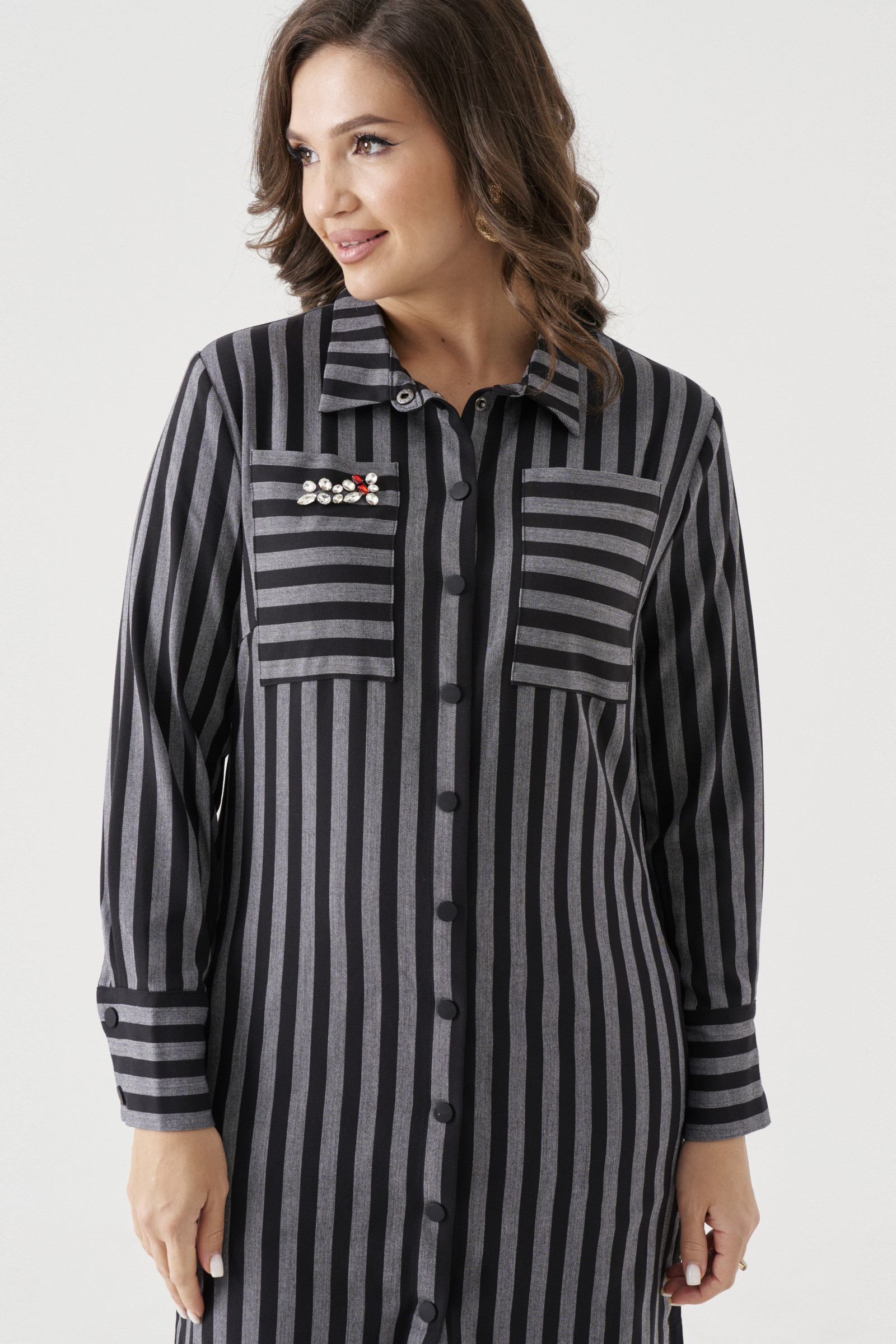 Осеннее стильное платье-рубашка-тренд этого года. Рукав рубашечный,чуть расширенный книзу и прихваченный на высокий манжет.Воротник рубашечный. Форма низа фигурная. Спинка длиннее переда.Трикотажные отрезные бочки дают свободу движениям и визуально стройнят фигуру.Застёжка по переду на кнопки.Два накладных кармана по переду.Правый карман декорирован пришивными стекло-стразами.Игра полоски привносит динамику в образ.