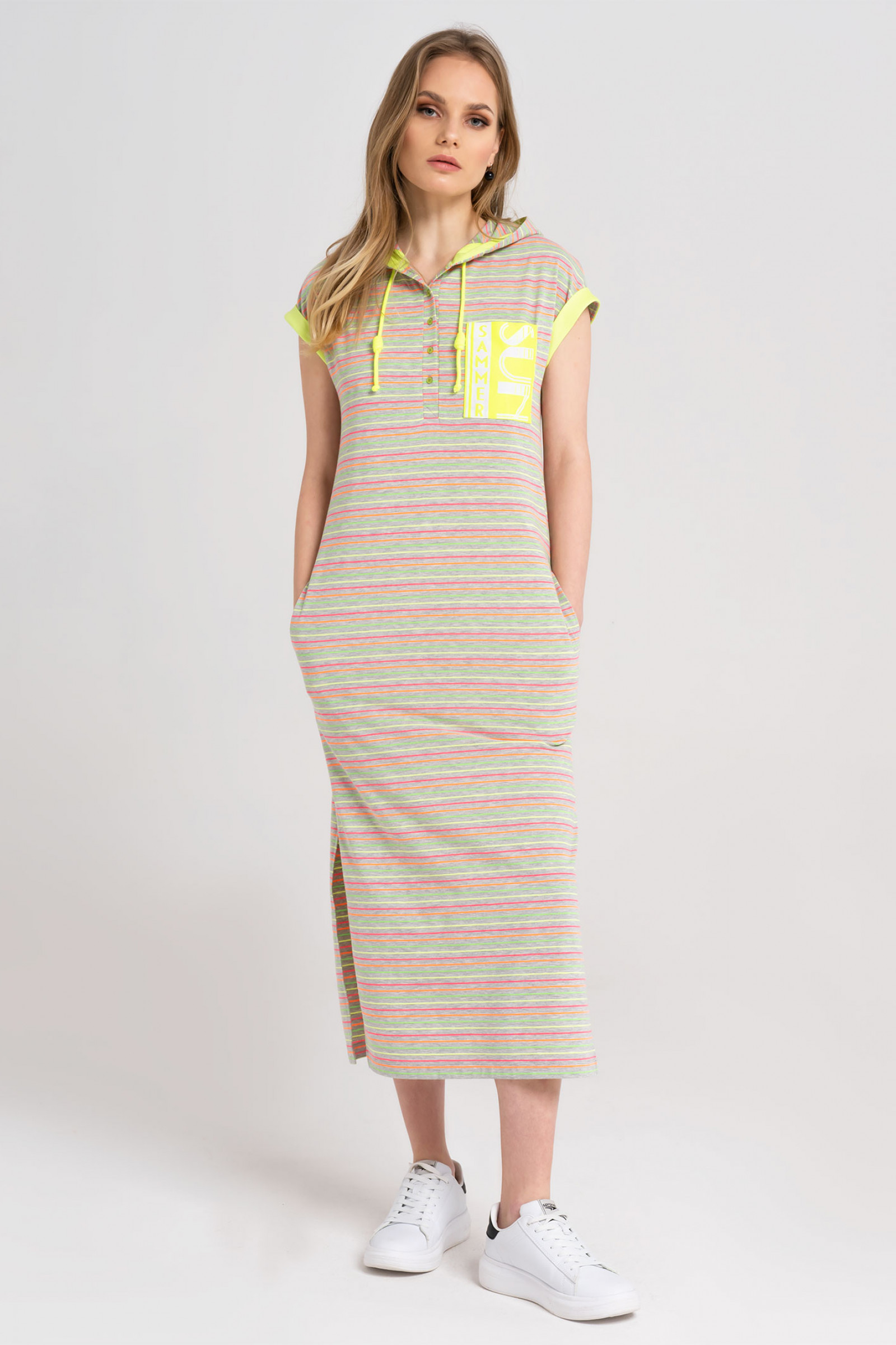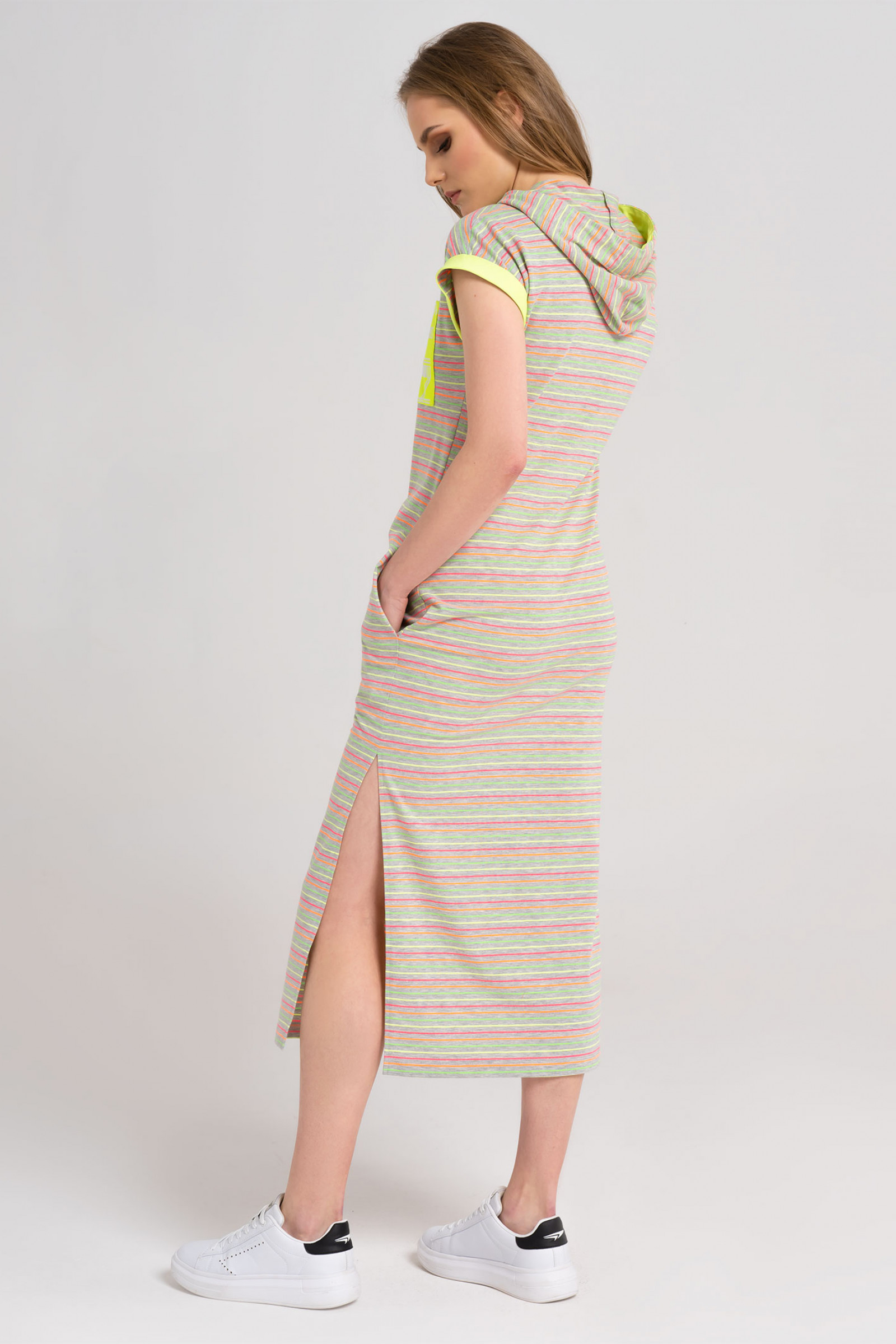 Молодежное платье в спортивном стиле отличный вариант для активного летнего отдыха. Платье длиной "миди" из яркого трикотажного полотна. Платье полуприлегающего силуэта, с капюшоном, с цельнокроенными рукавами, с отложными манжетами. Застежка на планку по горловине на петли и пуговицы. На левой детали переда накладной карман с декоративной печатью. По бокам платья имеются разрезы.