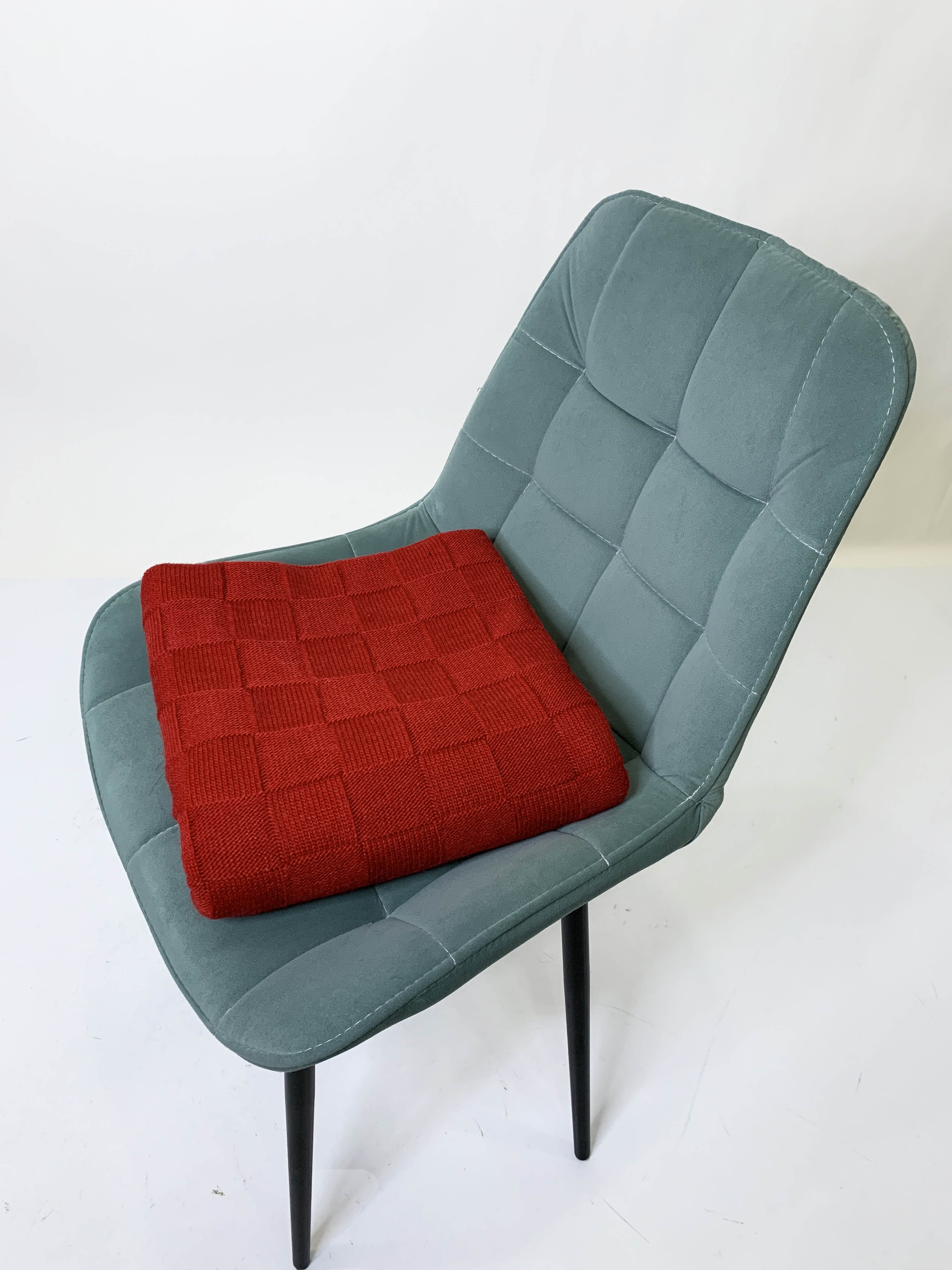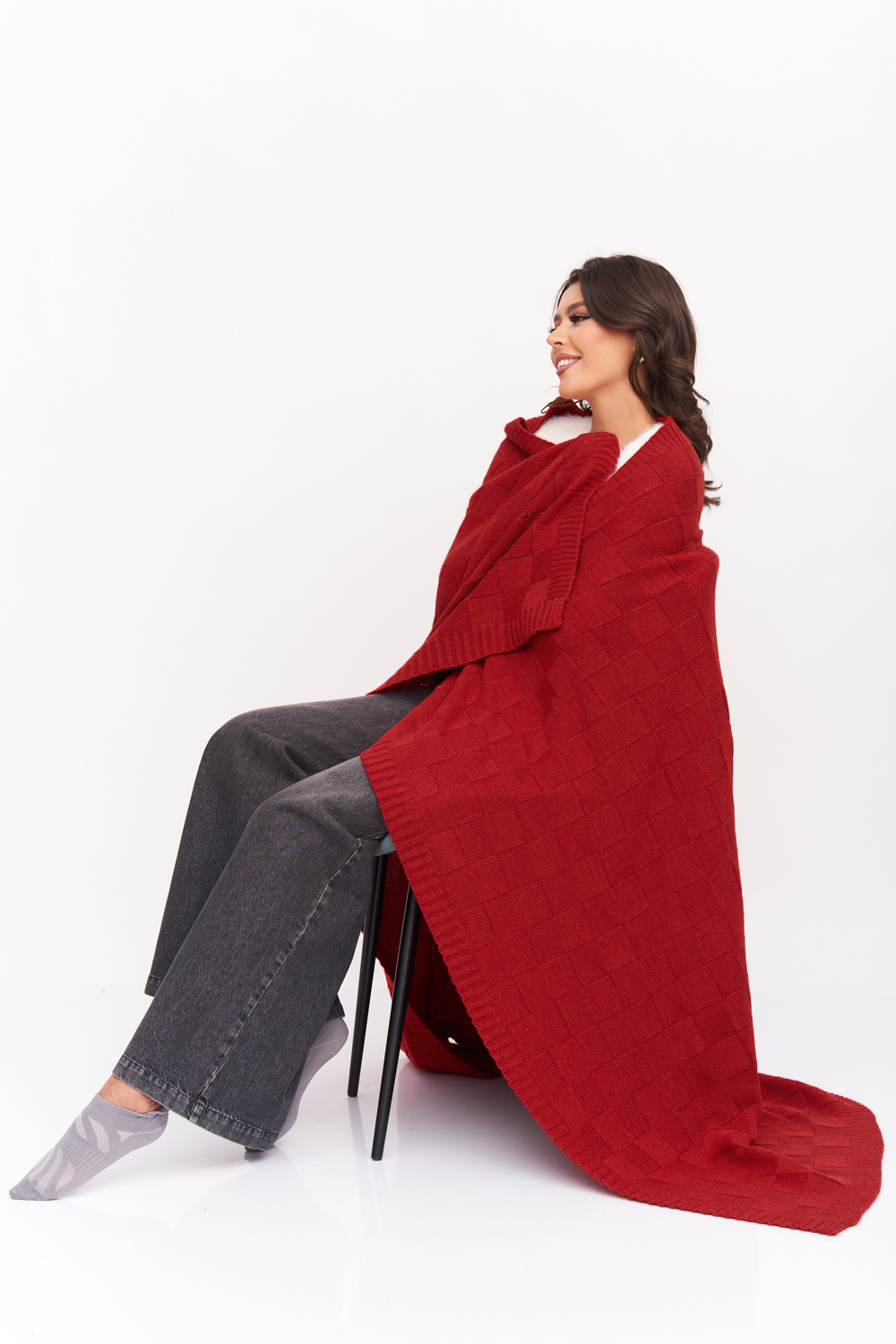 Классический вязанный плед с фактурной вязкой «шахматная доска». Края пледа связаны резинкой, которая отлично держит форму. Этот мягкий и уютный плед согреет вас в прохладную погоду. красный