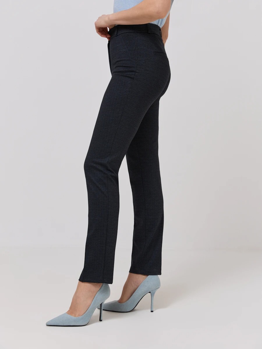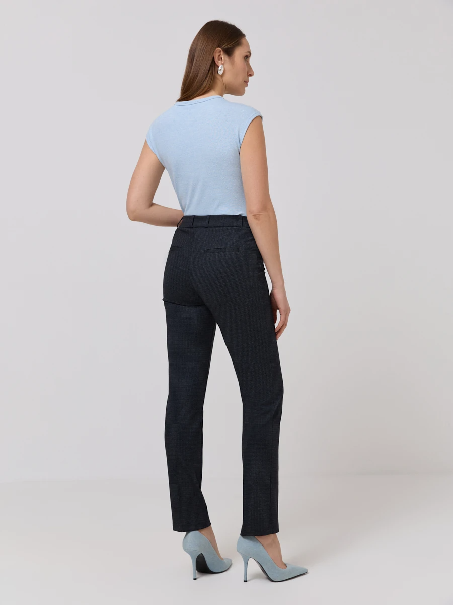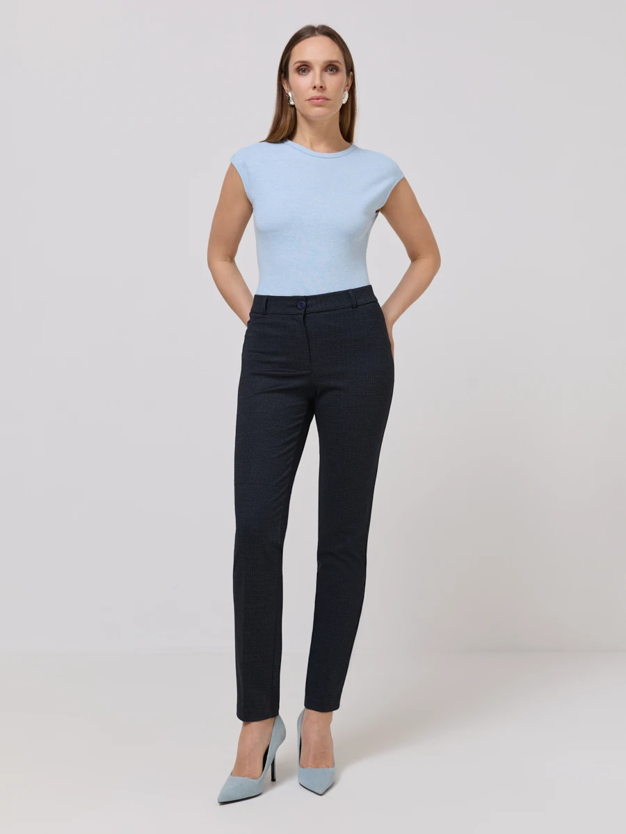 Эти женские брюки со стрелками выполнены в элегантном темно-синем цвете с едва заметным мелким узором, который придает модели стильный акцент и глубину фактуры. Прямой силуэт с зауженными книзу штанинами гармонично подчеркивает фигуру, создавая утончённый образ. Классическая посадка и застежка на пуговицу и молнию обеспечивают комфортную посадку, а прорезные карманы сзади дополняют аккуратный, лаконичный вид.