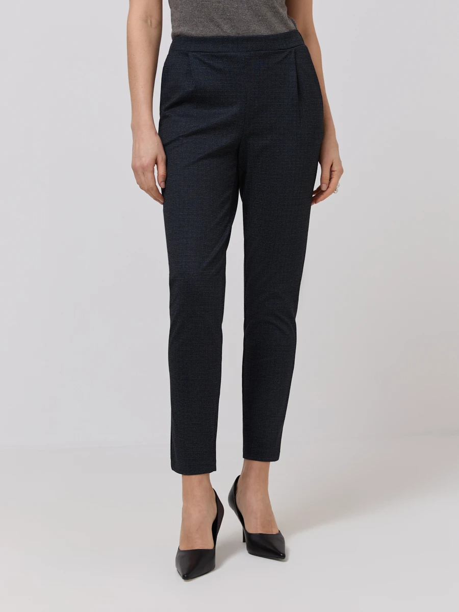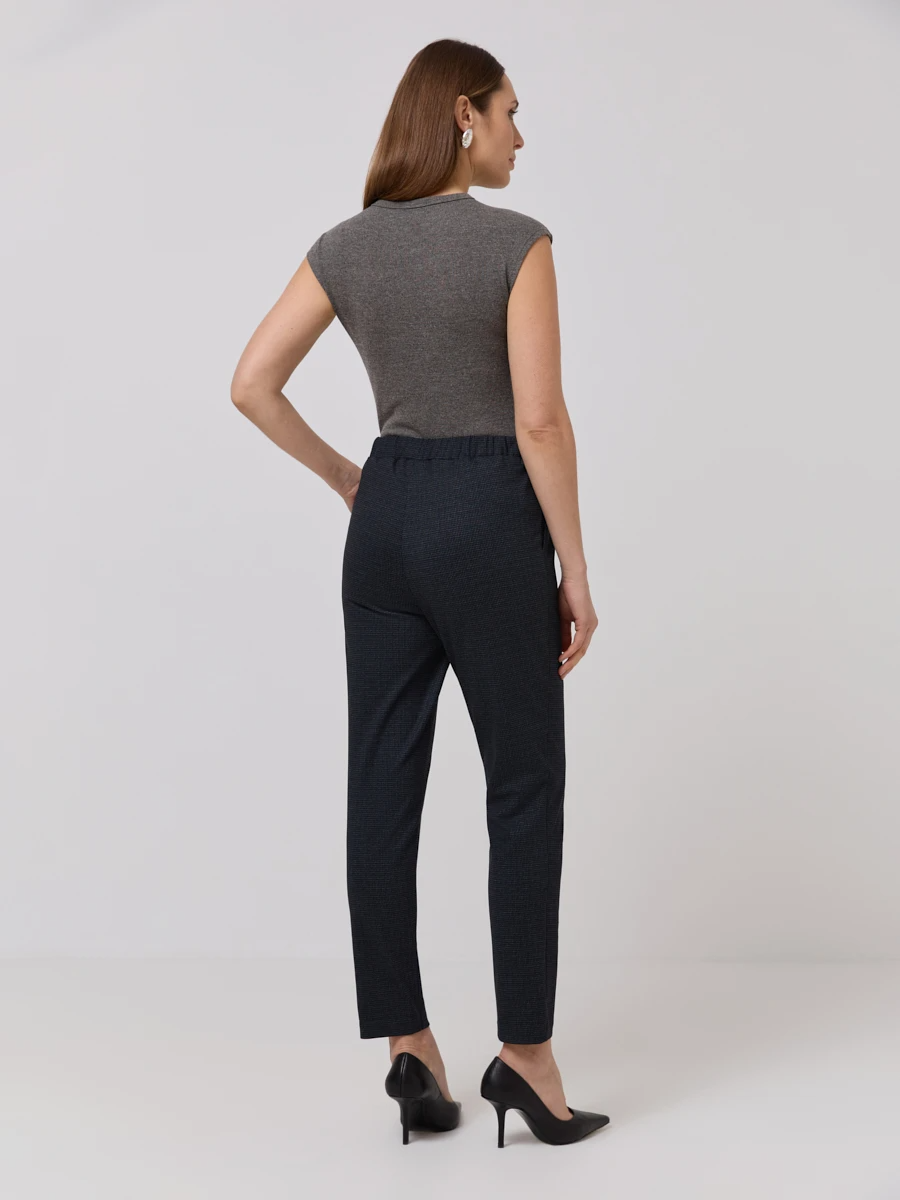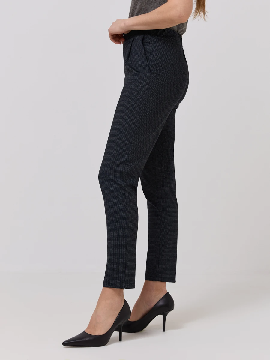 Минималистичный крой и слегка укороченная длина делают эту модель универсальной: брюки легко комбинируются как с блузами и жакетами, так и с повседневными топами и обувью на каблуке. Тёмно-синий цвет с тонким клетчатым узором добавляет элегантности и визуальной глубины, не перегружая образ. Отличный выбор для женщин, ценящих стиль, комфорт и практичность в одном предмете гардероба.