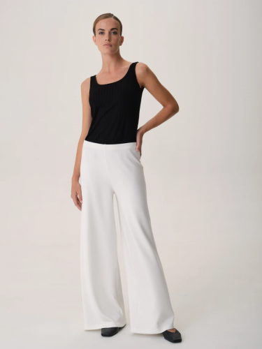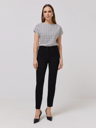 Зауженные женские брюки тёмно-синего цвета — это современное решение для повседневного или офисного гардероба. Модель выполнена из эластичной ткани, которая сочетает полиэстер, вискозу, нейлон и эластан, обеспечивая отличную посадку и свободу движений. Посадка средней высоты, широкая притачная резинка на поясе и аккуратные защипы спереди подчеркивают комфорт и актуальность дизайна. Брюки не имеют застежек и дополнены боковыми карманами, что делает их особенно удобными.