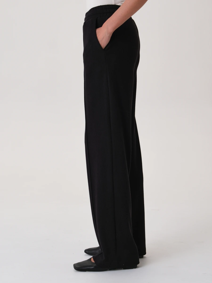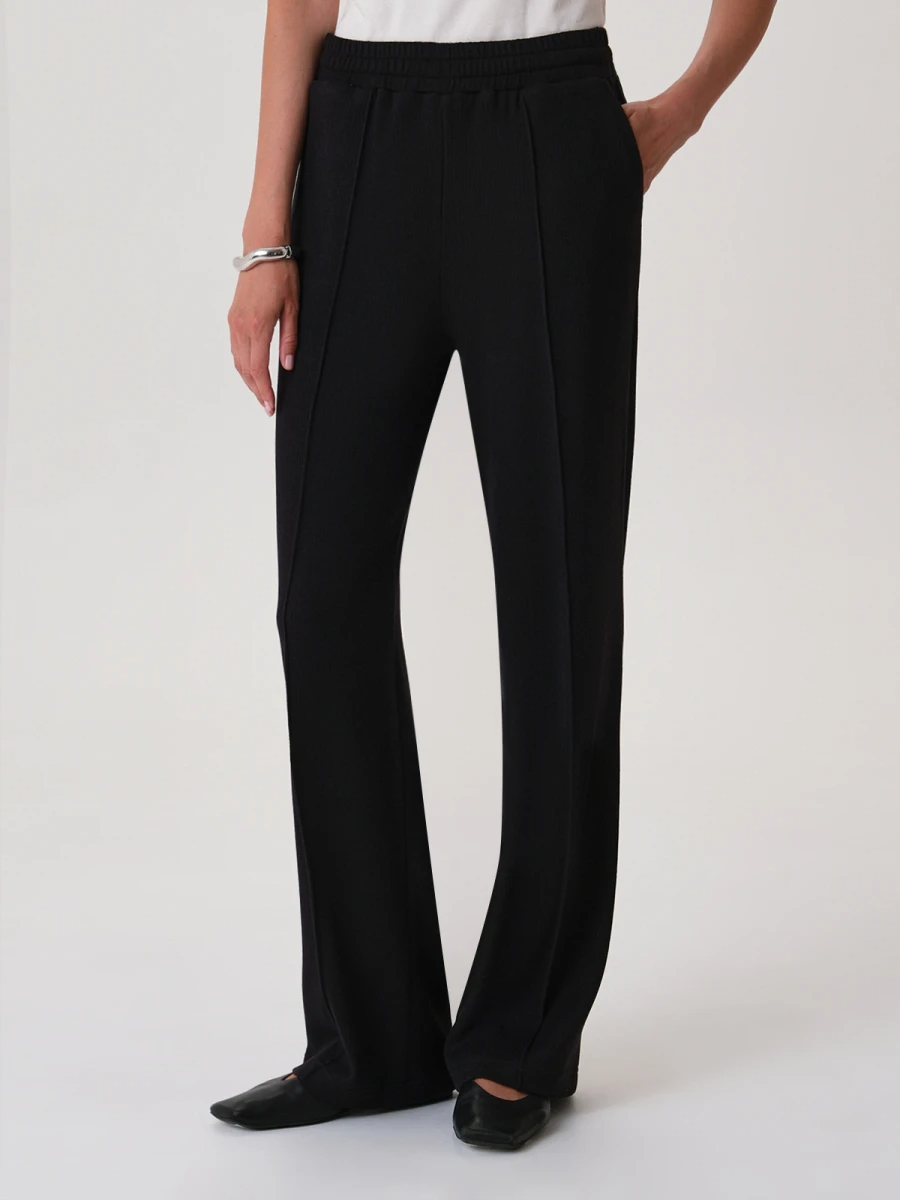 Базовые трикотажные брюки прямого кроя в универсальном черном цвете. Данная модель сочетает в себе стиль и комфорт. Широкий пояс на высокой посадке оснащен эластичной резинкой с деликатной степенью натяжения. Спереди имеются вместительные функциональные карманы и простроченные вертикальные стрелки. Брюки отлично сочетаются как с тонкими лонгсливами и топами, так и с объемными свитерами. Идеальный вариант для уютных повседневных образов.