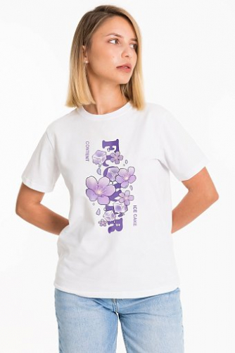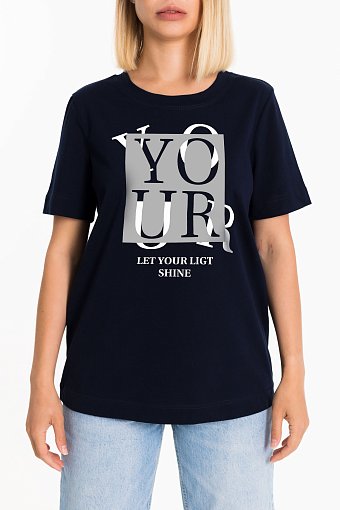 Футболка из однотонной кулирки, 100% хлопок. С коротким втачным рукавом и притачной планкой по горловине. Спереди нанесён принт.