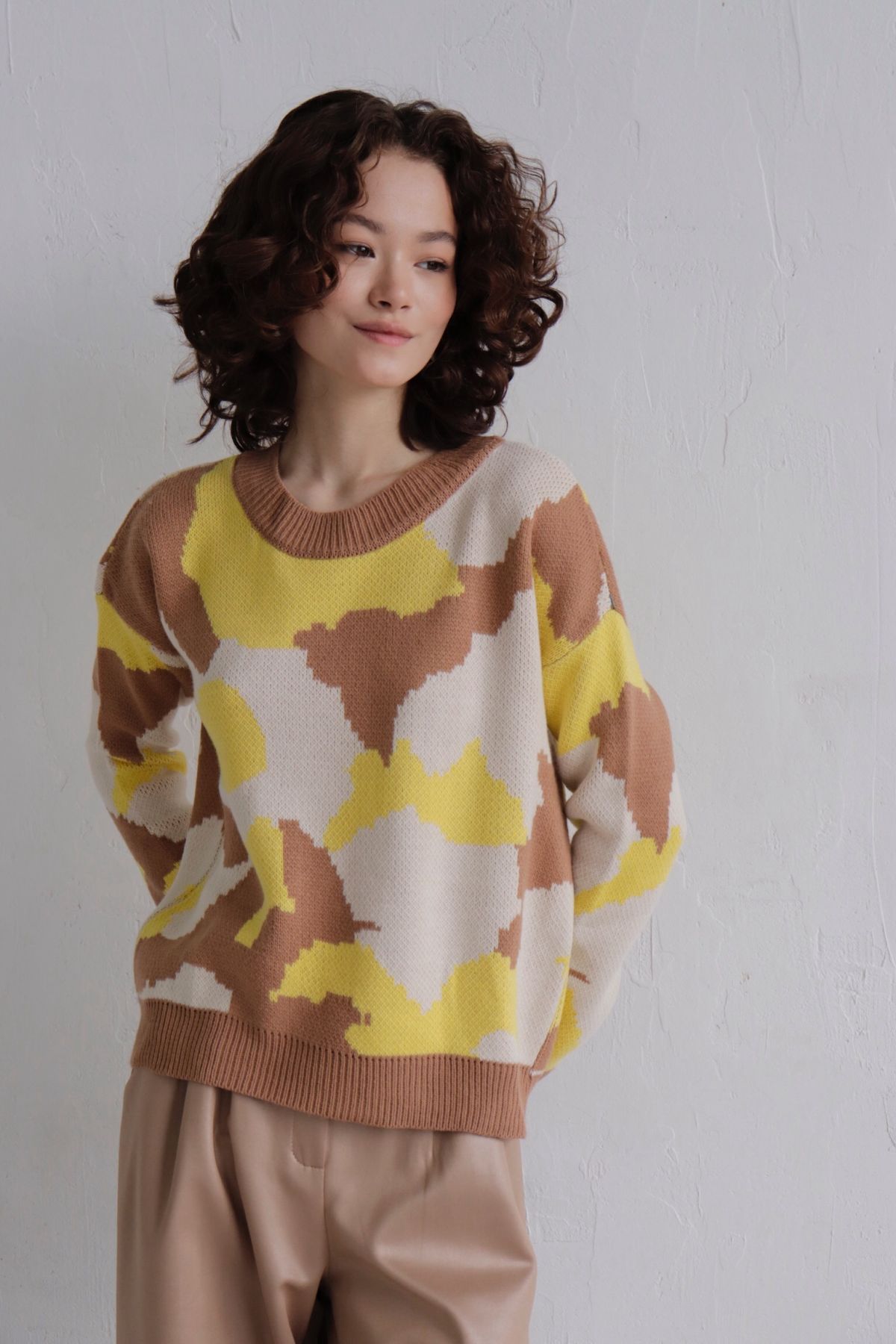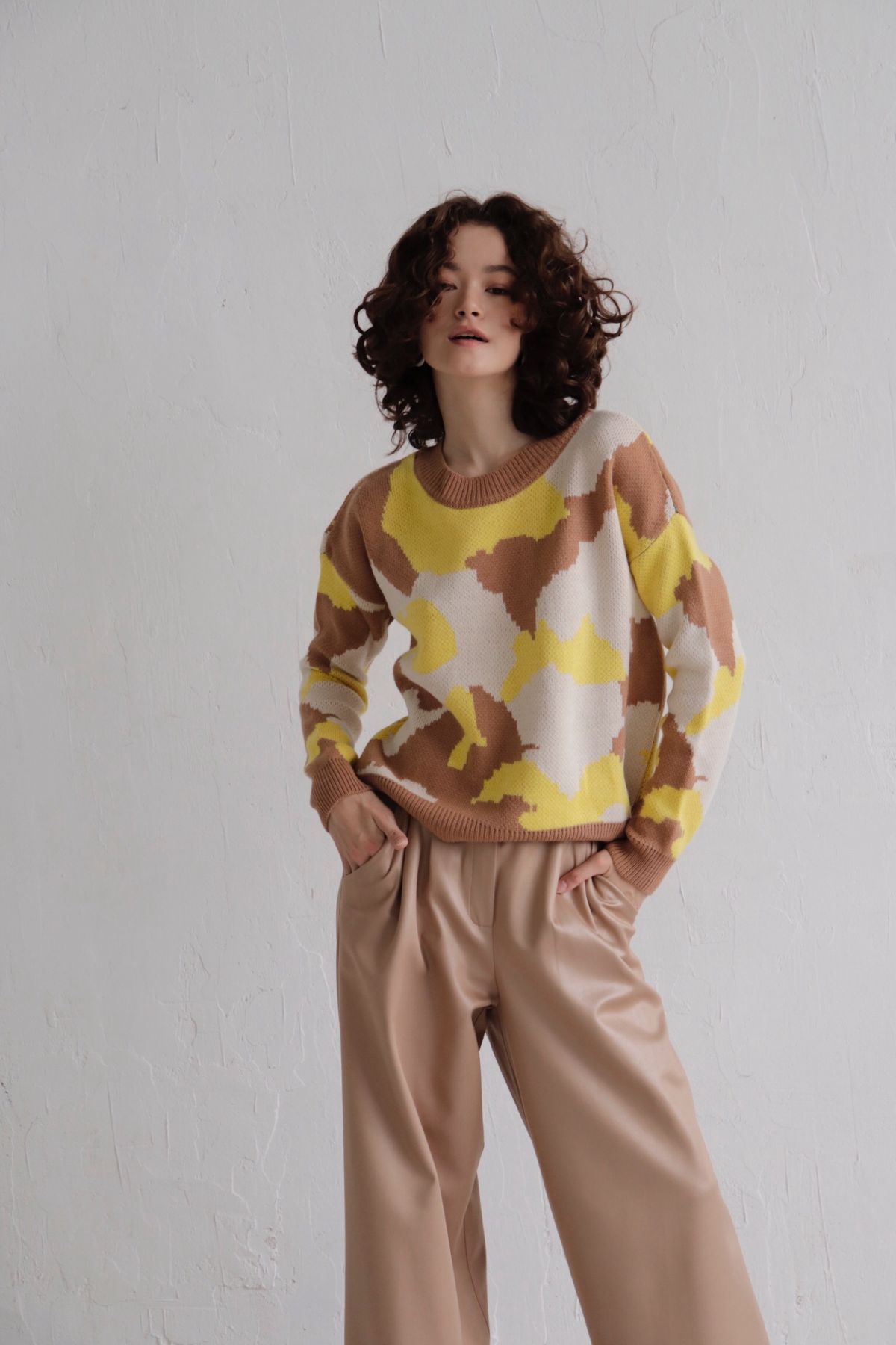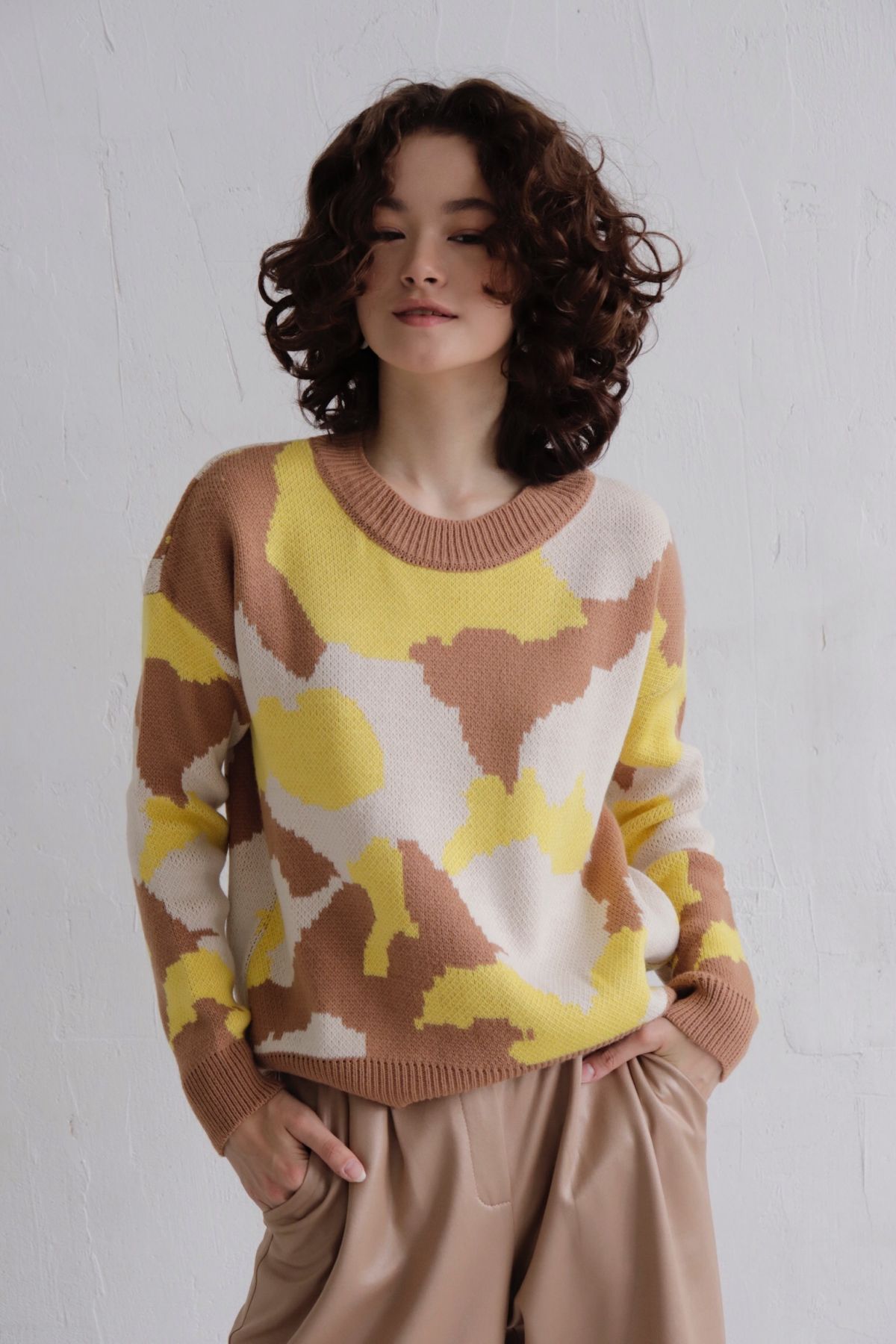 Джемпер свободного силуэта с длинными рукавами и спущенной линией плеча. Вырез горловины округлый, по низу изделия и рукавов вывязана широкая резинка.