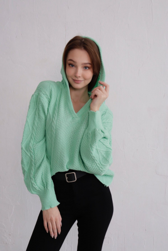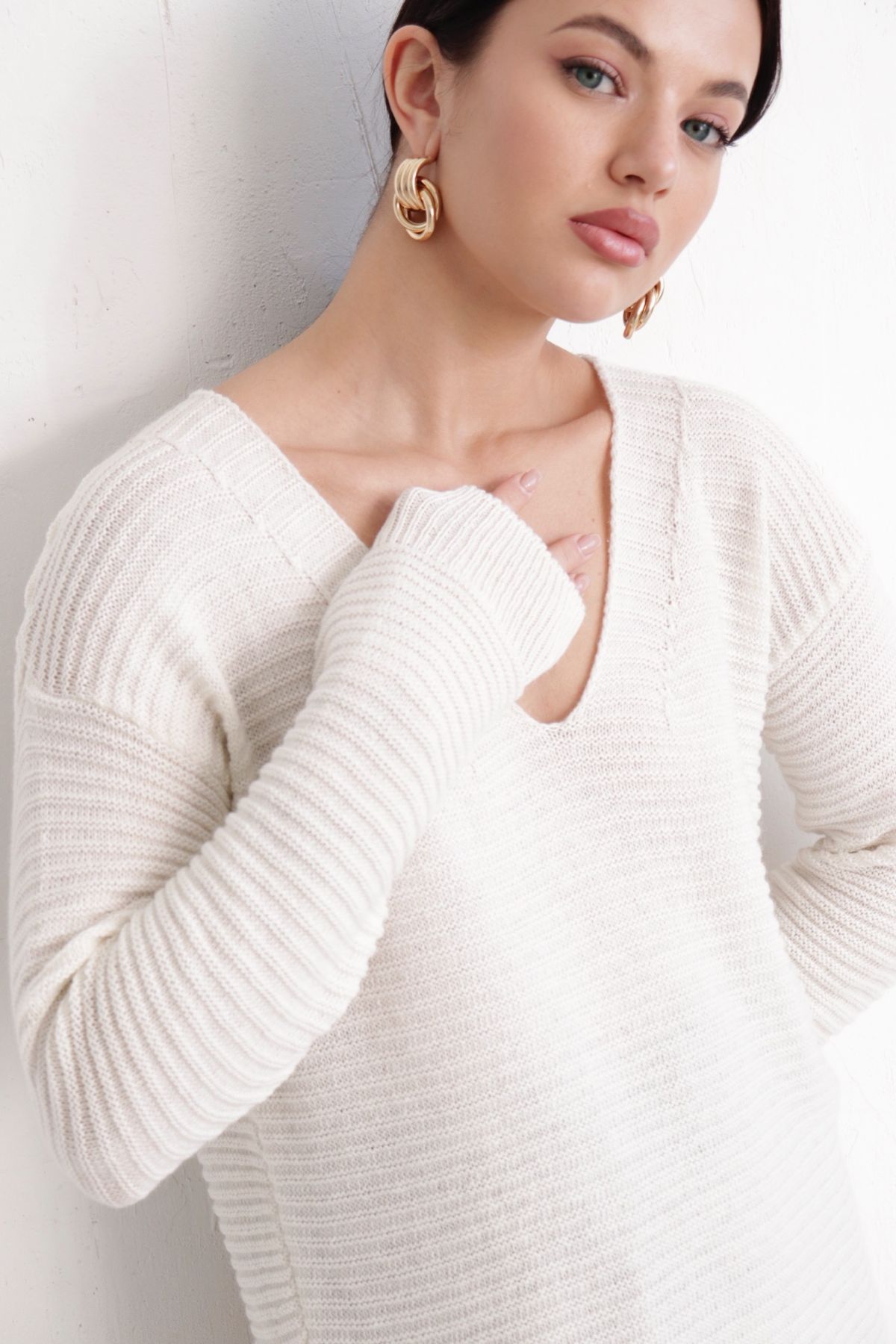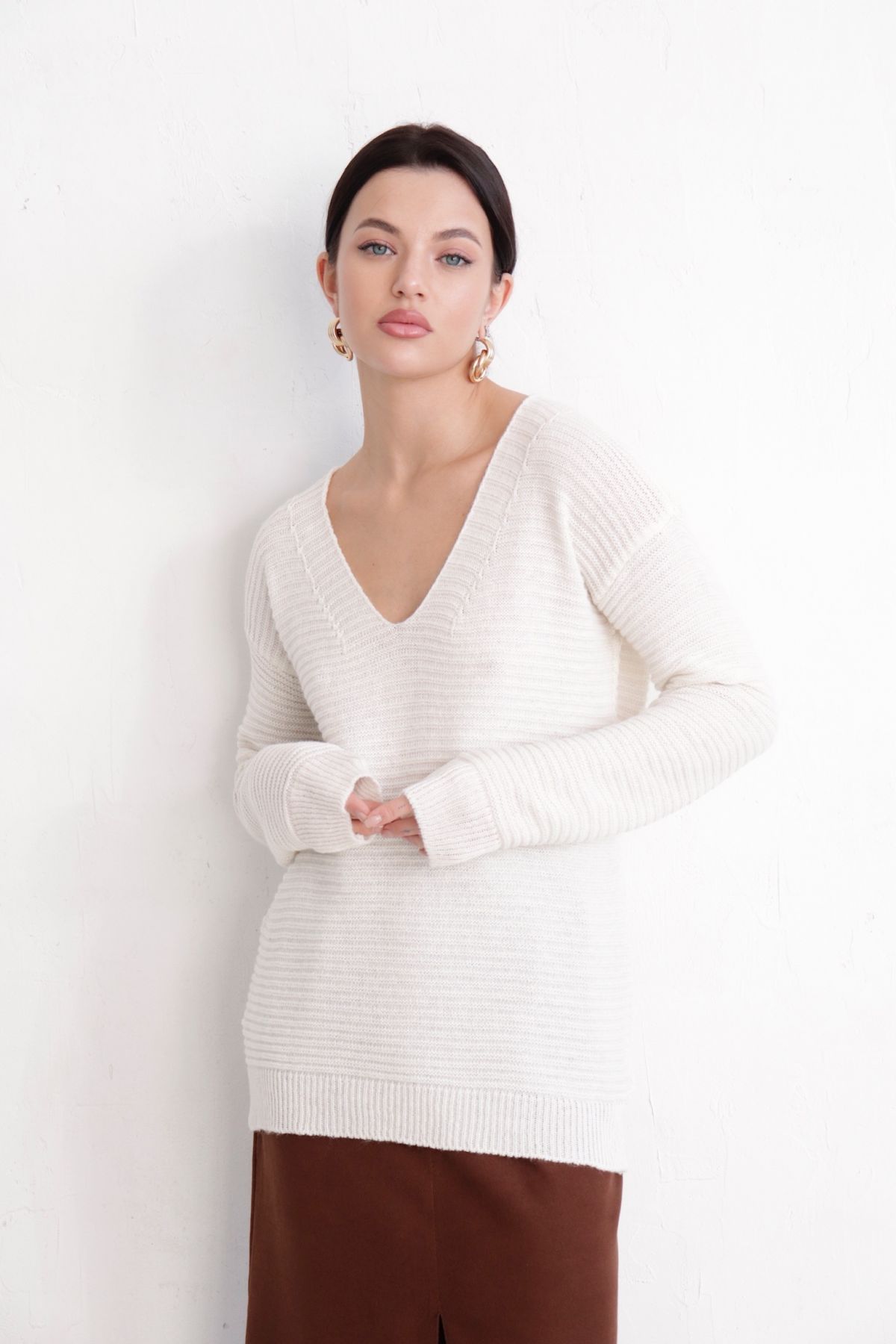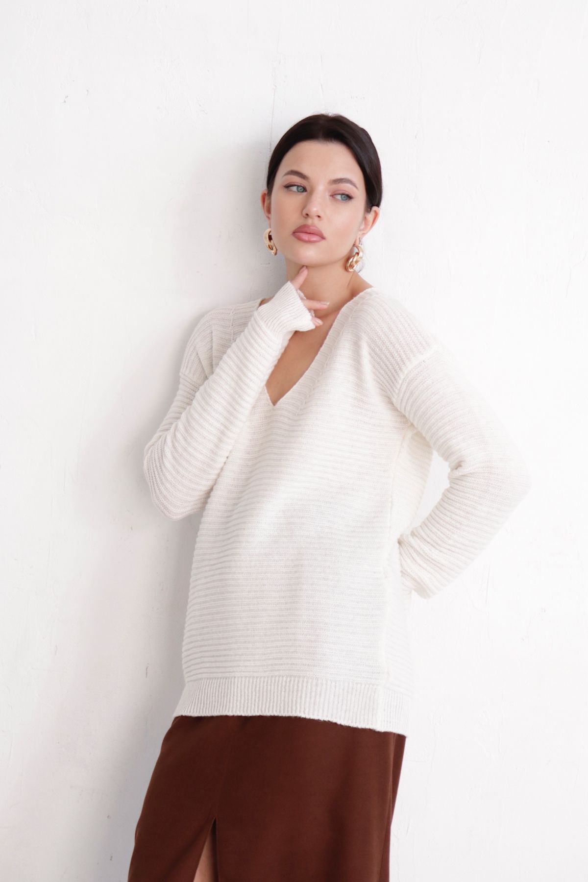 Пуловер прямого силуэта с рельефным горизонтальным узором. Вырез горловины V-образный, рукава длинные со спущенным плечом.
