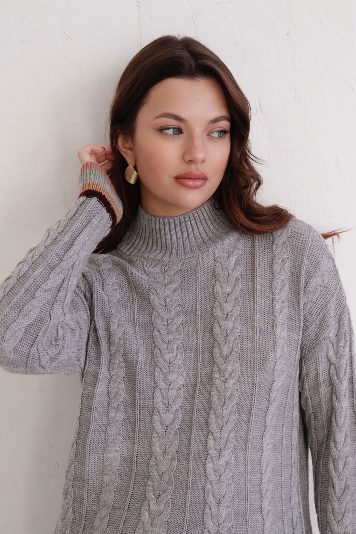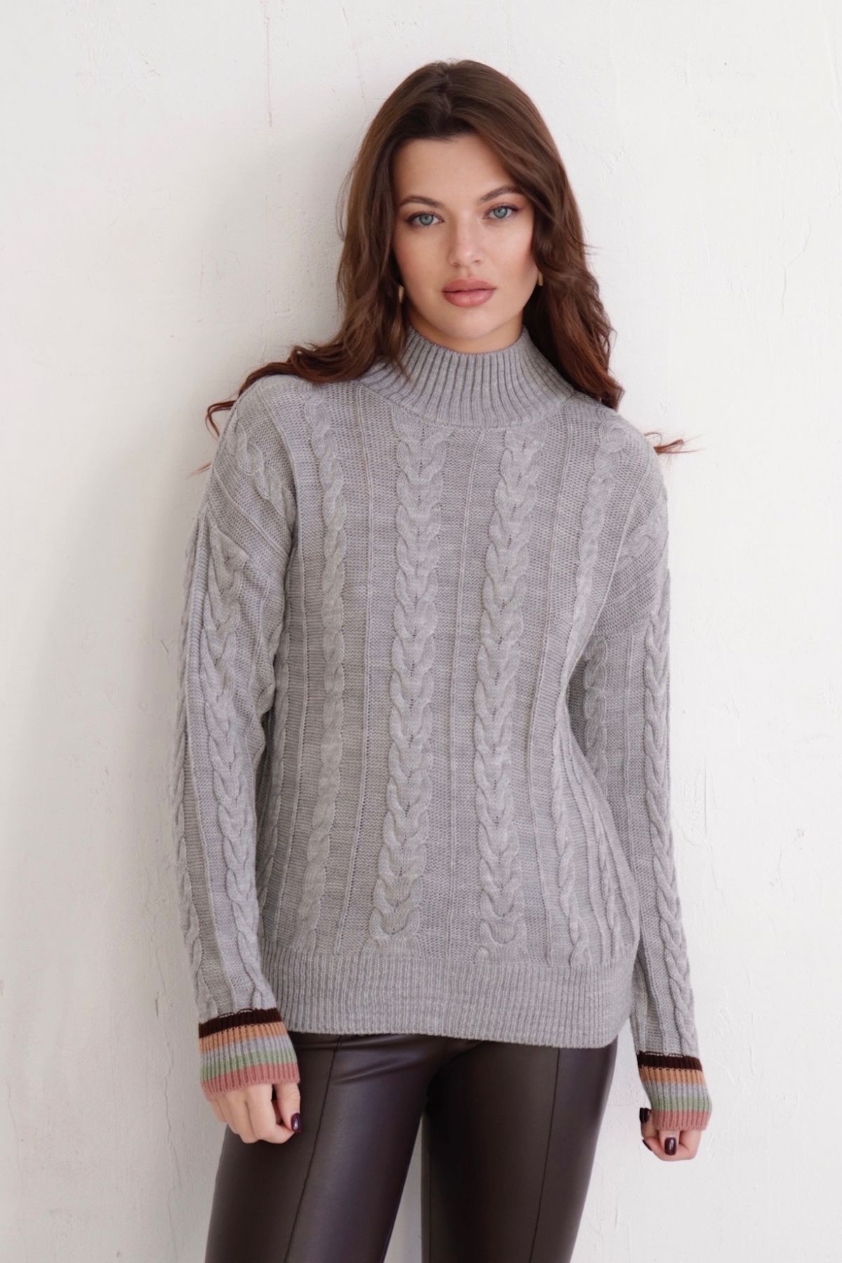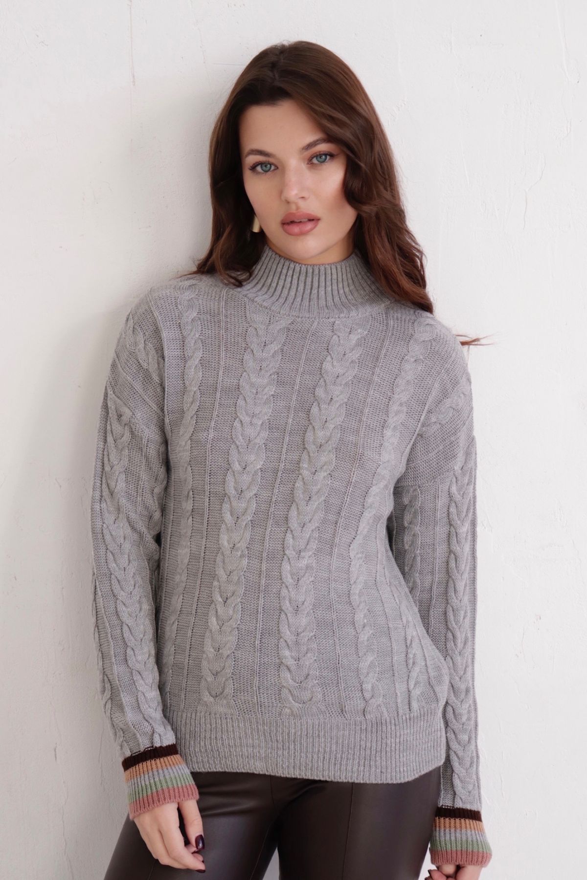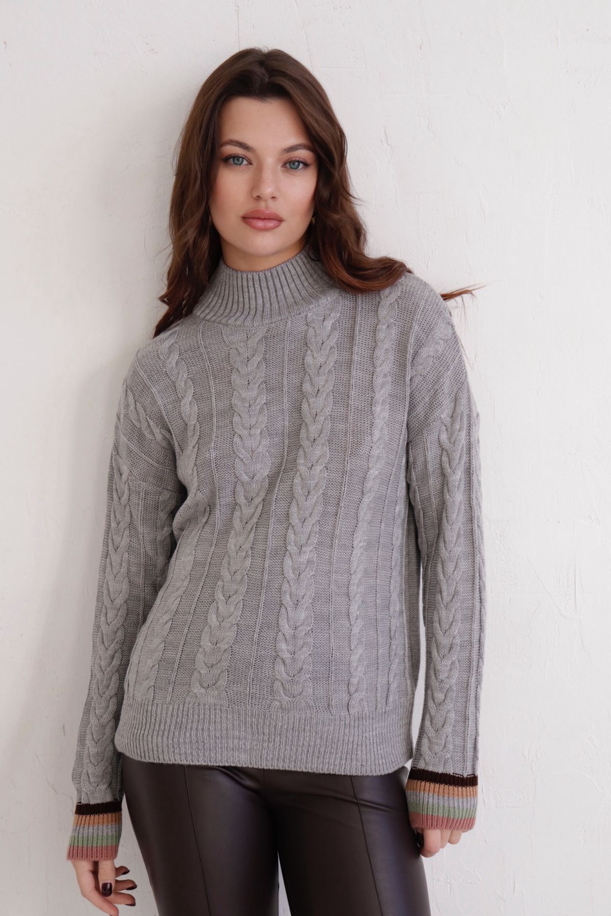 Свитер прямого силуэта связан узором из кос. Рукава длинные со спущенным плечом и цветными полосками на манжетах. Высокий воротник-стойка.