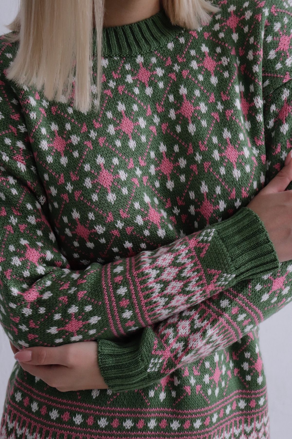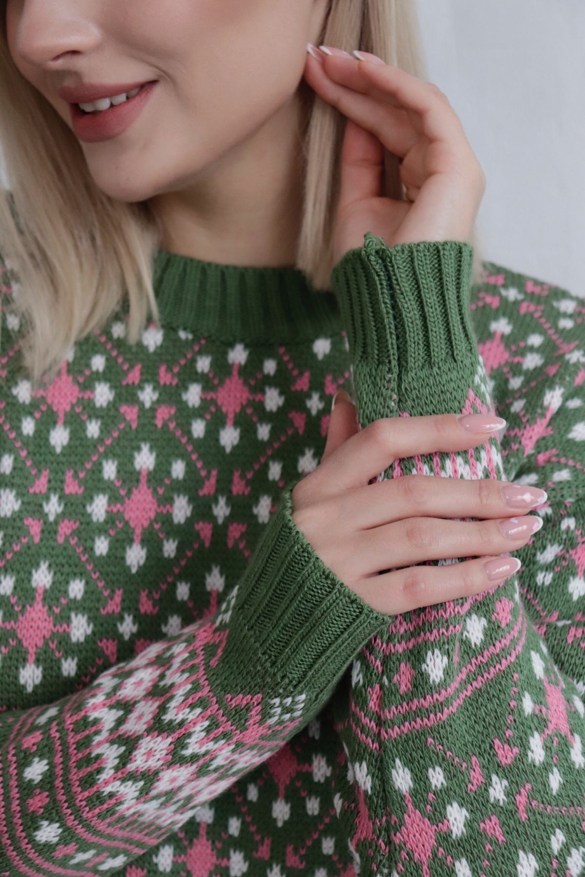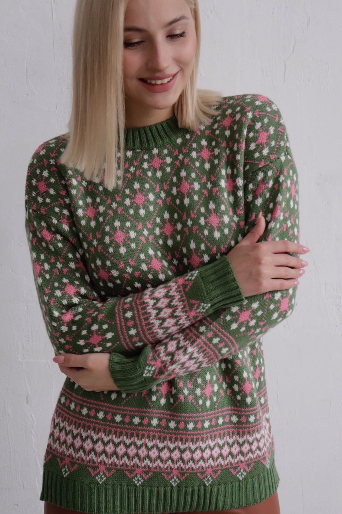Джемпер с разноцветными узорами в виде ромбов. Рукава со спущенным плечом, вырез горловины округлый.