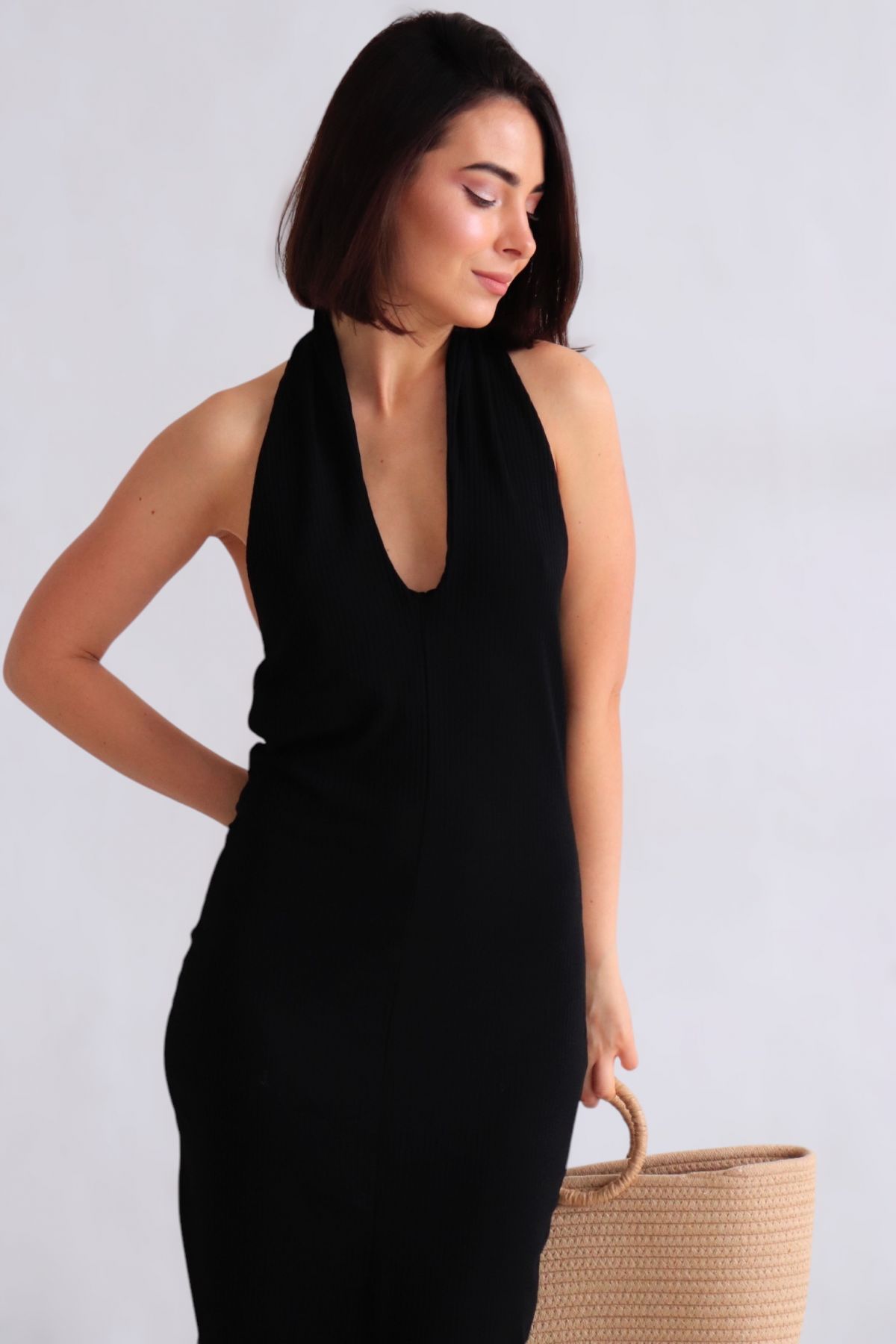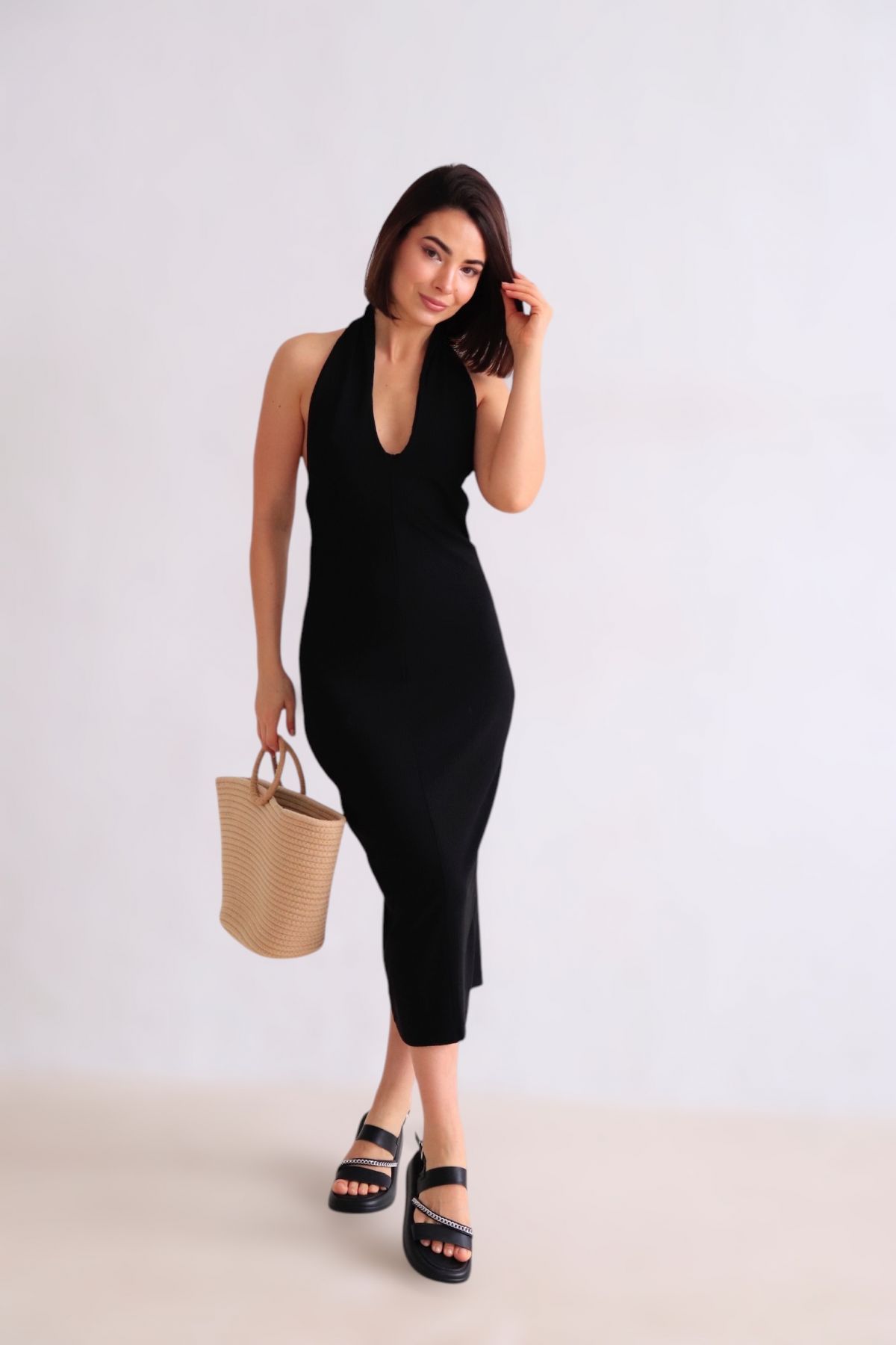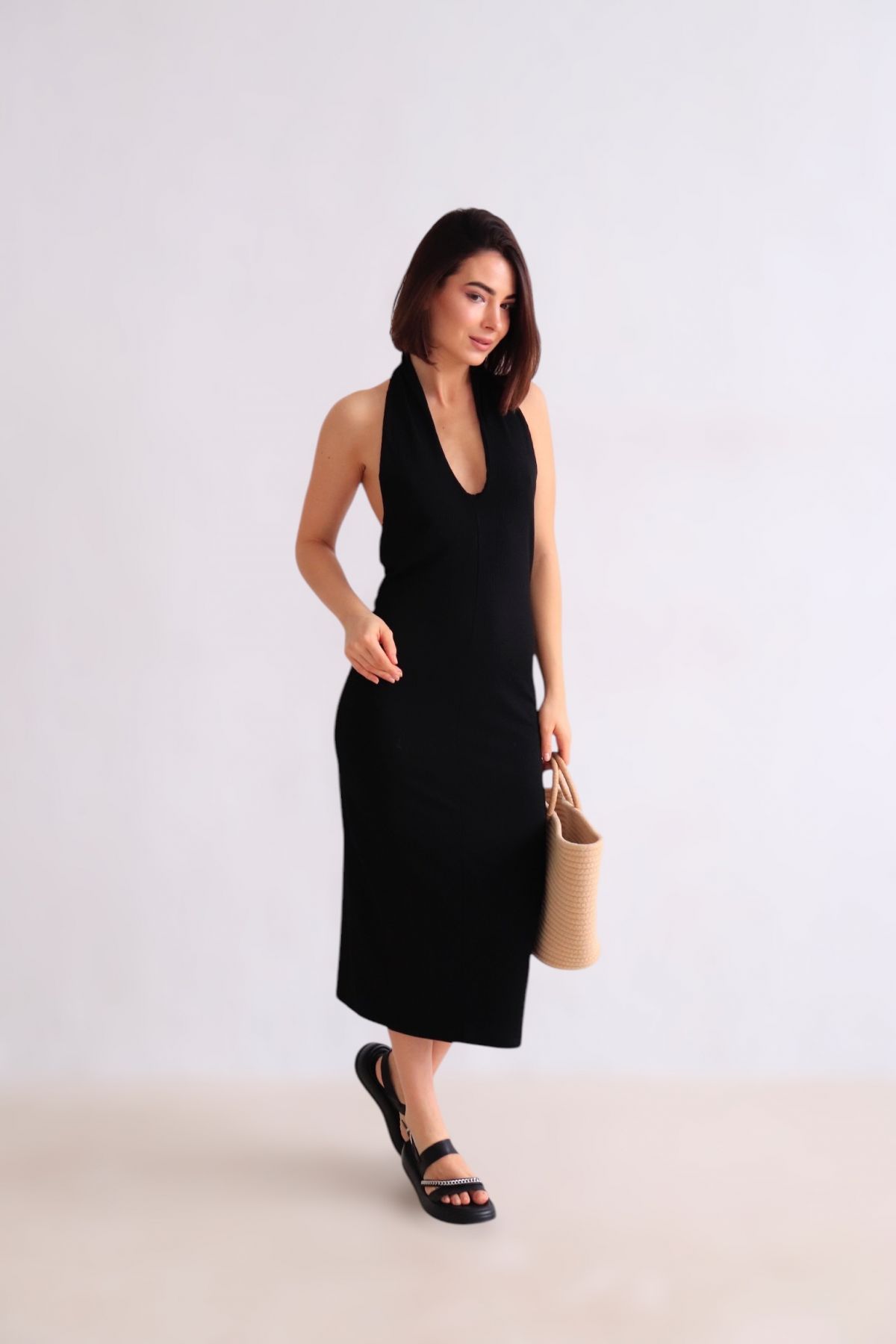 Платье прилегающего силуэта длины "миди". Модель открытая, с бретелью-петлёй через шею.