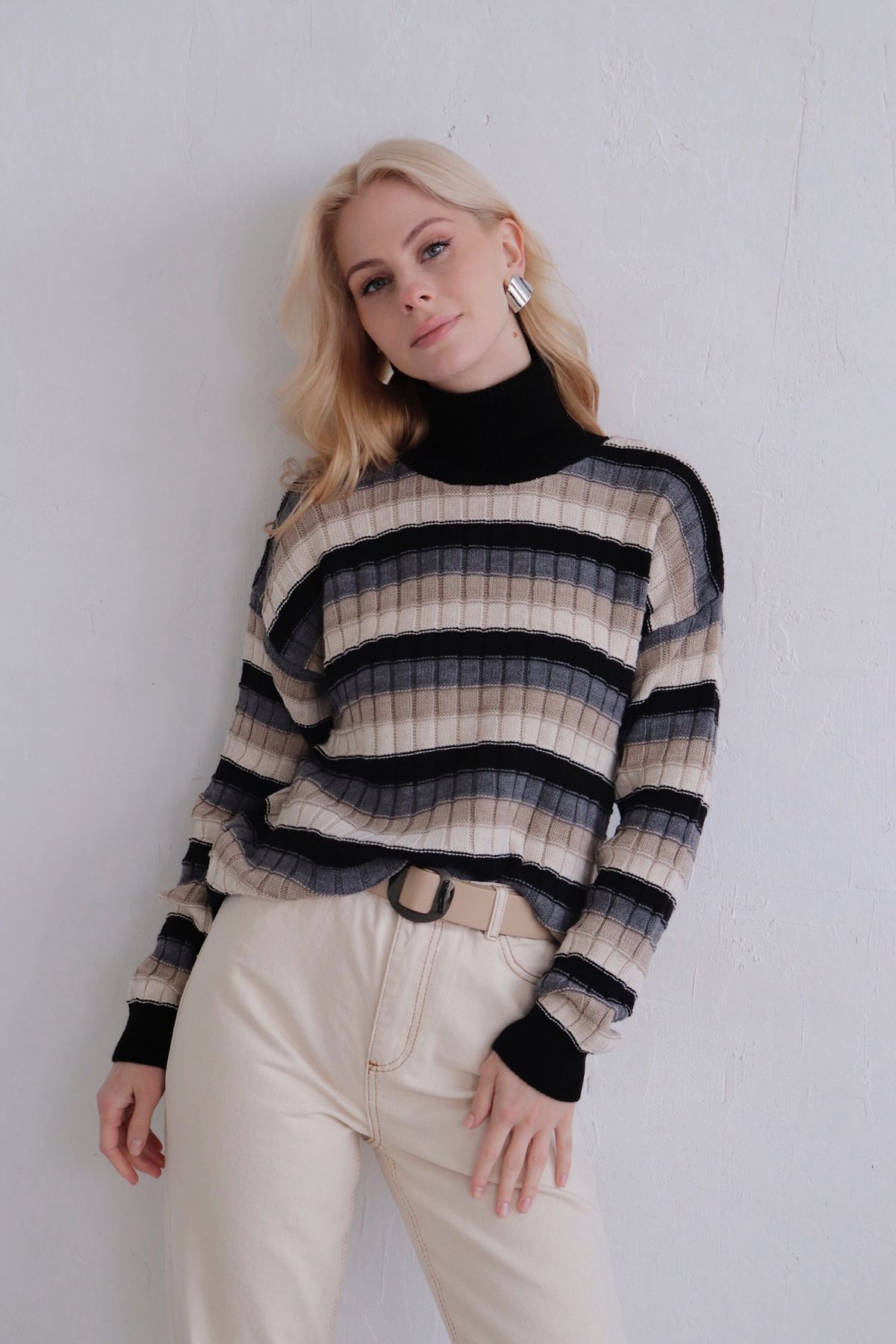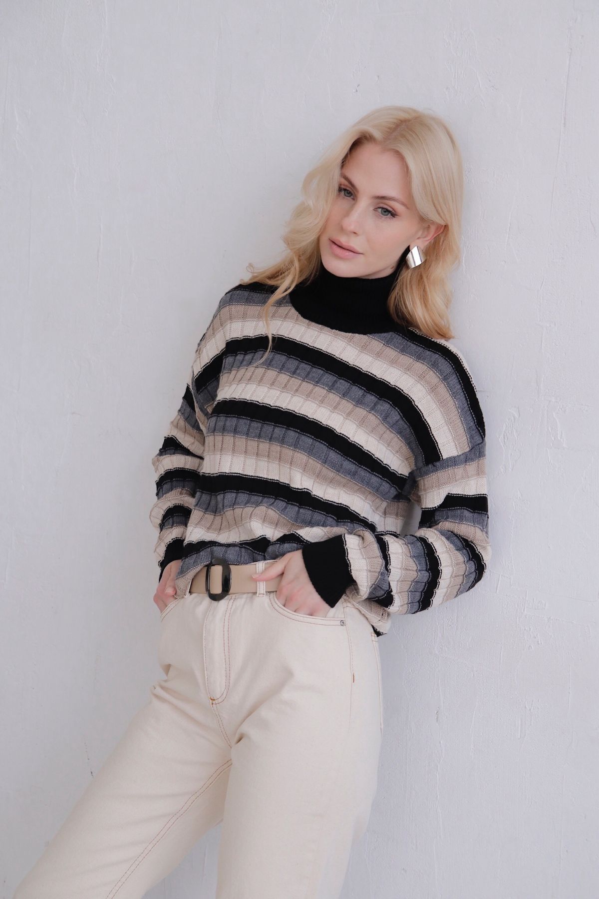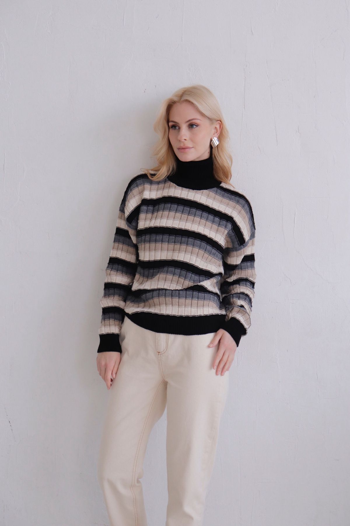 Свитер в полоску с нюансными переходами цвета. Силуэт свободный, рукава со спущенной линией плеча, высокий воротник с отворотом.