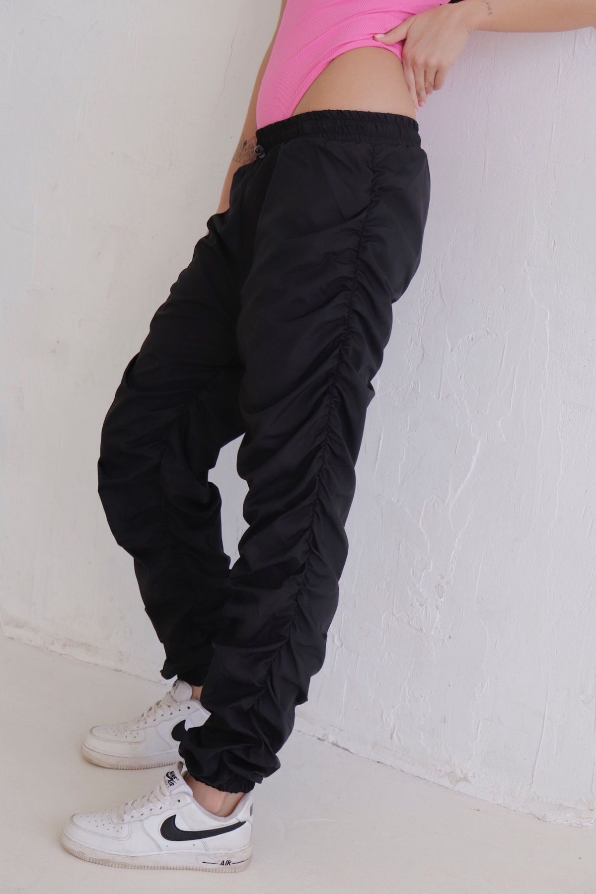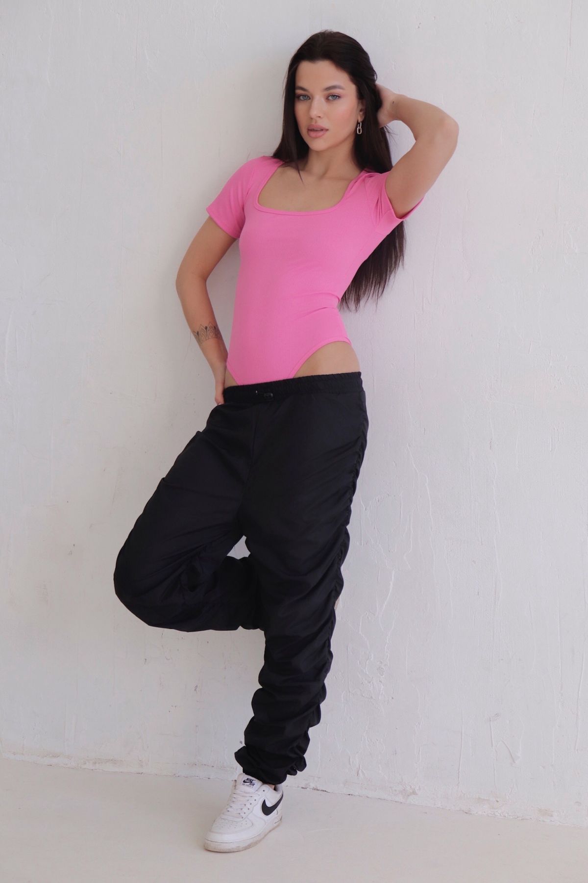 Брюки-джоггеры на поясе с широкой комфортной резинкой. Брюки со сборкой по боковым и шаговым швам, штанины внизу с манжетами на резинке.