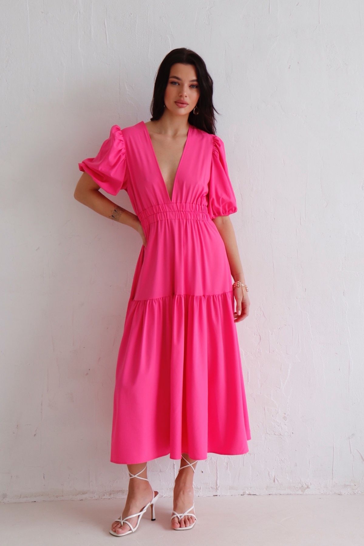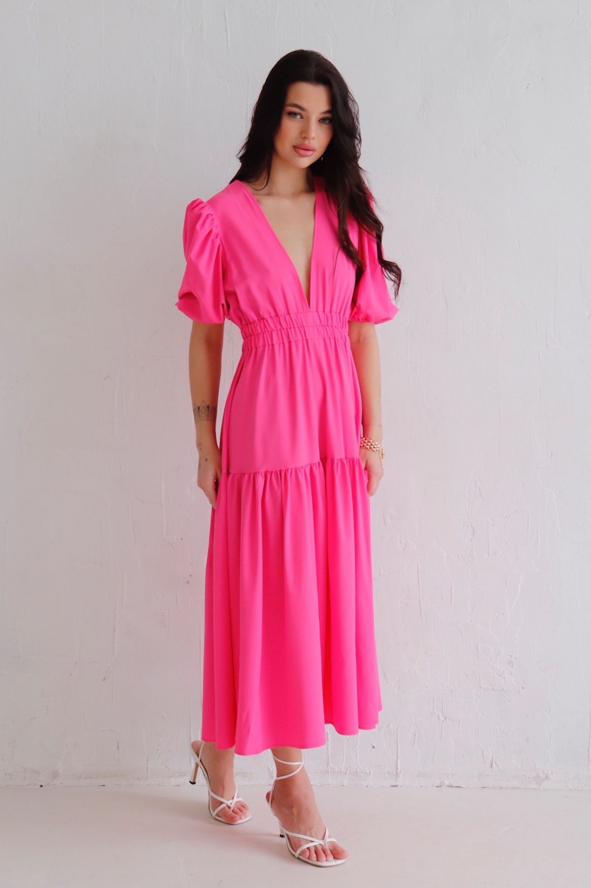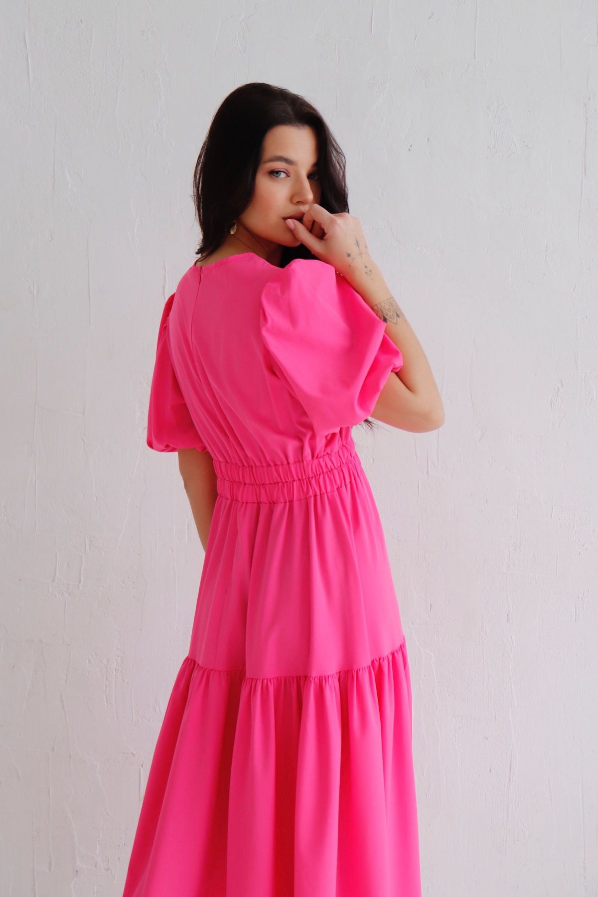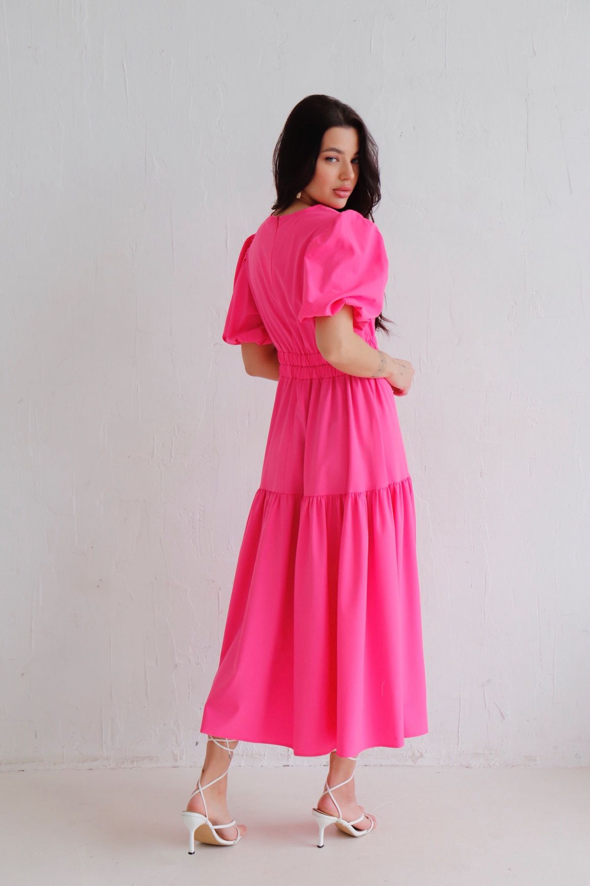 Длинное платье, отрезное по талии. Лиф с глубоким V-образным вырезом и объёмными рукавами-фонариками. Юбка из двух ярусов. По линии талии втачаны широкие эластичные резинки.