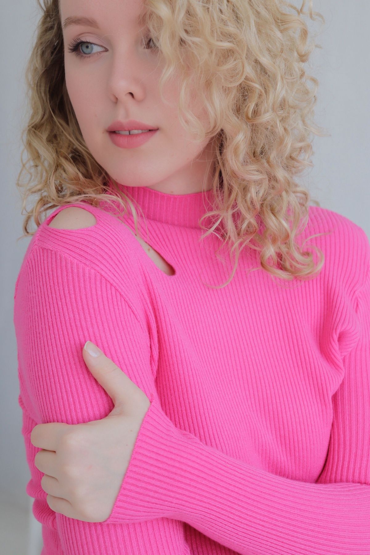 Облегающая фигуру водолазка в рубчик с вырезами на плече.
